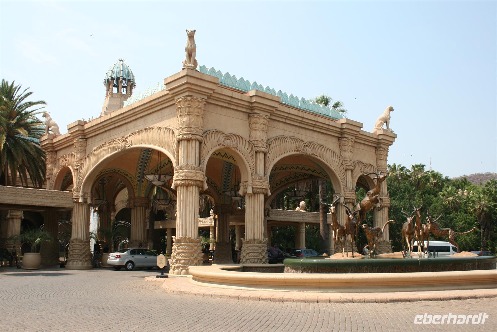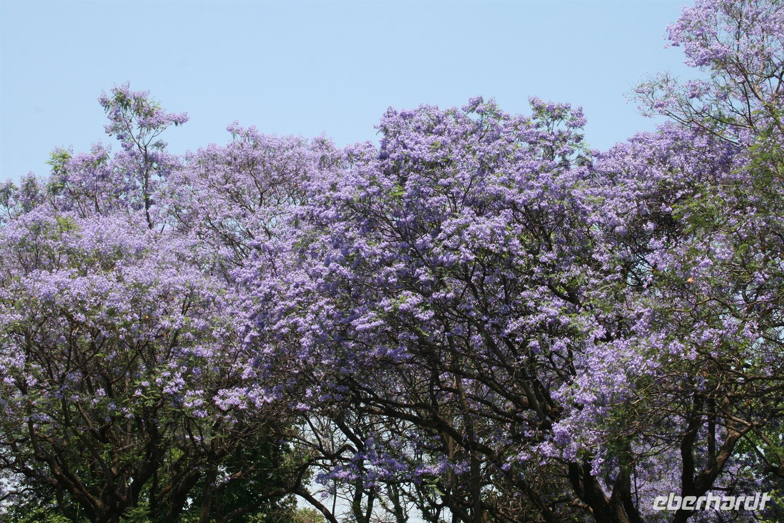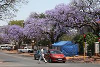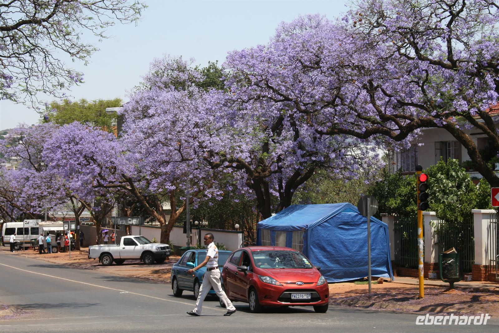 Heute morgen fuhren wir zeitig zum Flughafen, denn wir wollten eine neue Station unserer Weltreise kennen lernen: den Pilanesberg-Nationalpark. Dazu verabschiedeten wir uns zuerst ein wenig wehmütig von unserer Reiseleiterin Andrea und erreichten nach einem sehr angenehmen Flug Johannesburg. Da wir etwas Zeit hatten, legten wir einen Stopp in Pretoria ein und staunten über die leuchtenden Jacaranda-Bäume! Toll, dass wir dieses Blütenmeer verewigen konnten. Am Nachmittag erreichten wir dann unsere schöne Bakubung Game Lodge, die wunderbar zum Erlebnis „Safari“ passt. Wobei diese heute nicht so ganz nach un- seren Vorstellungen ablief. Schon auf der Fahrt hatte uns unser Reiseleiter erzählt, wie trocken alles ist und wir sehnlichst Regen gewünscht wird. Ja heute war der Tag, wo der große Regen kam. Wir fuhren noch im Trockenen los, sahen dann aber bald die dunklen Wolken heran ziehen. Unser Fahrer brachte uns zu einem Unterschlupf, da auch er nur auf ein heftiges, aber kurzes Gewitter hoffte.