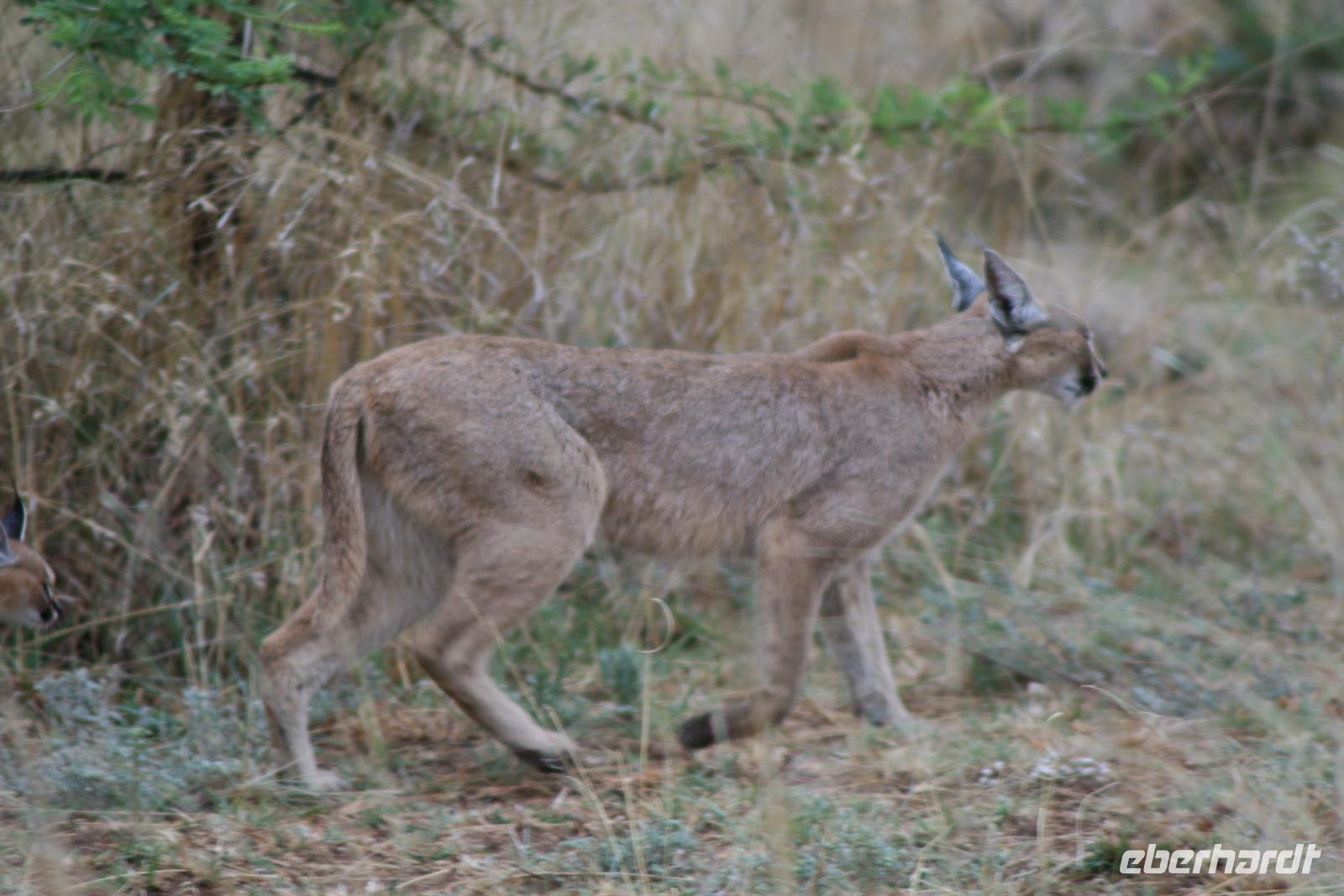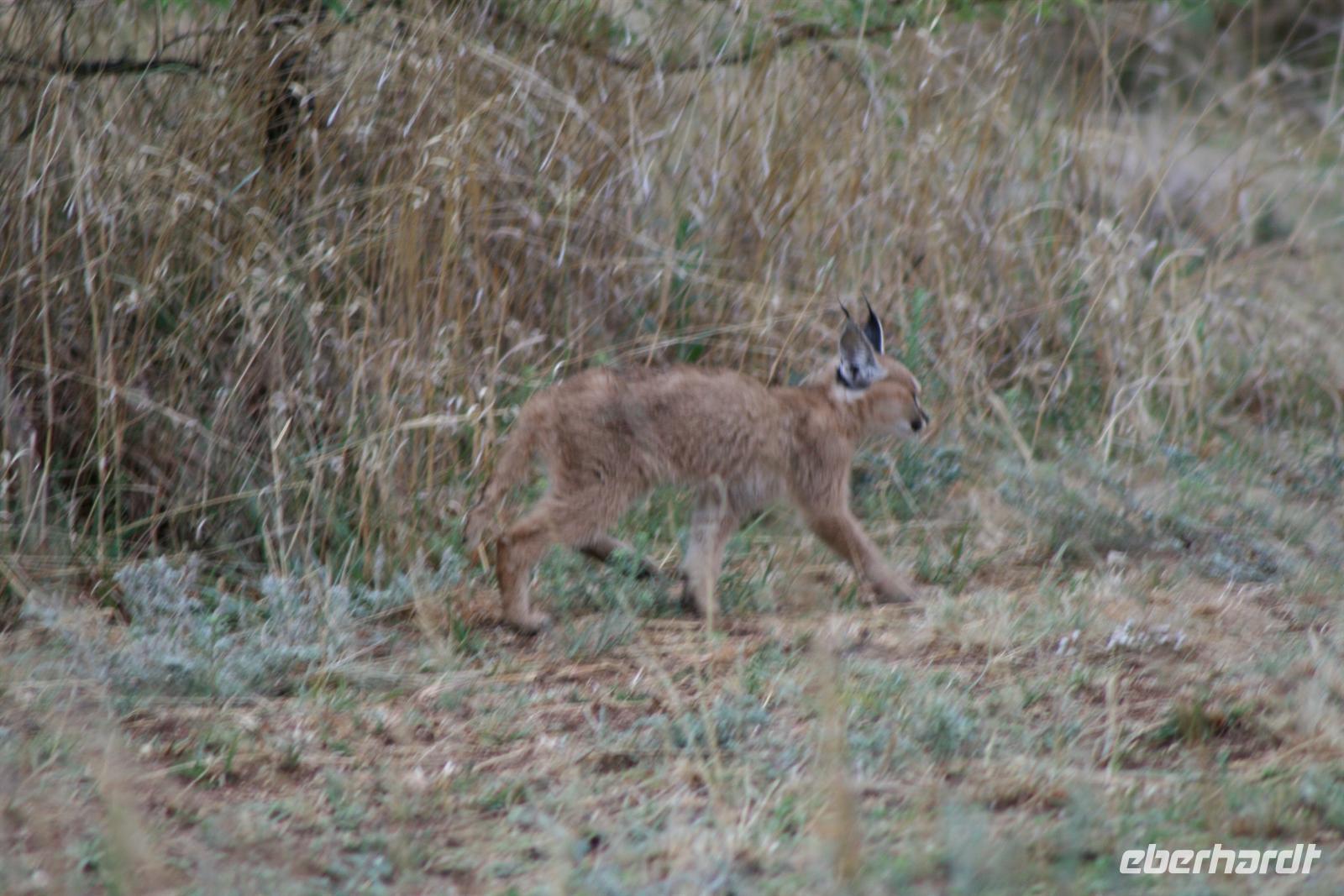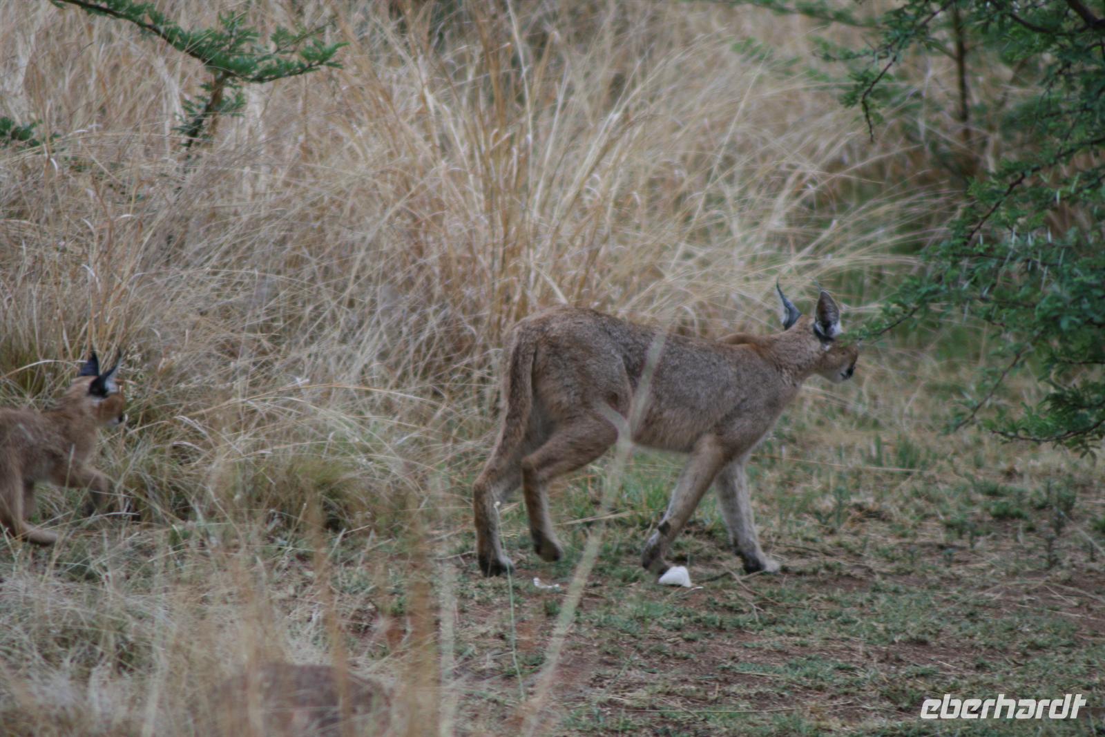 Heute ging es früh raus - denn wir wollten ja möglichst viele Tiere auf unserer Safari sehen, und diese sind morgens und abends am aktivsten. Halb sechs saßen wir gespannt in unserem Geländewagen und freuten uns, dass zumindest das Gewitter und der Regen von gestern Abend abgezogen waren. Die erste Stunde passierte nichts, einige verloren vielleicht schon den Glauben an eine erfolgreiche Safari und dann nach ein paar einzelnen Zebras, Gnus und Impalas entdeckte einer unserer Gäste neben unserem Weg eine Luchs-Mama mit ihrem Nachwuchs - welch eine Seltenheit! Das Eis war gebrochen.