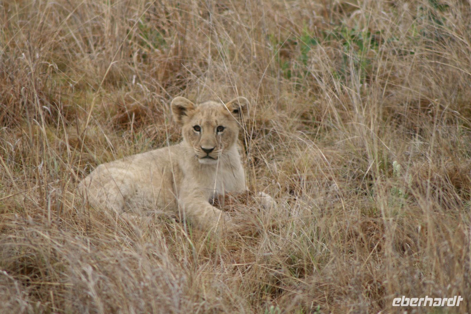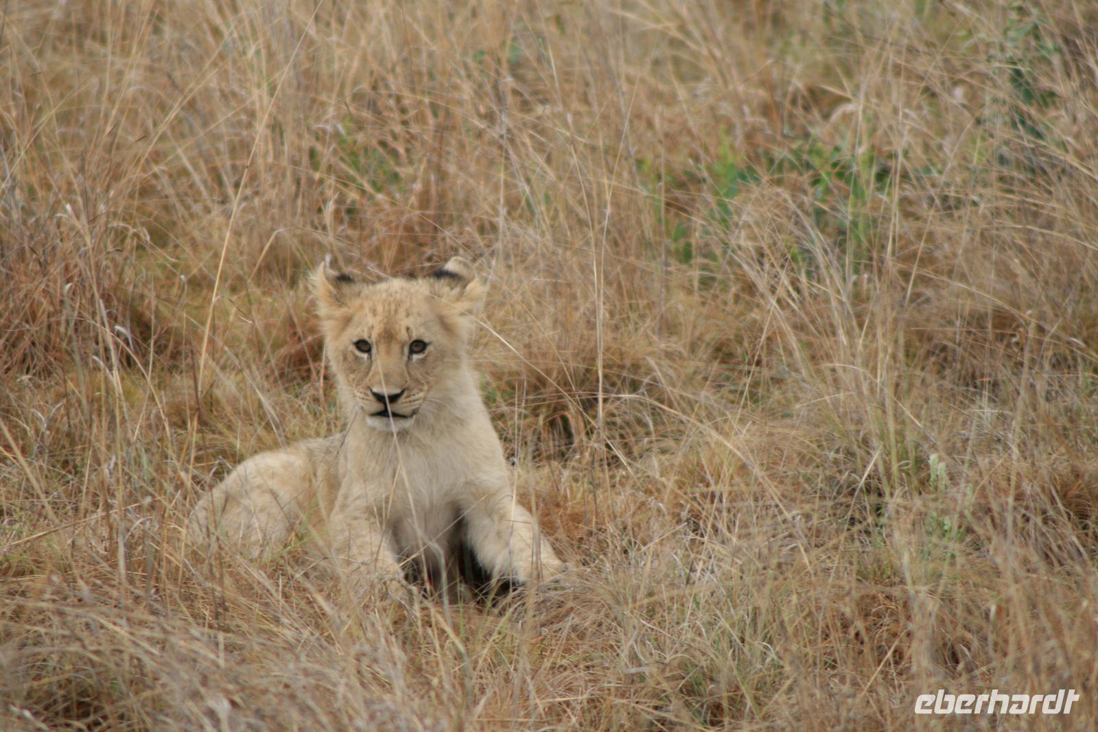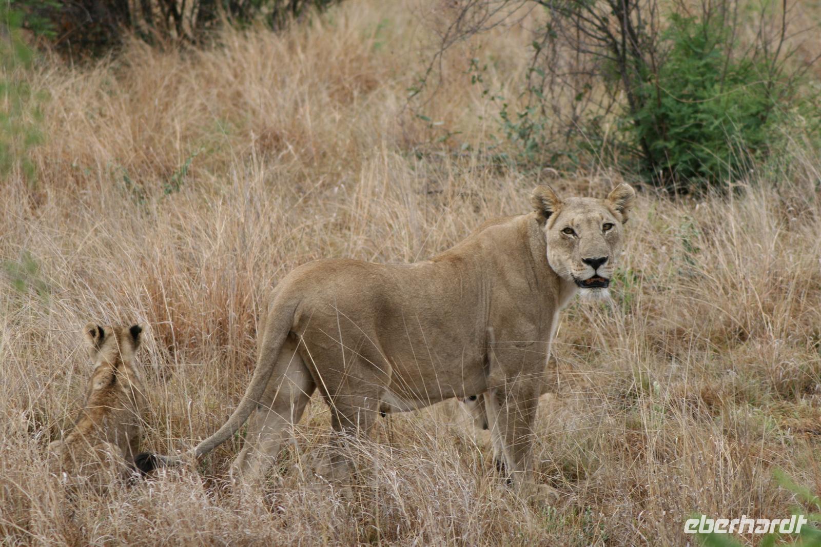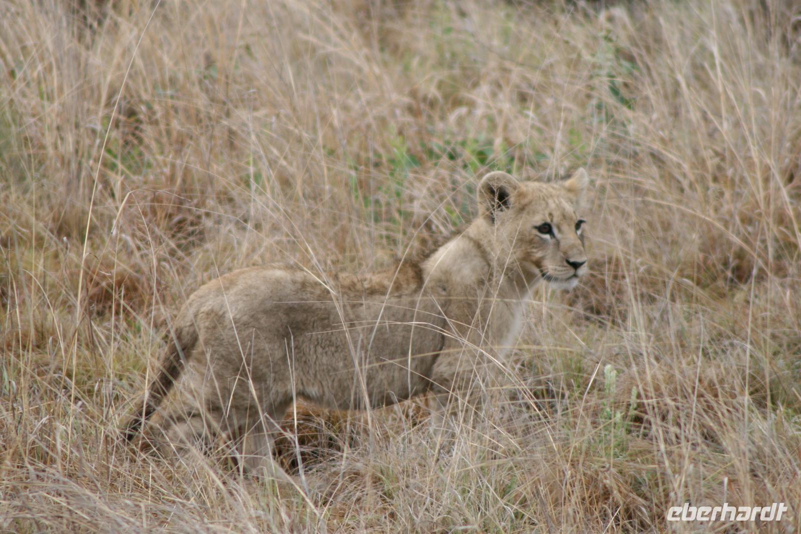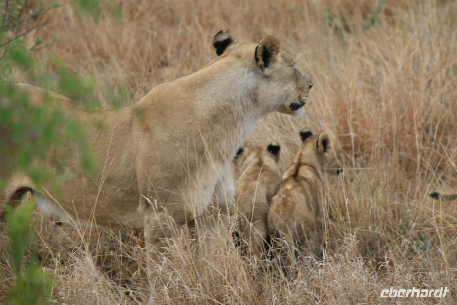 Nun erhielt unserer Fahrer eine Meldung, dass in der Nähe Löwen zu sehen seien. Nach einigen Umwegen erspähten wir sie dann tatsächlich: eine Gruppe aus 3 Weibchen, 2 Männchen und 3 Kleinen, die ca. 2 Monate alt waren. Wir bekamen nicht alles vor die Linse, aber es sind tolle Fotos entstanden. Wir mussten uns immer wieder zur Ruhe zwingen - denn aufregend war das Ganze ja schon - aber die Weibchen sind während sie Nachwuchs haben, sehr aggressiv und ich wollte doch keinen meiner Gäste als Löwenfrühstück sehen .