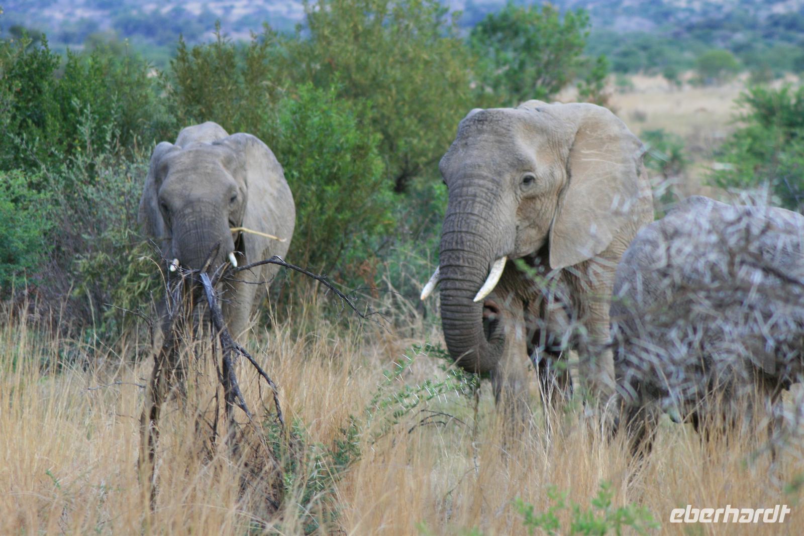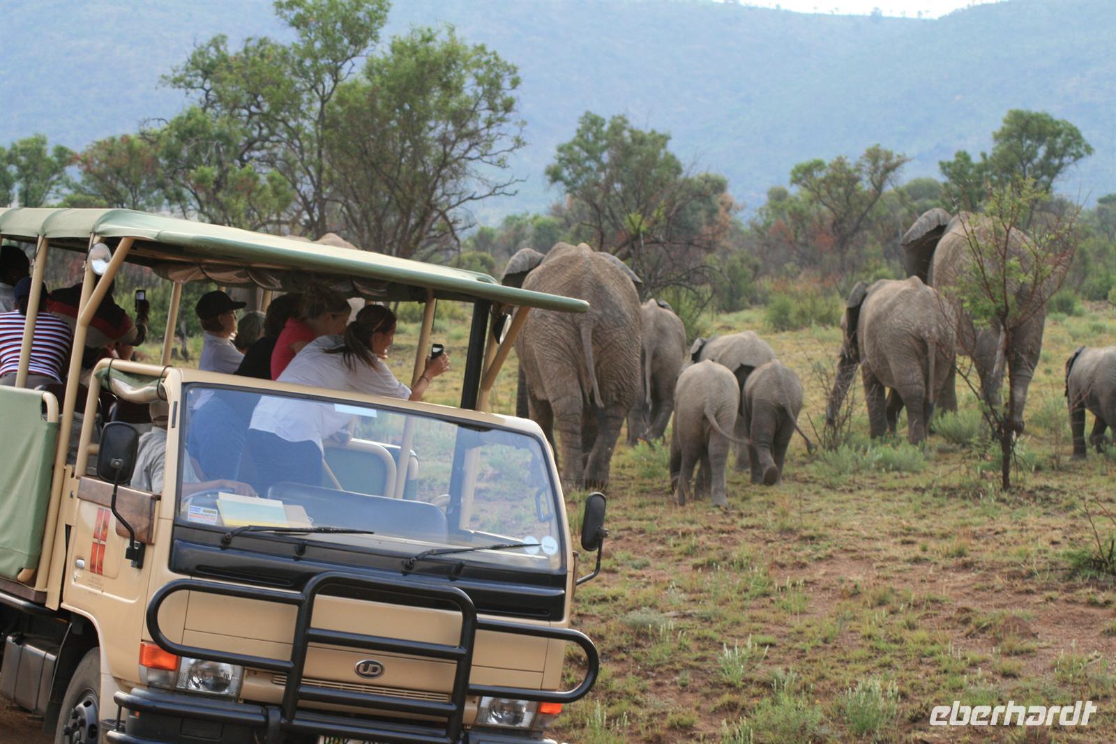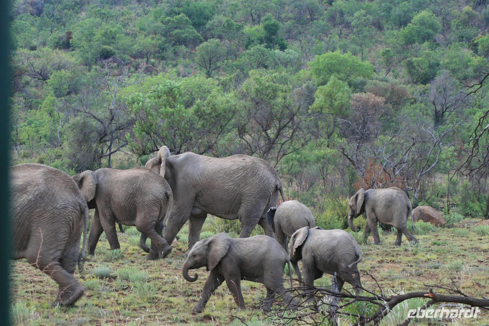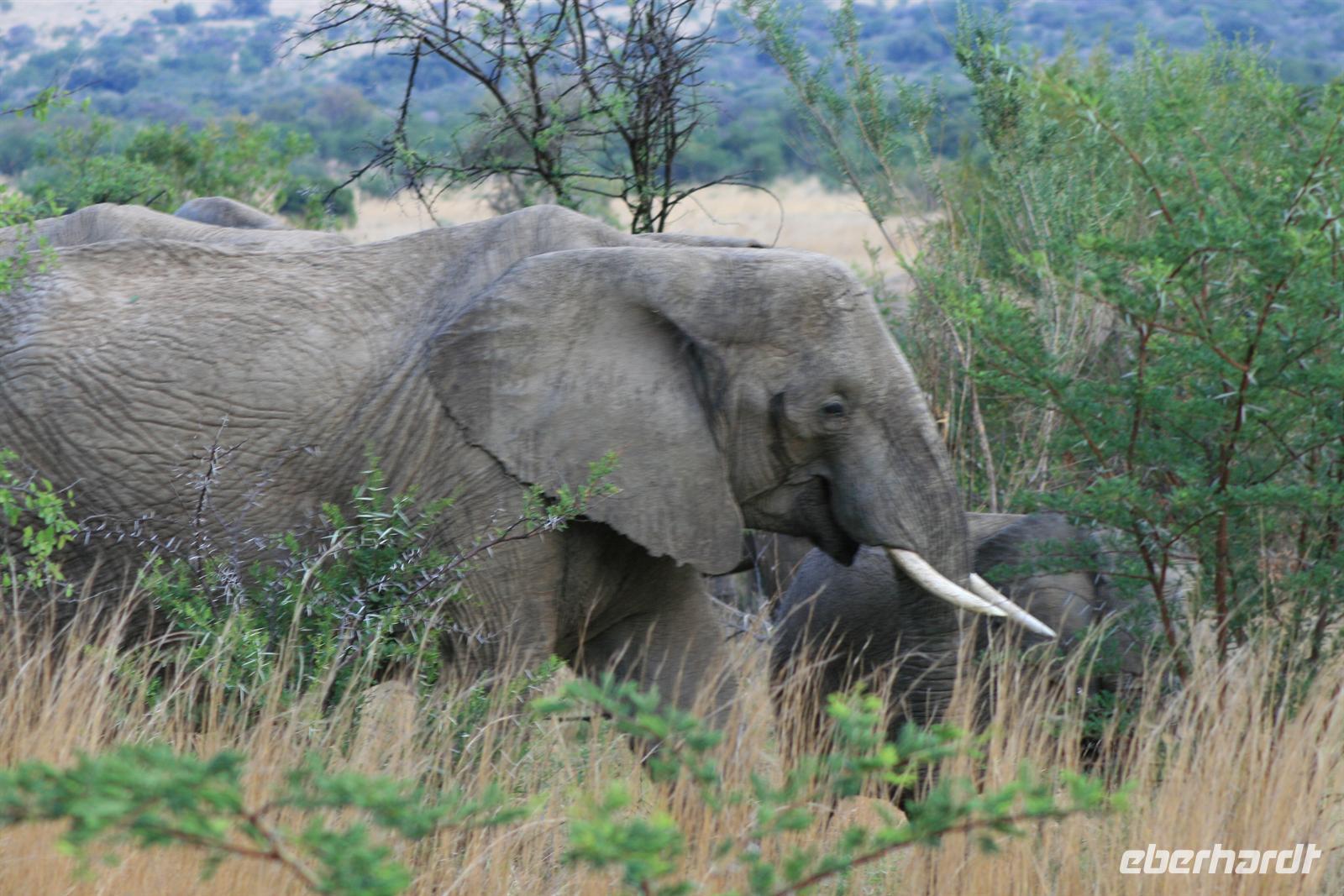 Nun waren wir schon sehr zufrieden und gaben unserem Fahrer auf dem Heimweg nur noch die Instruktion für Elefanten, Giraffen und Nashörner bei der Nachmittags-Safari. Und unser Wunsch war ihm Befehl! Wir sahen am Nachmittag Giraffen, Spitzmaul-Nashörner und Elefanten. Und wie wir diese sahen! Zuerst ein wenig versteckt beobachteten wir die riesige Herde, dann legten wir eine kurze Pause ein und kehrten wieder an diese Stelle zurück.