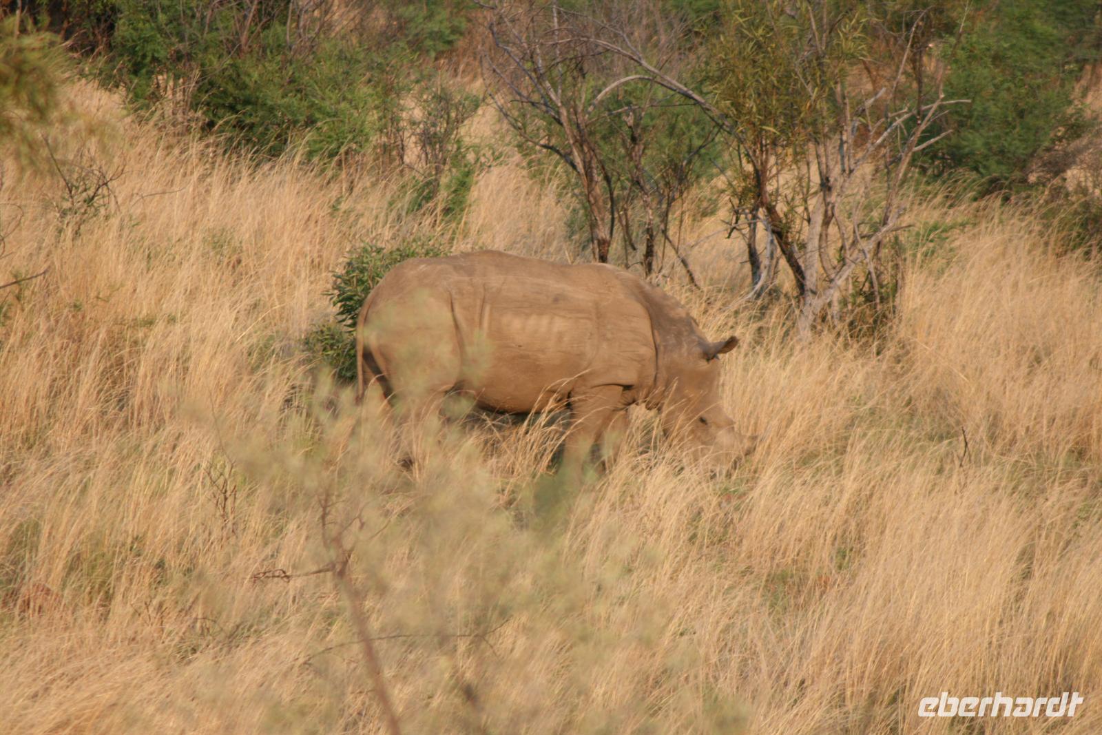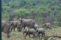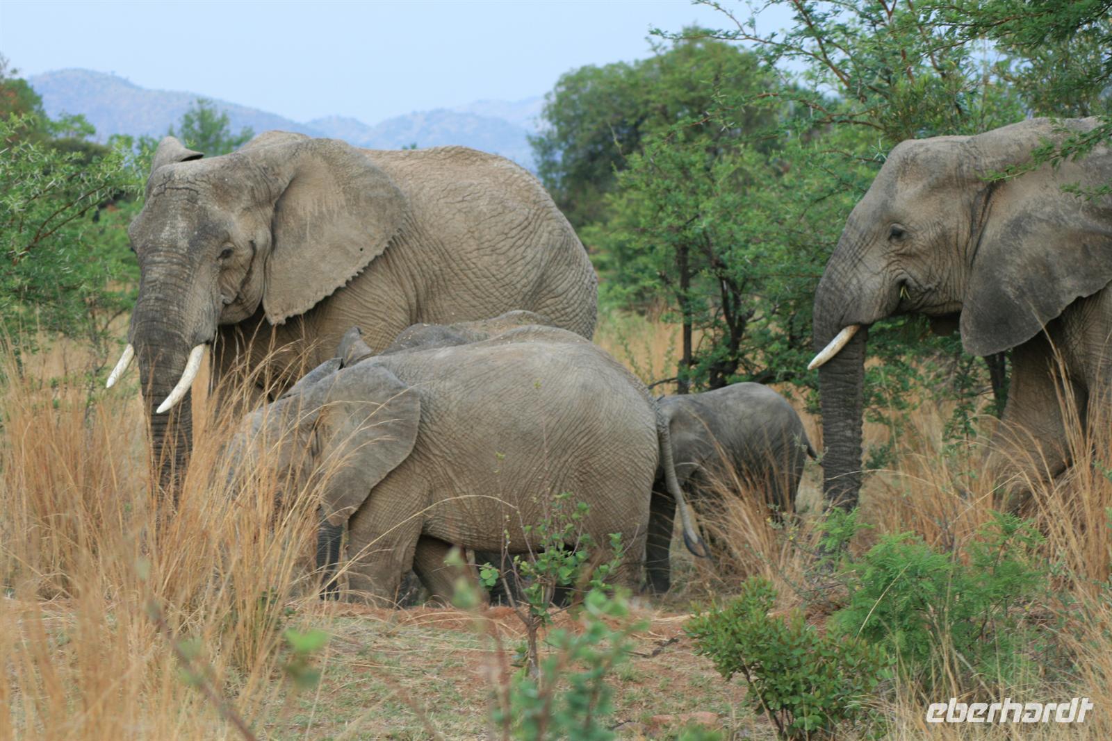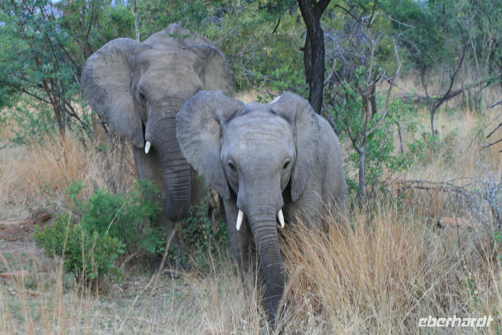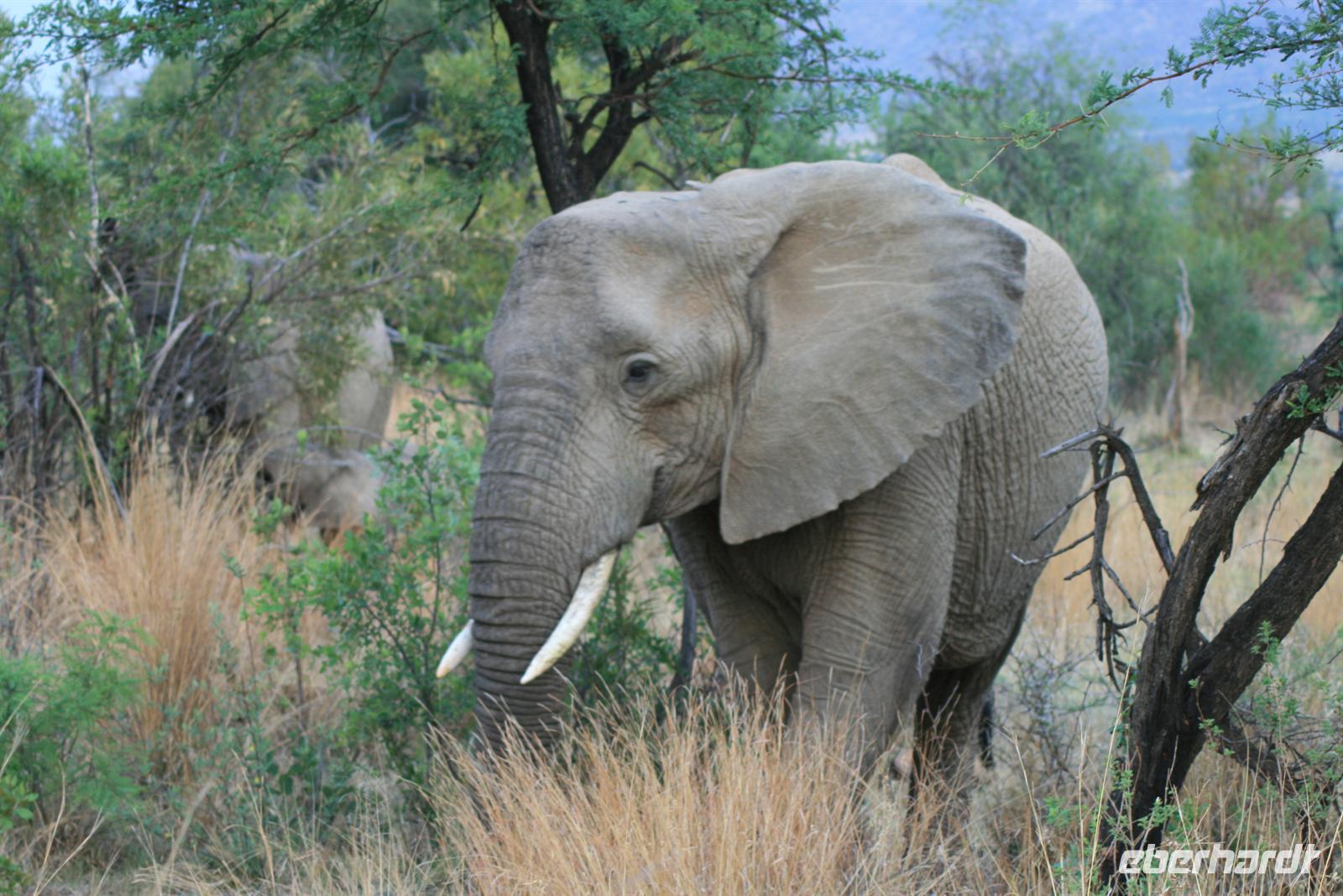 Nun waren wir schon sehr zufrieden und gaben unserem Fahrer auf dem Heimweg nur noch die Instruktion für Elefanten, Giraffen und Nashörner bei der Nachmittags-Safari. Und unser Wunsch war ihm Befehl! Wir sahen am Nachmittag Giraffen, Spitzmaul-Nashörner und Elefanten. Und wie wir diese sahen! Zuerst ein wenig versteckt beobachteten wir die riesige Herde, dann legten wir eine kurze Pause ein und kehrten wieder an diese Stelle zurück.