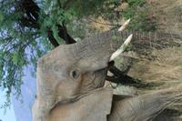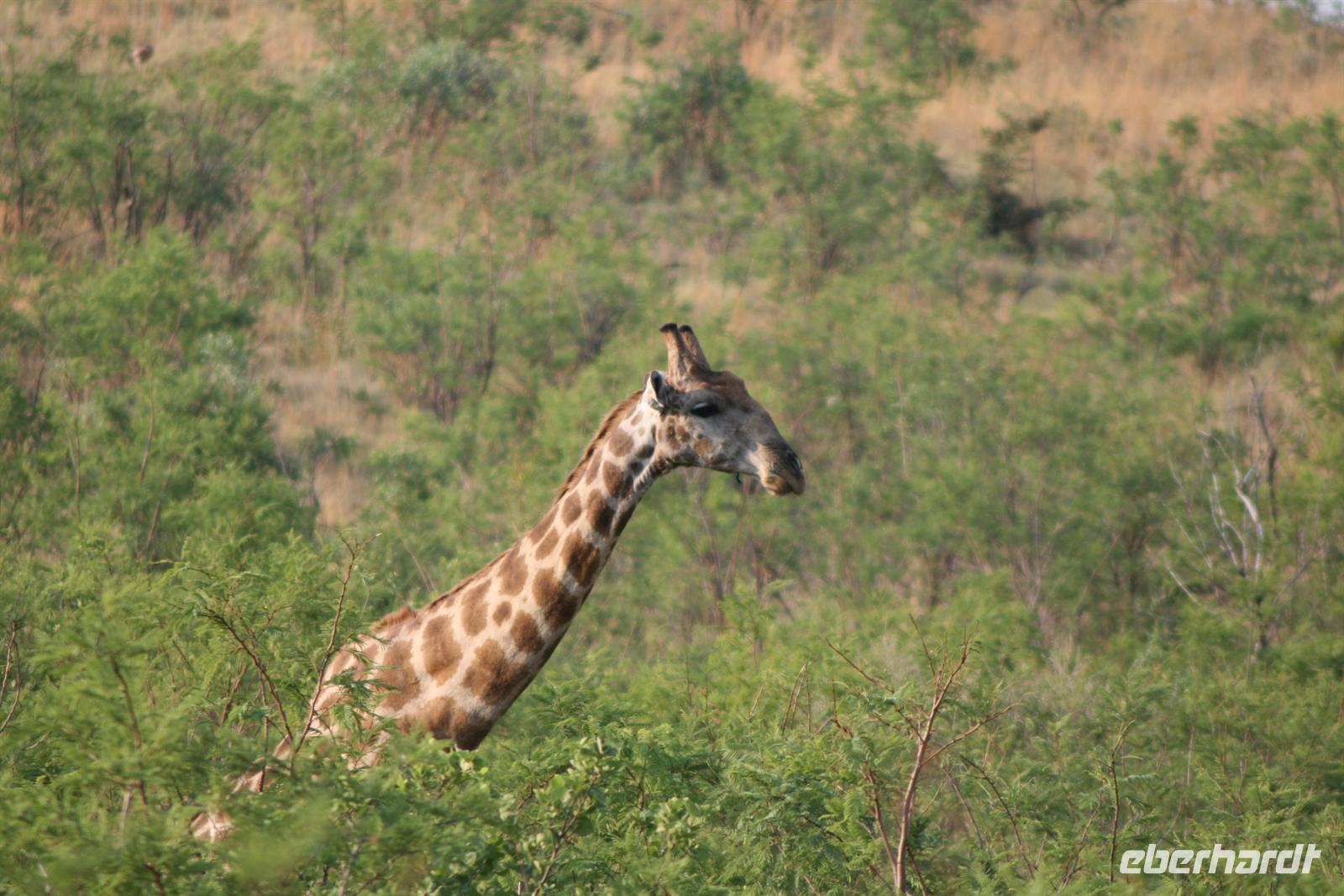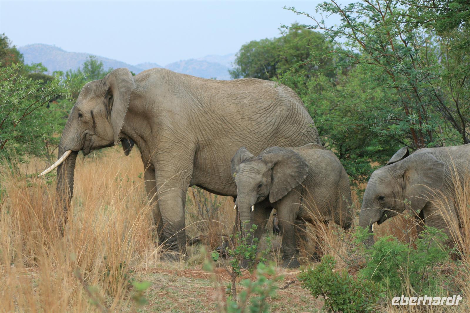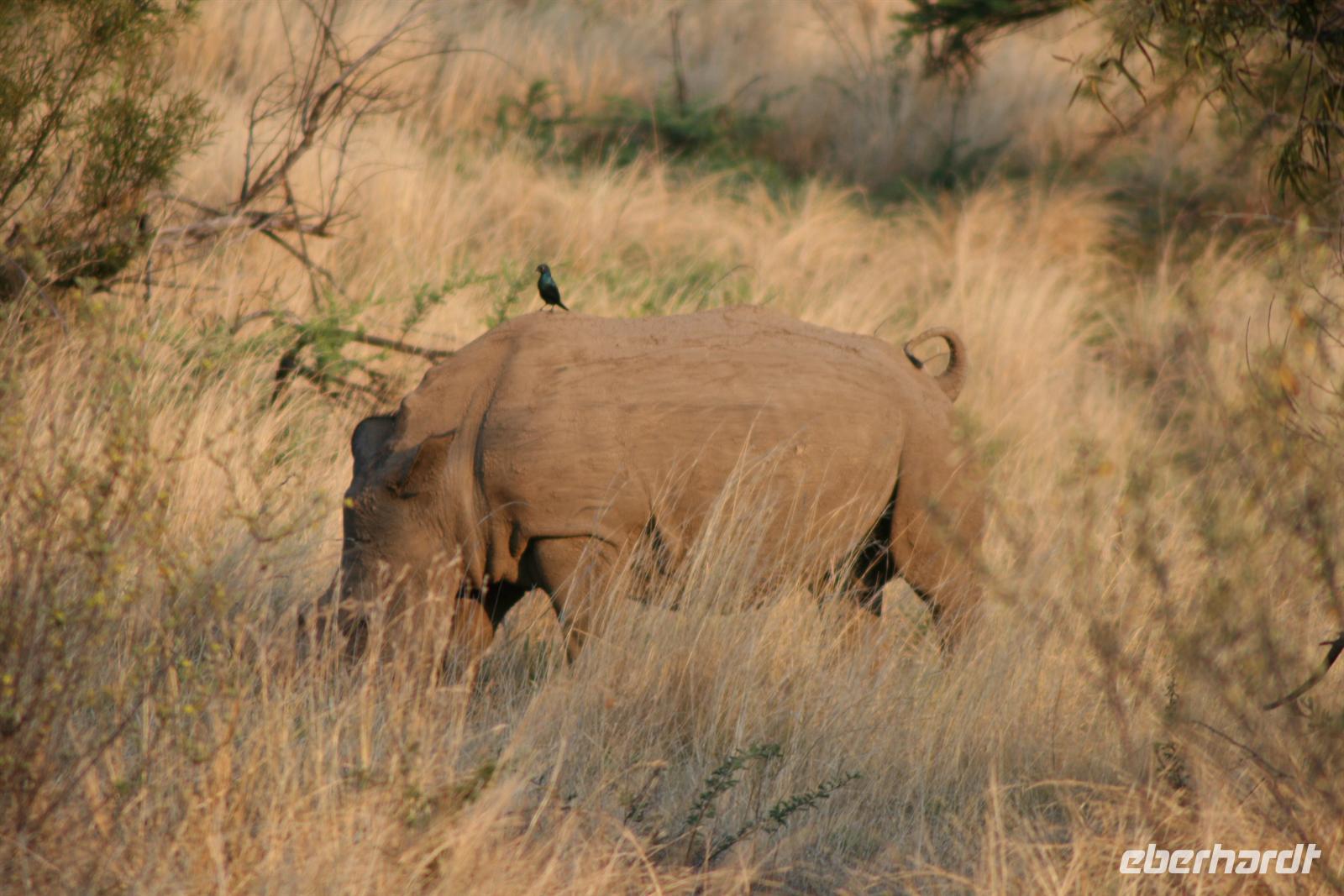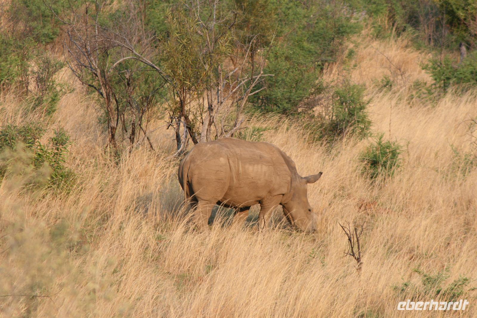 Nun waren wir schon sehr zufrieden und gaben unserem Fahrer auf dem Heimweg nur noch die Instruktion für Elefanten, Giraffen und Nashörner bei der Nachmittags-Safari. Und unser Wunsch war ihm Befehl! Wir sahen am Nachmittag Giraffen, Spitzmaul-Nashörner und Elefanten. Und wie wir diese sahen! Zuerst ein wenig versteckt beobachteten wir die riesige Herde, dann legten wir eine kurze Pause ein und kehrten wieder an diese Stelle zurück.