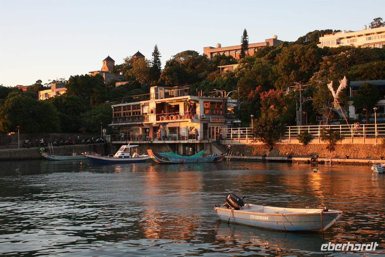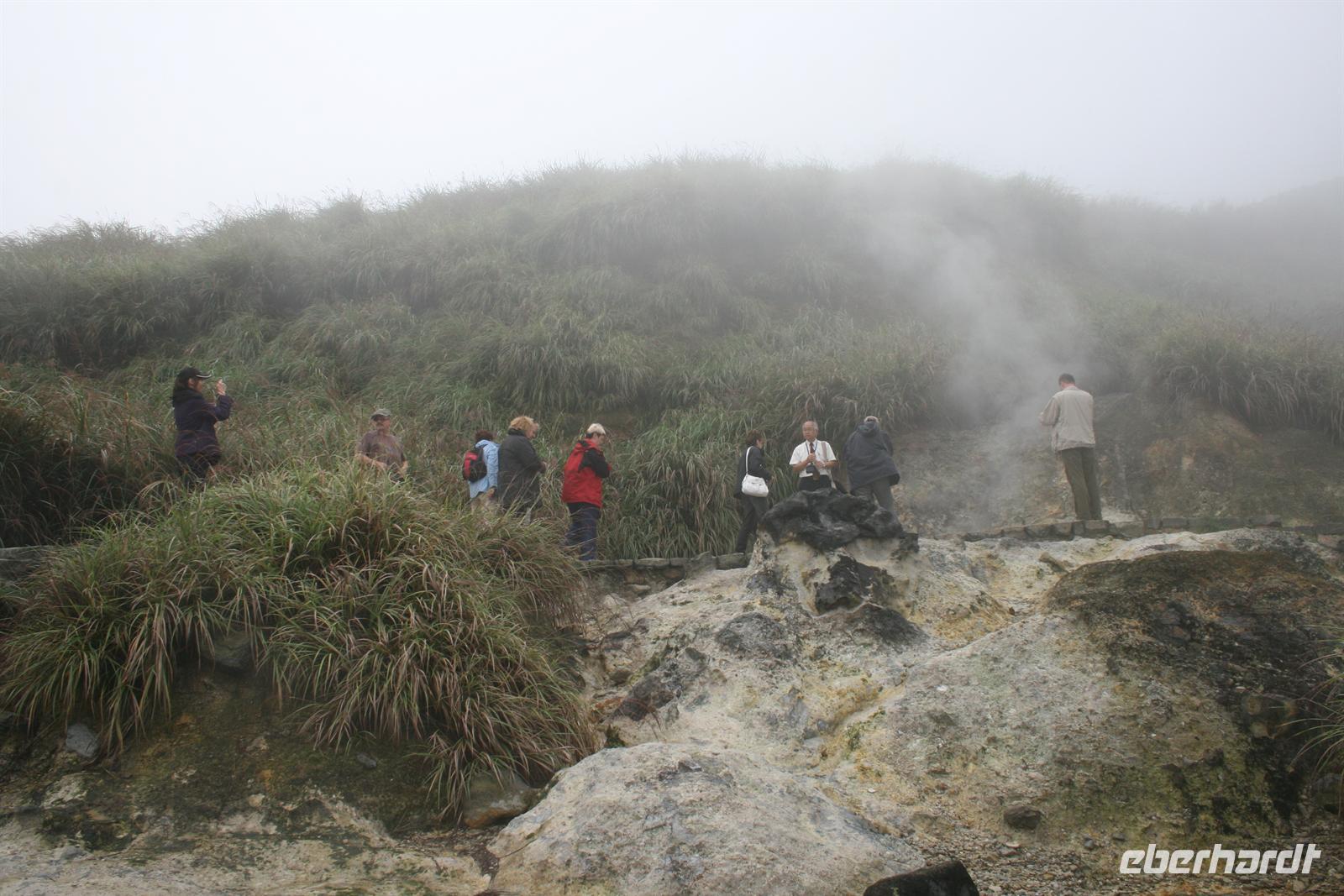 Der nächste Morgen begrüßte uns mit Sonnenschein und einem neuen Reiseleiter - Johnny. Ich kannte ihn bereits von meiner ersten Taiwan-Reise und unsere Maxi ging für die nächsten beiden Tage bei ihm in die Lehre. Auch unser Fahrer hatte eine tolle Überraschung für uns: Er hatte am Vortag ein Gruppen-Foto von uns aufgenommen und dieses nun für jeden entwickelt - wir freuten uns wirklich sehr! Unser Reiseleiter Johnny hatte sofort einen tollen Vorschlag: da wir so wunderbaren Sonnenschein hatten, schlug er vor, den Taipei 101 bereits heute zu besuchen. Somit konnten wir im schnellsten Aufzug der Welt in 37 Sekunden in den 89. Stock fahren und die Aussicht über die Metropole genießen. Kurzzeitig hatte sich ein Gast „aus dem Staub gemacht“, aber wir trafen uns am Bus wieder . Im Anschluss führte uns unsere Fahrt ein Stück Richtung Norden, zum Yangmishan-Nationalpark. Den Schwefel des Vulkangebiets konnte man bereits von Weitem riechen und auch an den brodelnden Löchern gelblich abgelagert sehen. Eine weitere Sicht war aufgrund dunkler Wolken leider nicht möglich, aber der dichte Nebel verpasste dem Ort auch eine mystische Stimmung. Nun war es schon Mittagszeit, aber die ersten beiden Anlaufstellen hatten unverschämte Preise und so richtig viel wollte keiner, denn wir hatten ja gut gefrühstückt und wieder ein leckeres Abendessen vor uns. Wir fuhren also Richtung Danshui, das eh auf unserem Plan stand und aßen eine Kleinigkeit an der Promenade. Nicht gerade schnell, aber dafür mit viel Liebe wurden die Gerichte gebracht - wo bekommt man schon einen Melonenschmetterling oder ein Mangoherz serviert. Man konnte also dann eher von einem Nachmittagssnack sprechen und so wurde dann auch nach dem Besuch der hübschen Festung San Domingo der Sonnenuntergang im Bild festgehalten.