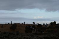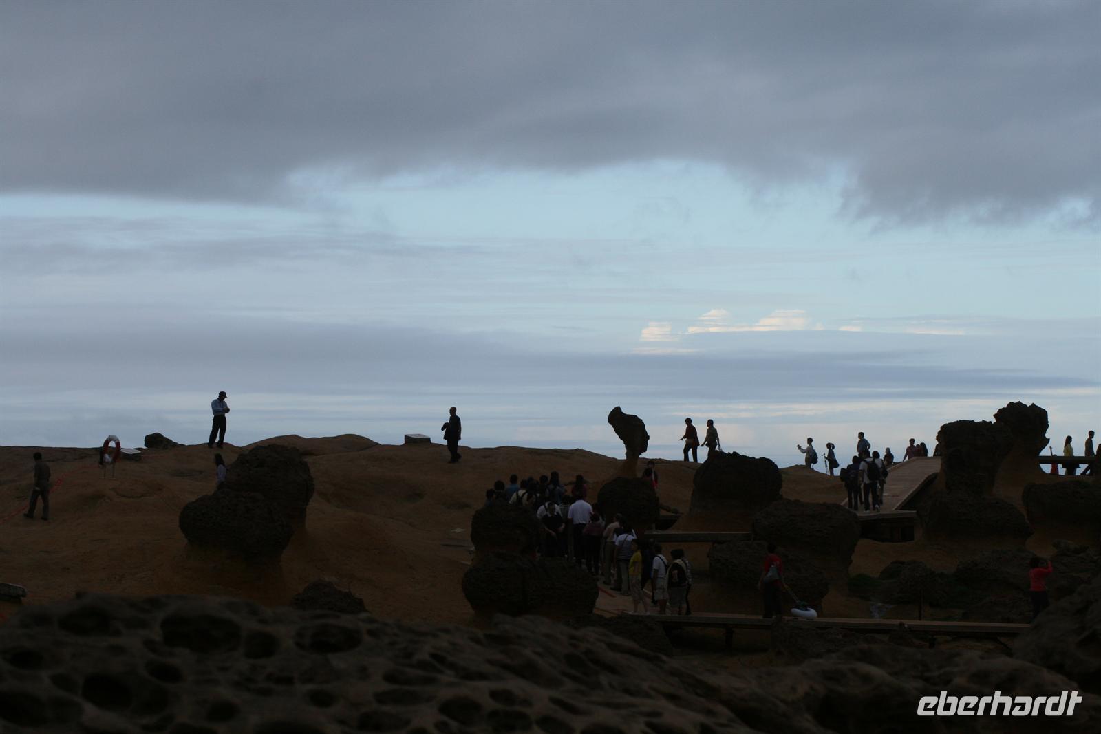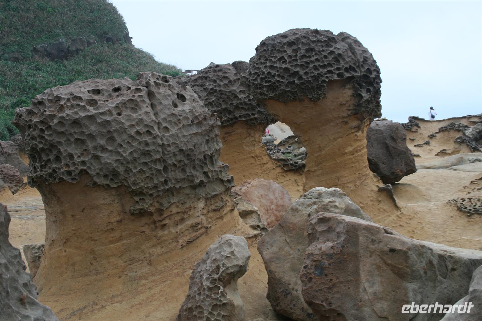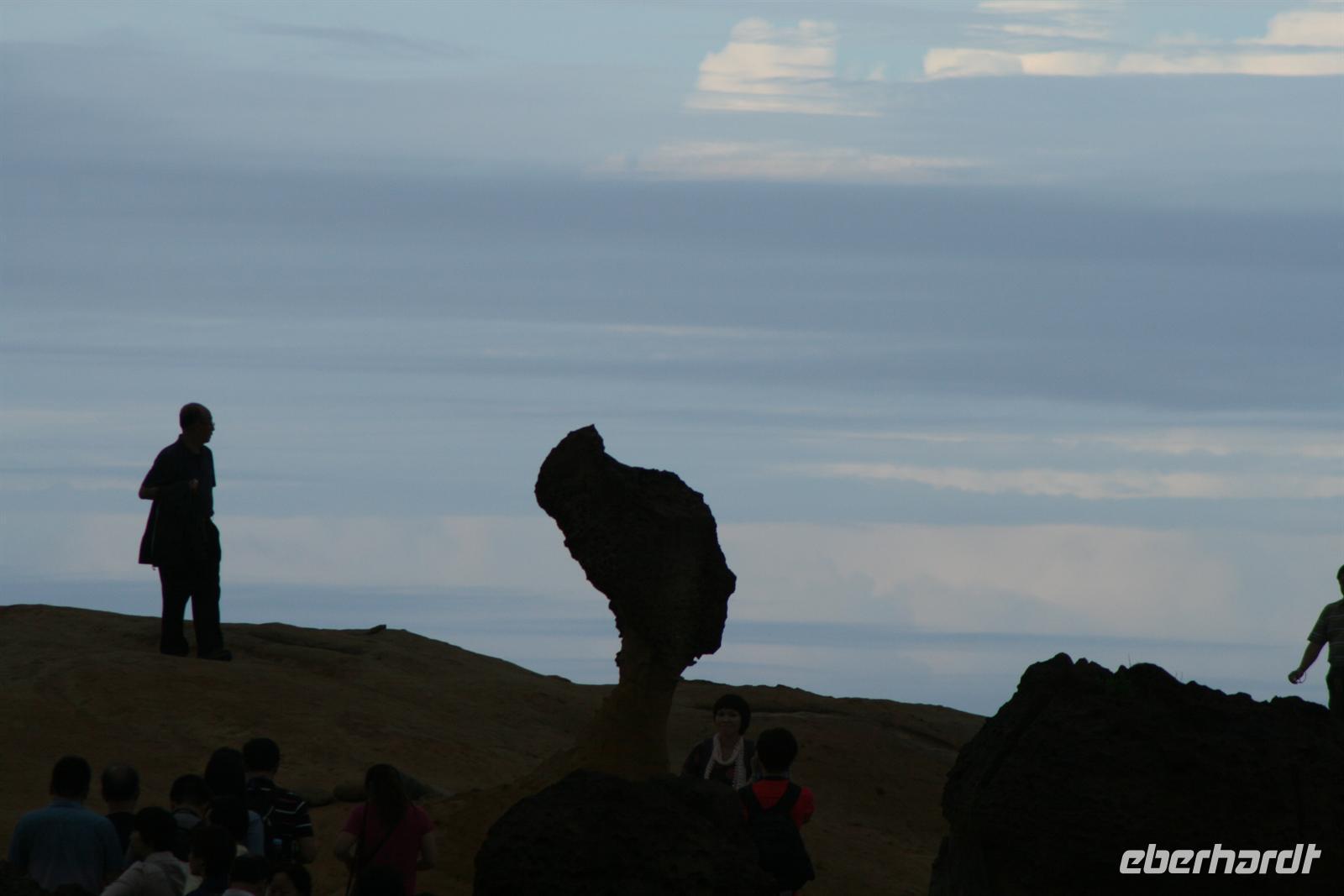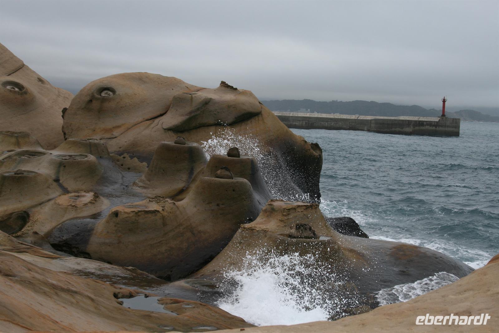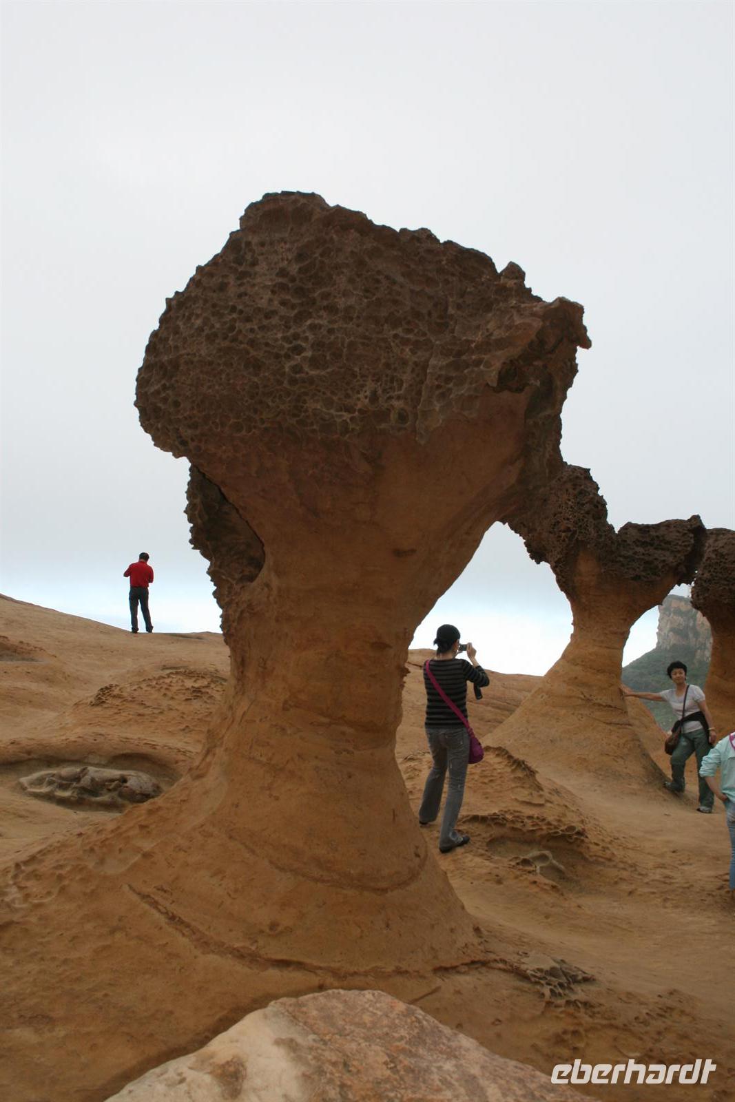 Heute Morgen konnten wir noch einmal etwas länger schlafen, denn die nächste Nacht würden wir uns wieder im Flugzeug „betten“ - auf dem Weg nach Australien. Auch heute strahlte die Sonne für uns und auch unsere „herzlichen Drei“ Johnny, Maxi und unser Fahrer begrüßten uns fröhlich. Der erste Weg führte uns zum Nationalen Palastmuseum, allerdings drehte Johnny direkt auf dem Absatz um, da sich viel zu viele Besucher in dem Museum befanden. Wir fuhren daher in die Stadt, um ein wenig in einer Straße zu bummeln, die für Tee und getrocknete Lebensmittel berühmt ist. Die gewünschten getrockneten Austern wurden zwar nicht gefunden, aber von Vogelspucke in Zuckerwasser hatte auch ich das erste Mal gehört. Wir bekamen Erklärungen zur Wirkungsweise der getrockneten Pilze, Pflanzen und auch Meeresfrüchte. Auch der Bummel in einem Stoffkaufhaus sorgte für Spaß. Zurück zum Bus und noch einmal fuhren wir das Nationale Palastmuseum an. Und Johnny hatte Recht behalten - wir konnten entspannt die Kunstschätze auf uns wirken lassen. Besonders beeindruckten mich ein Miniatur-Boot aus einem Olivenkern geschnitzt und ein hauchzarter Tragekorb für Speisen aus Elfenbein. Das darauf folgende Mittagessen war ebenfalls eine tolle Erfahrung - es wurden Dumplings serviert - diese waren mit Gemüse oder Fleisch oder Meeresfrüchten gefüllt. Dazu gab es Wasserspinat, Kohl und diverse Würzmöglichkeiten wie Soja-Sauce und Ingwer. Auch die süßen Dumplings - also Dämpflinge - sollte man probiert haben. Um unsere Zeit bis zum Abflug am Abend richtig zu nutzen, hatte uns Johnny den Geopark Yehliu vorgeschlagen, in dem es interessante Felsformationen aus Sandstein, aber auch Fossilien zu sehen gibt.