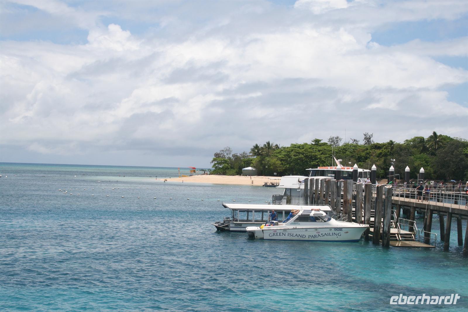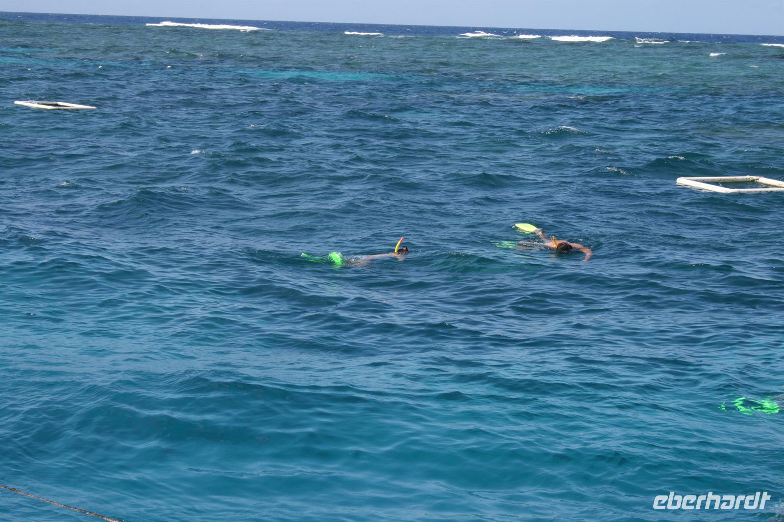 Frisch und ausgeschlafen trafen wir uns heute beim Frühstück und stärkten uns für einen erlebnisreichen Tag. Wir wurden abgeholt und zum Hafen gebracht, wo wir die Tickets für unseren Tagesausflug erhielten. 10.30 Uhr legte das Schiff in Cairns ab und unser erster Stopp wurde an der Green Island eingelegt, wo viele Passagiere ausstiegen und einige zustiegen. Die darauf folgende Fahrt war schon etwas schaukelig und einige wenige wurden seekrank, aber unsere Gruppe hatte sich gut vorbereitet und „gefährdete Passagiere“ hatten bereits Ingwertabletten genommen, die sehr gut gegen Reisekrankheit helfen. Am Norman Reef angekommen, wechselten wir auf eine Plattform, von der das Glasbodenboot ablegte. Wir sahen verschiedene Fische und Korallen und erhielten einige Erklärungen dazu. Beispielsweise sind alle Korallen nach ihrem Aussehen benannt - so findet man starre Korallen wie Tellerkorallen, Astkorallen, Blumenkohlkorallen oder weiche Korallen wie Spaghettikorallen an diesem Riff. Zugegeben während des Schnorchelns erschienen die Farben intensiver, aber man konnte bei dieser Fahrt einen ersten Eindruck bekommen. Danach ließen wir uns ein leichtes Mittagessen schmecken, denn schließlich soll man ja nicht mit vollem Bauch ins Wasser gehen. Und schon begann unser Schnorchel-Abenteuer - ausgerüstet mit Lycra-Anzug, zum Sonnenschutz, Schwimmbrille und Schnorchel gingen wir auf Entdeckung des Riffs.