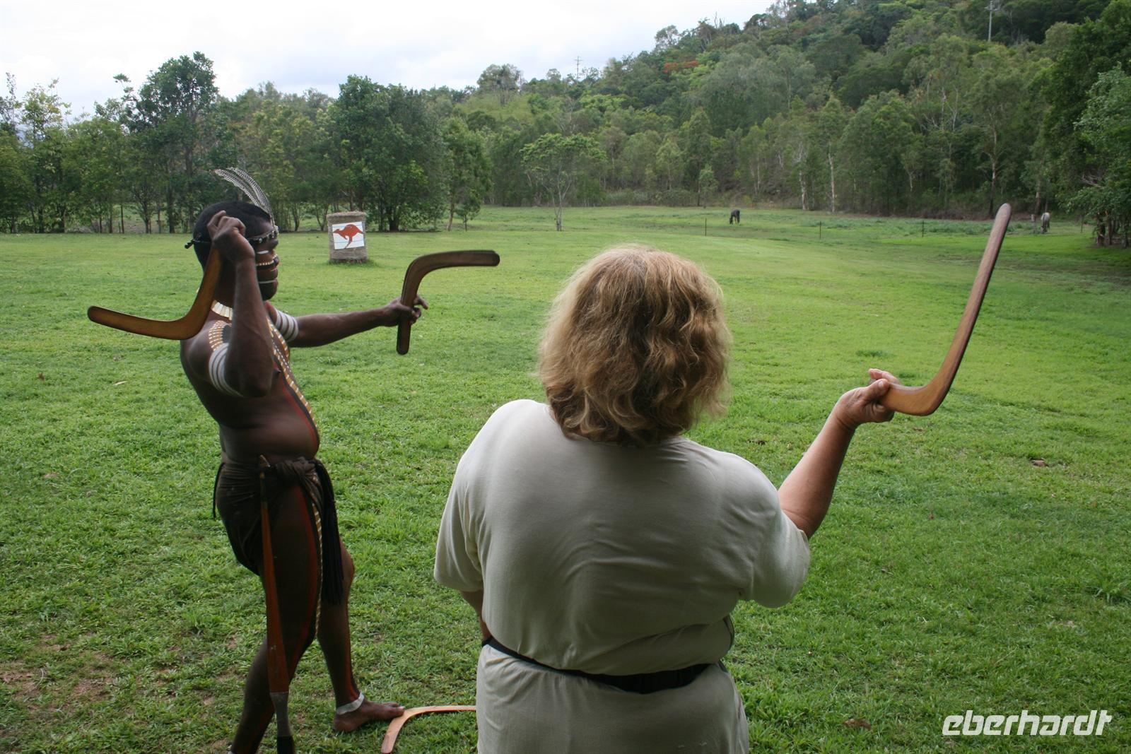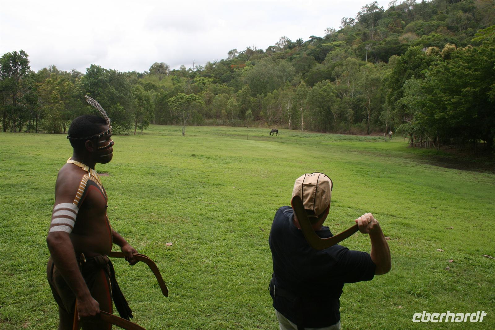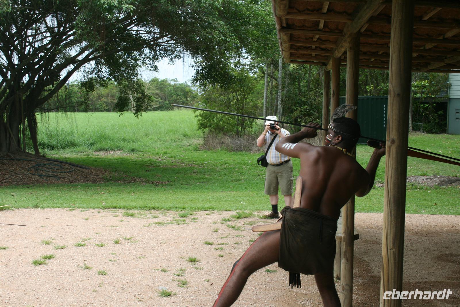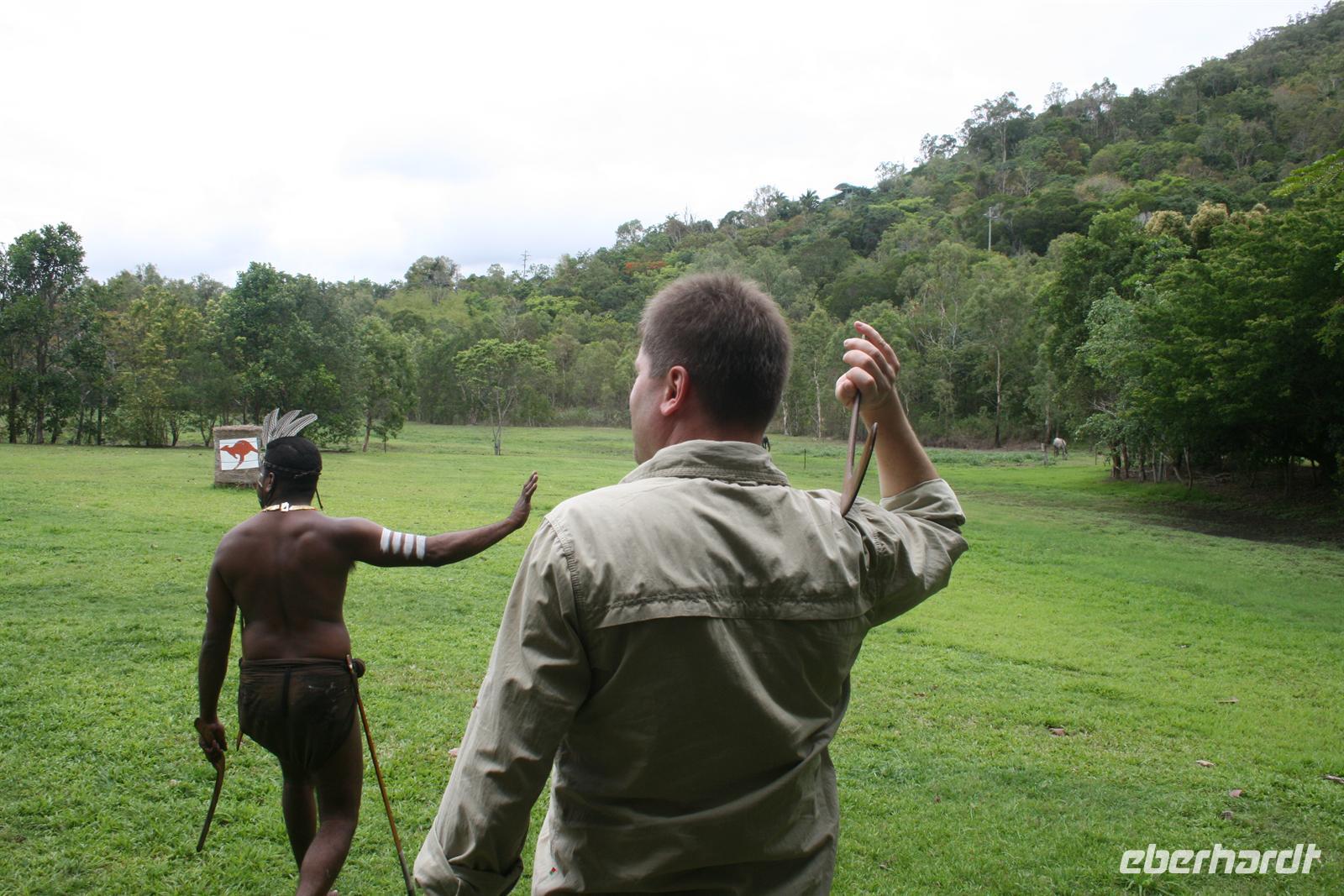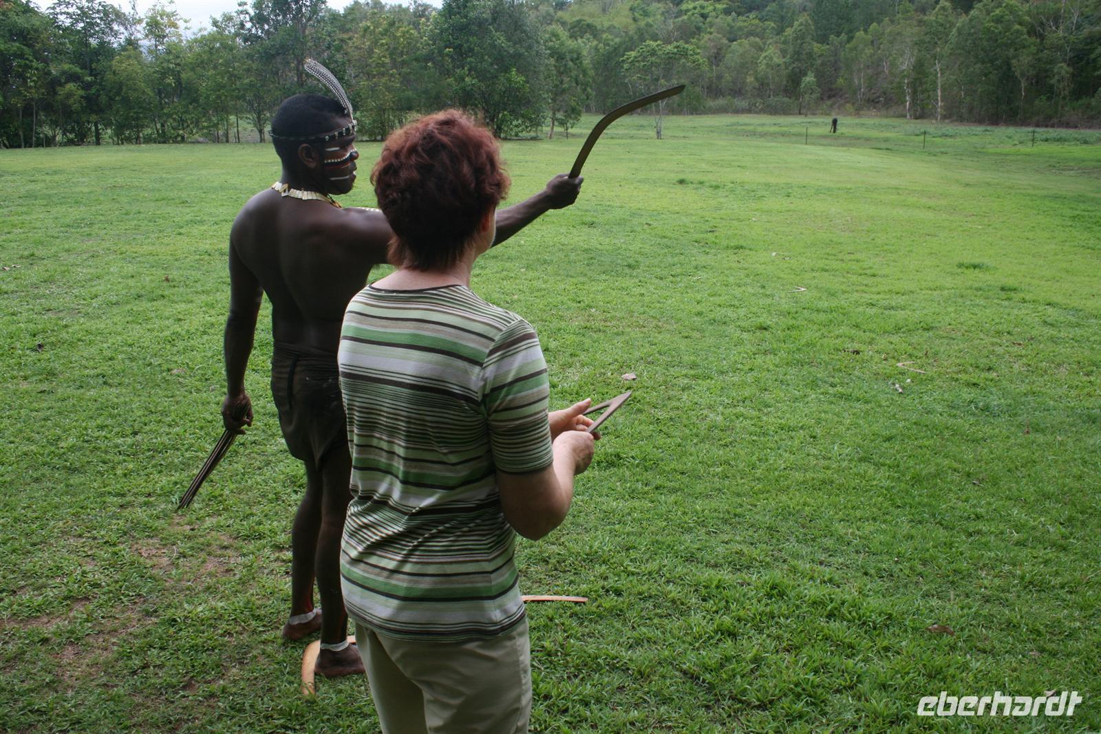 Heute Morgen begrüßten wir Trudy, eine Holländerin, die seit mehr als vier Jahren in Cairns lebt und Holländerin ist. Gemeinsam fuhren wir zum Tjapukai Aboriginal Center und erlebten dort eine wunderbare Didgeridoo-Vorführung, eine etwas gewöhnungsbedürftige aber dennoch interessante Vorführung der „Traumwelt“, also des Glaubens der Aborigines, sowie eine Tanzvorführung. Im Anschluss probierte sich jeder selbst im Speer- und Boomerang-Werfen und wir wussten, wir würden nicht verhungern als Ureinwohner, jeder hatte seine Talente an einer anderen Stelle .