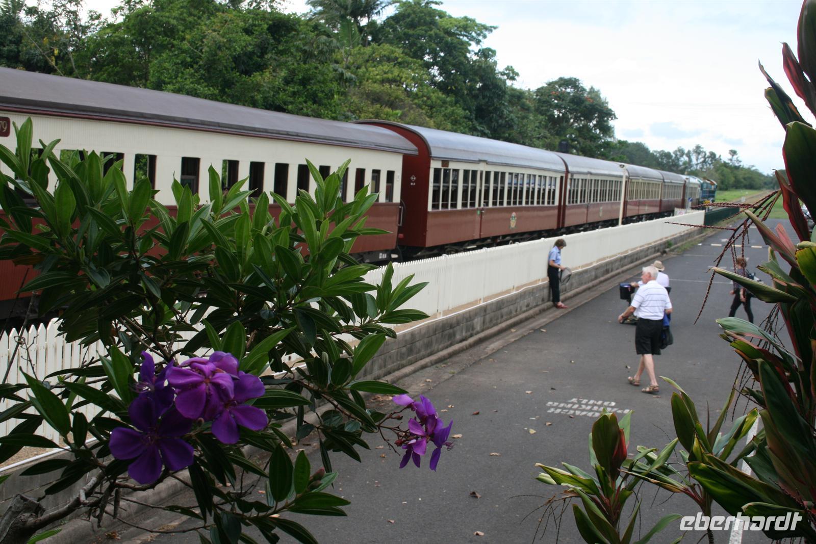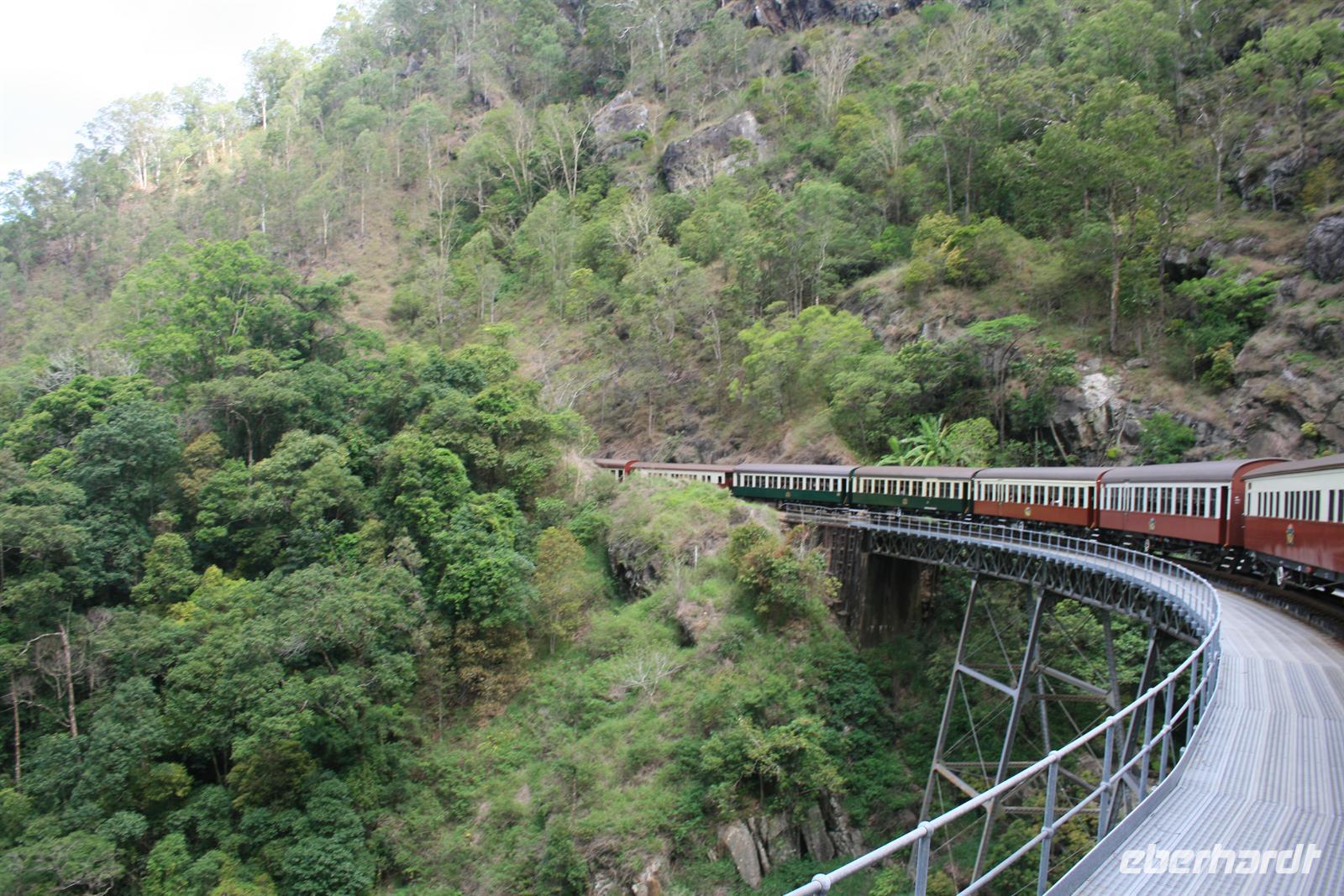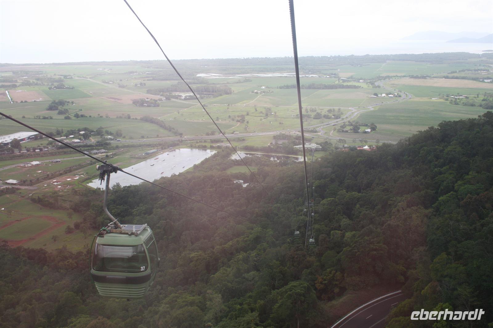 Als Abschluss erfuhren wir noch etwas zur Nutzung der einheimischen Pflanzen als Nahrungs- und Medizinquelle. Nach diesem Besuch schwebten wir mit der Seilbahn über den Regenwald. Ein tolles Erlebnis für Augen und Ohren - wir sahen unterwegs Kakadus, riesige Feigenbäume und herrliche Blüten des einheimischen Ingwers. Auf der ersten Station erhielten wir vielfältige Informationen von einem Ranger und auf der zweiten Station konnten wir die Barron Wasserfälle fotografieren und erhielten Infos zum Wasserkraftwerk und den ehemaligen Zinn und Goldminen. In Kuranda angekommen stöberten wir ein wenig in den vielen Souvenirläden und erstanden auch wichtige Dinge wie Hüte, Fliegen-Netze und wunderschöne Masken. Die Rückreise erlebten wir im Scenic Railway - ein Traditionszug aus dem Jahr 1891 mit tollen Ausblicken. Ein Stopp wurde noch einmal an den Barron Falls eingelegt, um sie noch einmal aus einer anderen Perspektive zu fotografieren. Auf dem letzten Stück und am Bahnhof sahen wir Mangos, Kokosnüsse und den sogenannten Pudding Apfel, Custard Aplple, an den Bäumen. Zurück im Hotel verabschiedeten wir uns von Trudy und verabredeten uns für den frühen Abend, um in der Stadt essen zu gehen und an der Bibliothek nach den fliegenden Hunden zu schauen, die sich dort eingenistet haben. Aber das Wetter machte uns einen Strich durch die Rechnung. Im Trockenen los gegangen wurden wir nur 10 Minuten später total eingeweicht und entschieden uns daher erneut für ein Abendessen im Hotel. Der Regen war warm und nicht unangenehm, aber nass ist nass . Denn in Cairns nieselt es nicht, sondern es schüttet meist. Auch heute schmeckte das Essen wieder fantastisch und nach einem Gläschen Wein gingen wir schlafen. Wir freuten uns auf einen erlebnisreichen folgenden Tag am Ayers Rock.