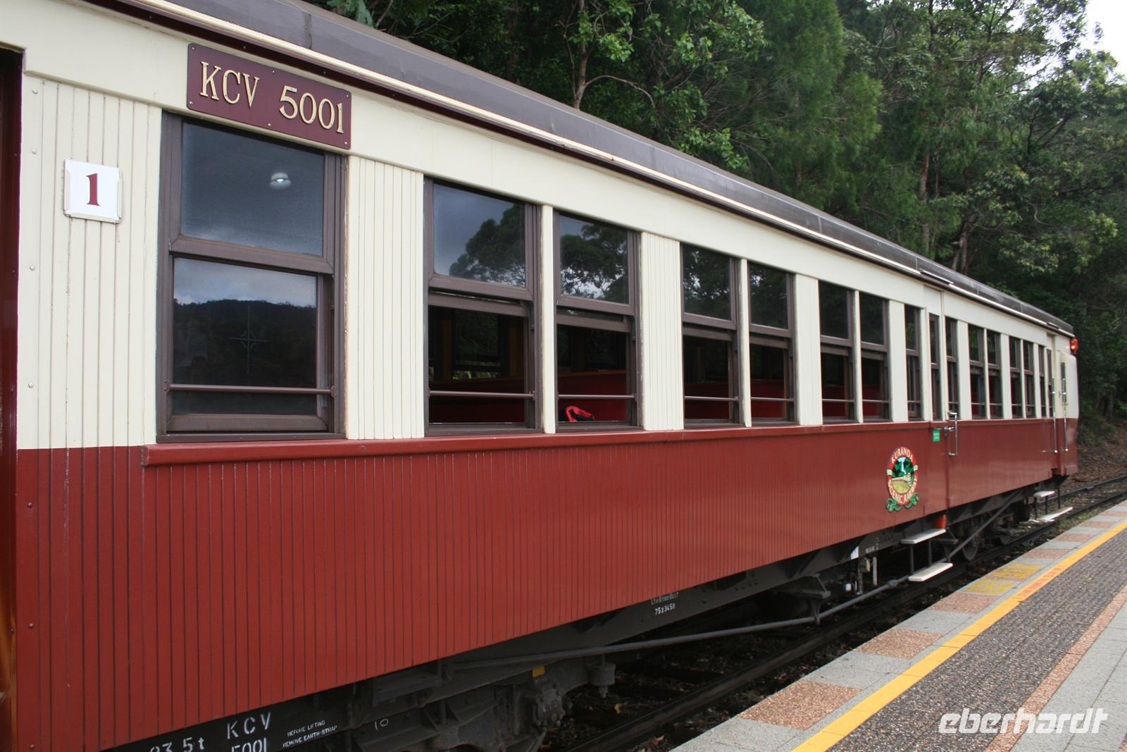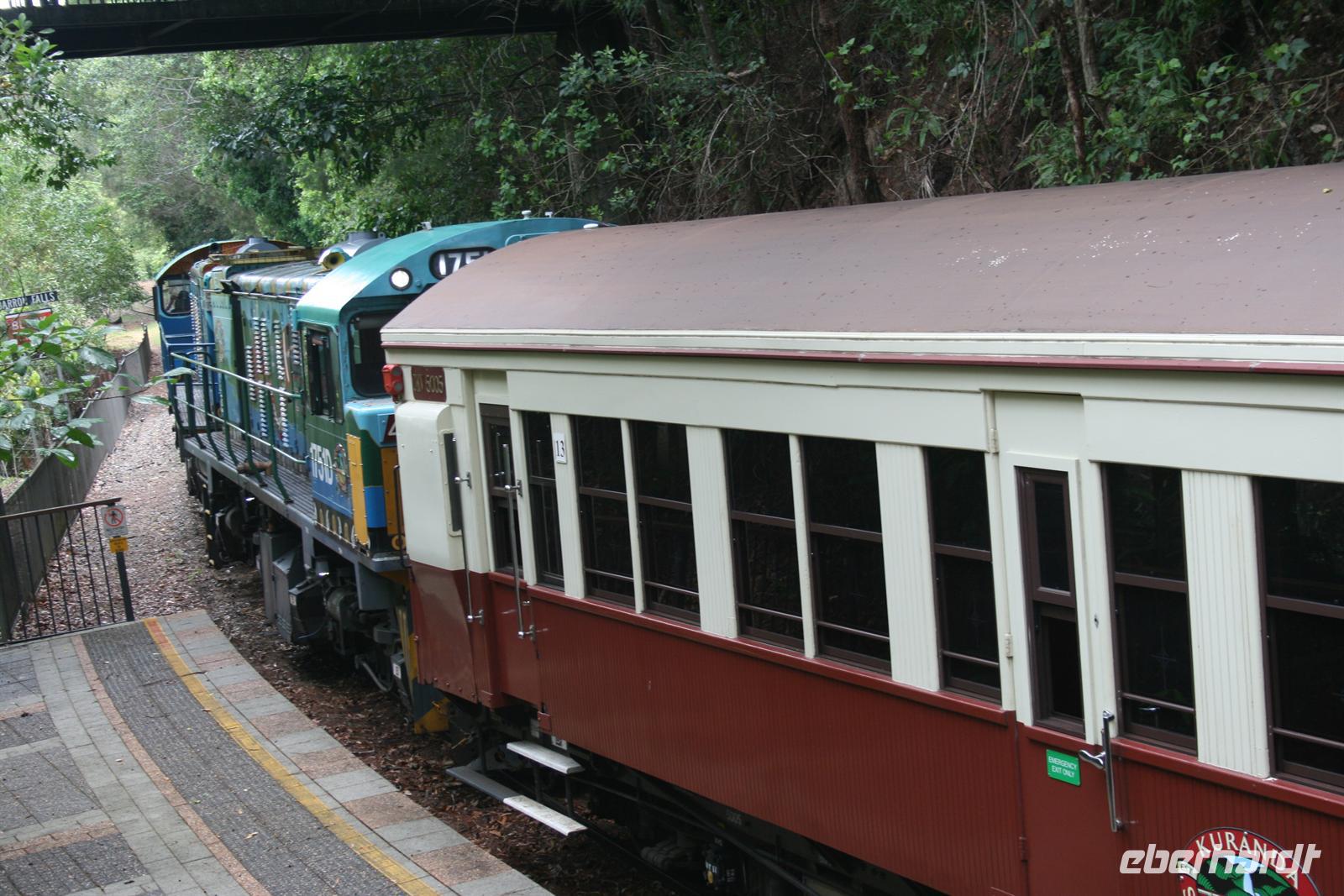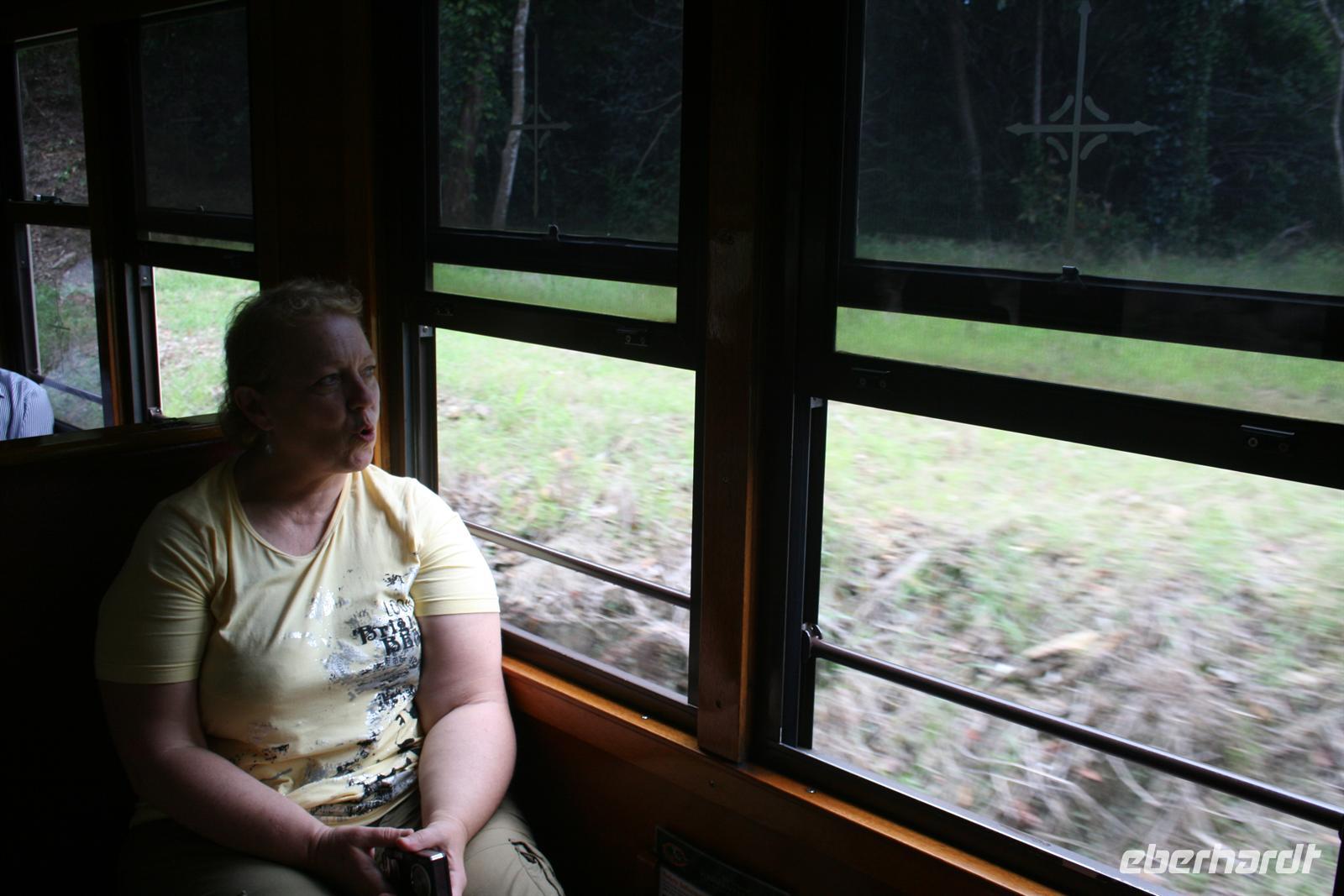Als Abschluss erfuhren wir noch etwas zur Nutzung der einheimischen Pflanzen als Nahrungs- und Medizinquelle. Nach diesem Besuch schwebten wir mit der Seilbahn über den Regenwald. Ein tolles Erlebnis für Augen und Ohren - wir sahen unterwegs Kakadus, riesige Feigenbäume und herrliche Blüten des einheimischen Ingwers. Auf der ersten Station erhielten wir vielfältige Informationen von einem Ranger und auf der zweiten Station konnten wir die Barron Wasserfälle fotografieren und erhielten Infos zum Wasserkraftwerk und den ehemaligen Zinn und Goldminen. In Kuranda angekommen stöberten wir ein wenig in den vielen Souvenirläden und erstanden auch wichtige Dinge wie Hüte, Fliegen-Netze und wunderschöne Masken. Die Rückreise erlebten wir im Scenic Railway - ein Traditionszug aus dem Jahr 1891 mit tollen Ausblicken. Ein Stopp wurde noch einmal an den Barron Falls eingelegt, um sie noch einmal aus einer anderen Perspektive zu fotografieren. Auf dem letzten Stück und am Bahnhof sahen wir Mangos, Kokosnüsse und den sogenannten Pudding Apfel, Custard Aplple, an den Bäumen. Zurück im Hotel verabschiedeten wir uns von Trudy und verabredeten uns für den frühen Abend, um in der Stadt essen zu gehen und an der Bibliothek nach den fliegenden Hunden zu schauen, die sich dort eingenistet haben. Aber das Wetter machte uns einen Strich durch die Rechnung. Im Trockenen los gegangen wurden wir nur 10 Minuten später total eingeweicht und entschieden uns daher erneut für ein Abendessen im Hotel. Der Regen war warm und nicht unangenehm, aber nass ist nass . Denn in Cairns nieselt es nicht, sondern es schüttet meist. Auch heute schmeckte das Essen wieder fantastisch und nach einem Gläschen Wein gingen wir schlafen. Wir freuten uns auf einen erlebnisreichen folgenden Tag am Ayers Rock.