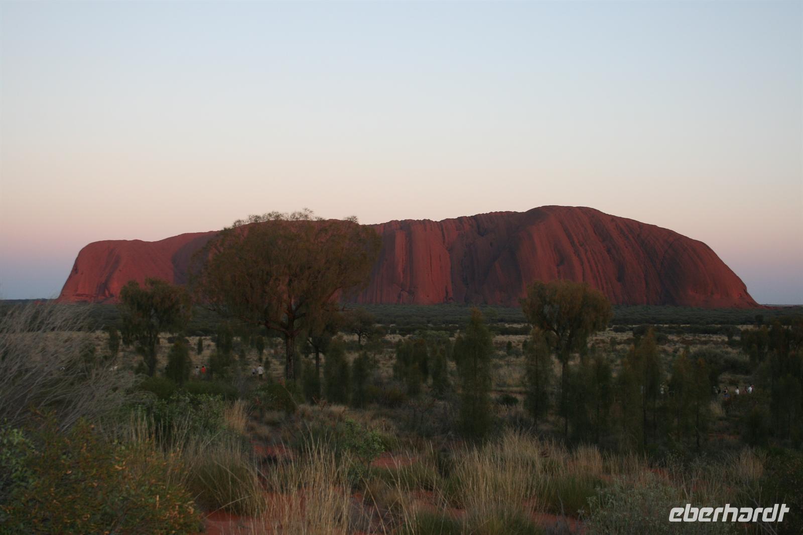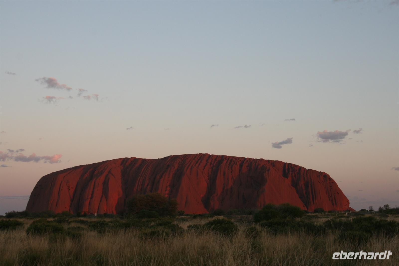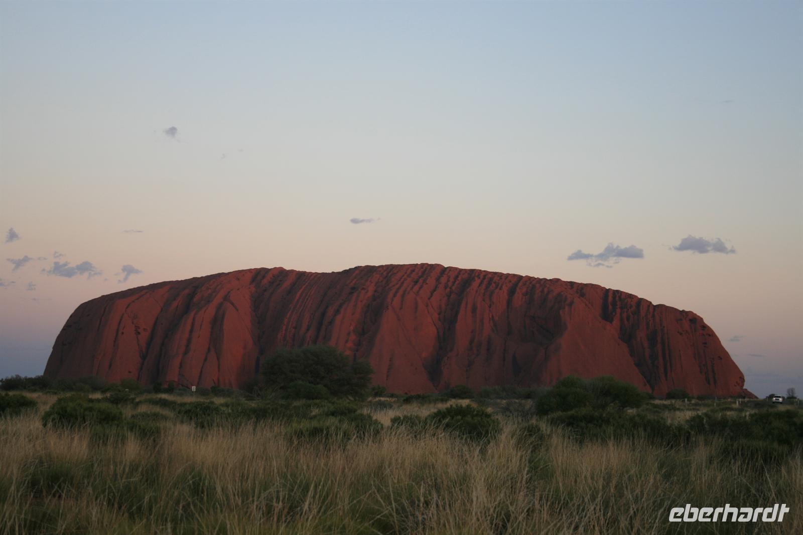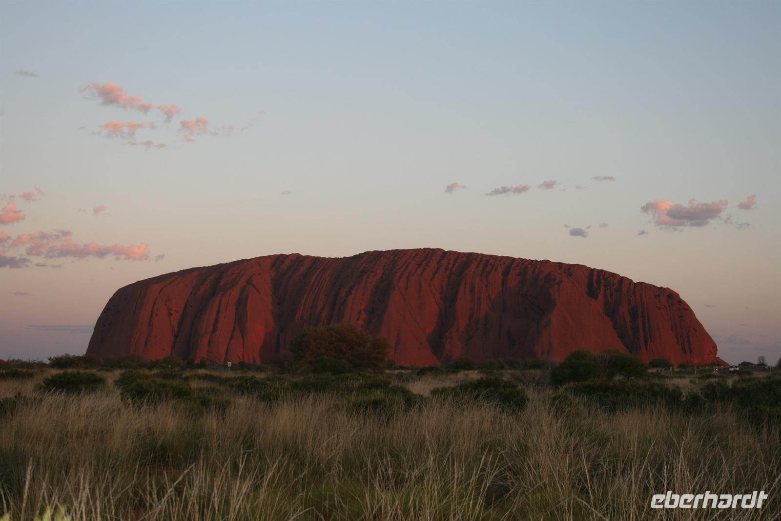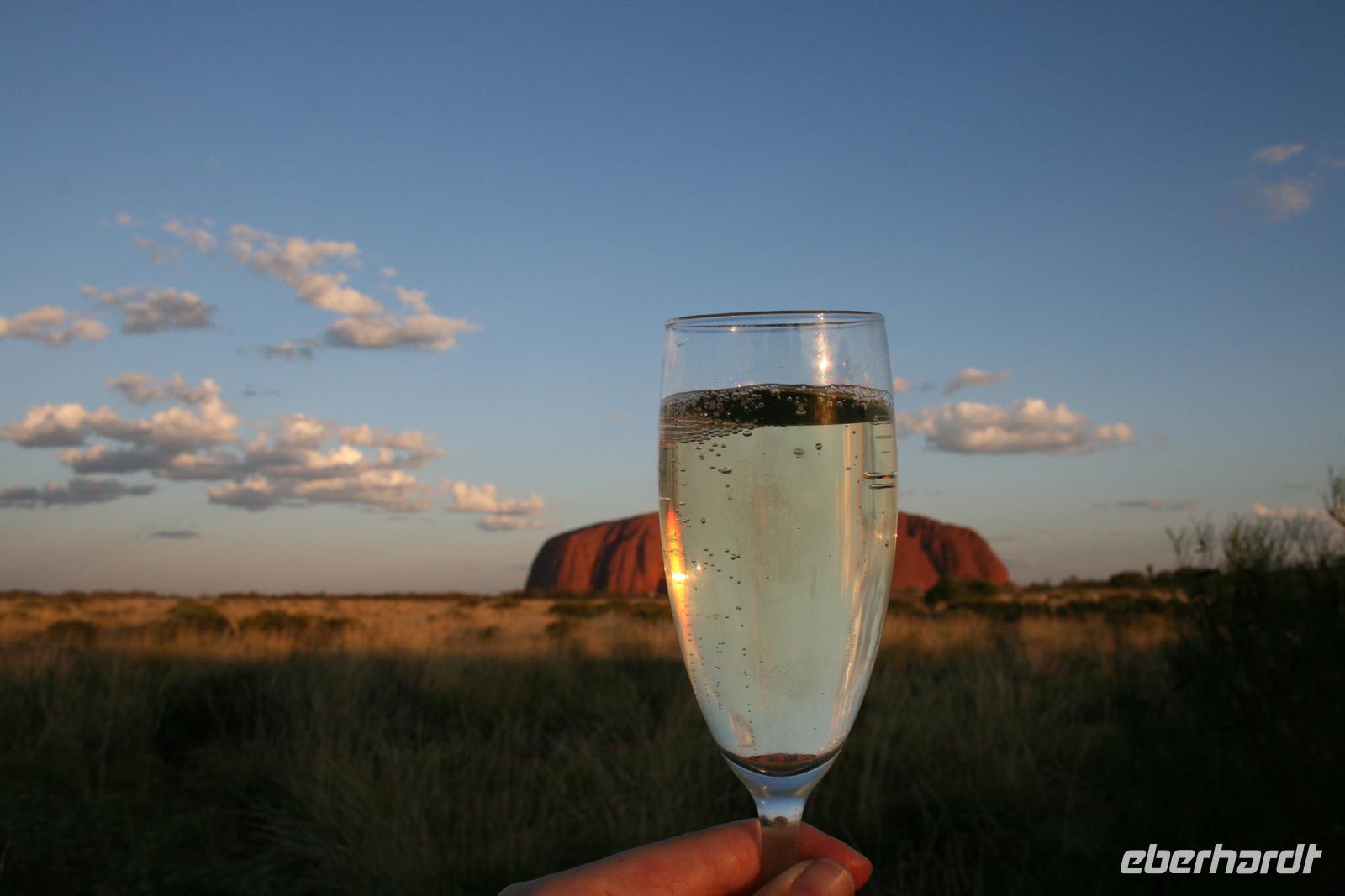Nach unserem Frühstück wurden wir zum Flughafen Cairns gebracht und flogen auf einem sehr angenehmen Flug bis zum Flughafen Ayers Rock. Da es meist wolkenlos war, hatten wir einen fantastischen Blick auf Australien und sahen endlose Wüste und Halbwüste und vor allem die bekannte rötliche Färbung. Umso beeindruckender ist das Auftauchen des Ayers Rock oder Uluru wie er in der Sprache der Einheimischen und nun auch offiziell heißt beim Landeanflug. Auch die Olgas bzw. Kata Tjutas konnten wir bereits aus dem Flieger bewundern. Auch die Salzseen konnte man wunderbar von oben sehen. Karsten, unser örtlicher Reiseleiter, holte uns am Flughafen ab und wir konnten sofort die Zimmer beziehen. Wir erkundeten im Anschluss per Shuttle das Besuchszentrum und den „Marktplatz“ des Ayers Rock Resorts. Denn ohne Wasser kommt man bei 35 Grad nicht weit. Aber wir wollen uns nicht beschweren, denn wir konnten den Nationalpark so sehen, wie man ihn selten zu Gesicht bekommt. Aufgrund von viel Regen im letzten Jahr ist der Nationalpark sehr grün und es blüht überall. Und auch in den letzten 2 Wochen war es sehr durchwachsen, was der Natur gut tut, aber keinen so schönen Sonnenuntergang ermöglicht. Wir hatten es also wieder toll getroffen. Wir genossen zunächst die Aussicht auf die Kata Tjutas, hörten die Geschichte ihrer Entdeckung und ihrer Umbenennung, denn vor dem ungewöhnlichen Namen Olga, hieß die Erhebung „Berg Müller“. Karsten erklärte uns viel über die Pflanzenwelt: Spinnifax-Gras, Desert Oaks und verschiedene Pflanzen, die die Aborigines zur Ernährung und als Medizin nutzen. Nach einer kurzen Fahrt erreichten wir die Walpa Schlucht, in der wir eine einstündige Wanderung unternahmen. Nun folgte das Highlight, heute zum Bergfest stießen wir mit Schampus am berühmten Berg „Ayers Rock“ an!Wir hatten einen tollen Sonnenuntergang, bei dem sich der Uluru in den verschiedensten Farben