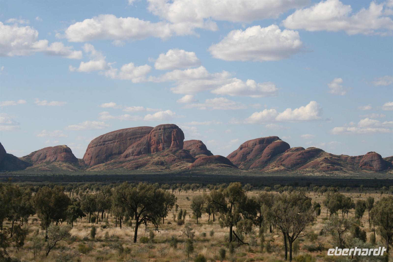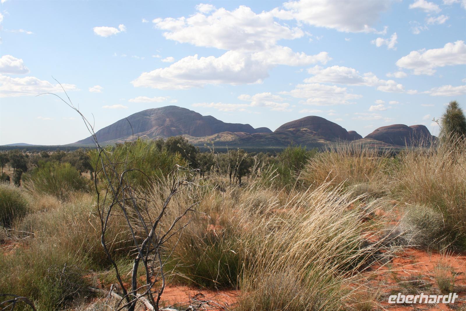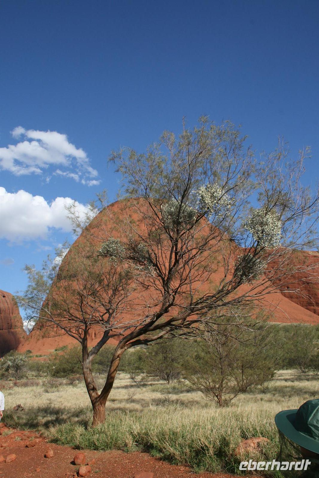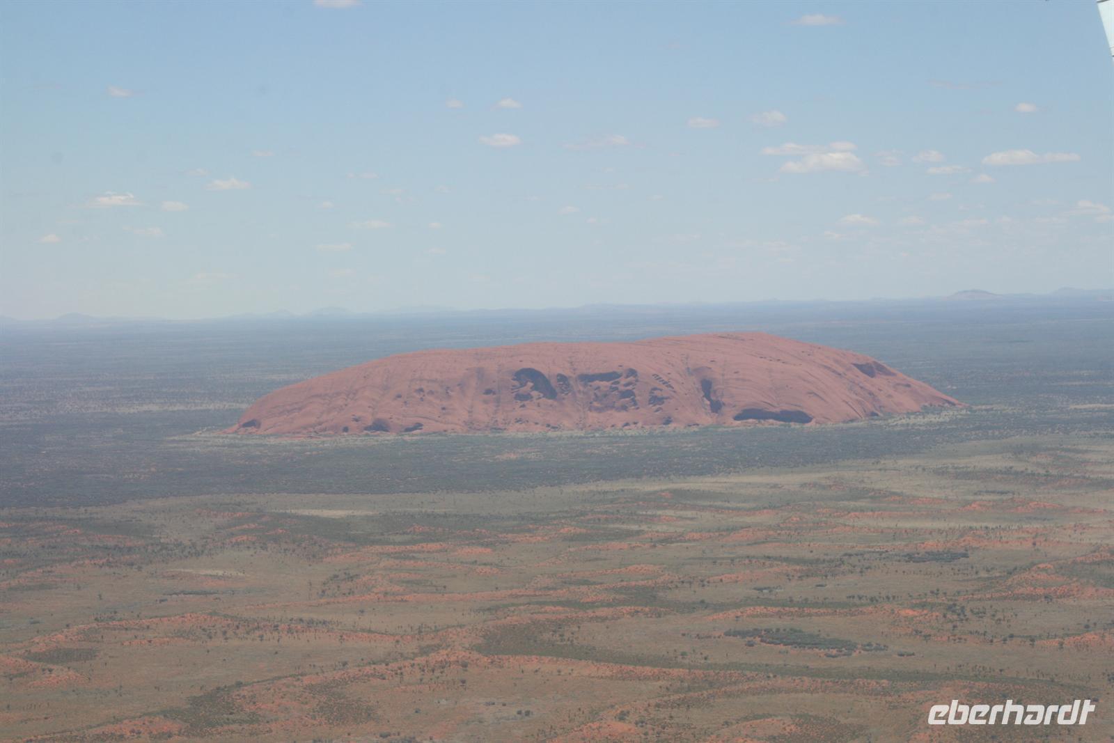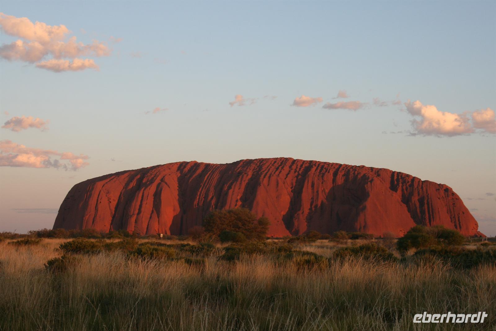 Nach unserem Frühstück wurden wir zum Flughafen Cairns gebracht und flogen auf einem sehr angenehmen Flug bis zum Flughafen Ayers Rock. Da es meist wolkenlos war, hatten wir einen fantastischen Blick auf Australien und sahen endlose Wüste und Halbwüste und vor allem die bekannte rötliche Färbung. Umso beeindruckender ist das Auftauchen des Ayers Rock oder Uluru wie er in der Sprache der Einheimischen und nun auch offiziell heißt beim Landeanflug. Auch die Olgas bzw. Kata Tjutas konnten wir bereits aus dem Flieger bewundern. Auch die Salzseen konnte man wunderbar von oben sehen. Karsten, unser örtlicher Reiseleiter, holte uns am Flughafen ab und wir konnten sofort die Zimmer beziehen. Wir erkundeten im Anschluss per Shuttle das Besuchszentrum und den „Marktplatz“ des Ayers Rock Resorts. Denn ohne Wasser kommt man bei 35 Grad nicht weit. Aber wir wollen uns nicht beschweren, denn wir konnten den Nationalpark so sehen, wie man ihn selten zu Gesicht bekommt. Aufgrund von viel Regen im letzten Jahr ist der Nationalpark sehr grün und es blüht überall. Und auch in den letzten 2 Wochen war es sehr durchwachsen, was der Natur gut tut, aber keinen so schönen Sonnenuntergang ermöglicht. Wir hatten es also wieder toll getroffen. Wir genossen zunächst die Aussicht auf die Kata Tjutas, hörten die Geschichte ihrer Entdeckung und ihrer Umbenennung, denn vor dem ungewöhnlichen Namen Olga, hieß die Erhebung „Berg Müller“. Karsten erklärte uns viel über die Pflanzenwelt: Spinnifax-Gras, Desert Oaks und verschiedene Pflanzen, die die Aborigines zur Ernährung und als Medizin nutzen. Nach einer kurzen Fahrt erreichten wir die Walpa Schlucht, in der wir eine einstündige Wanderung unternahmen. Nun folgte das Highlight, heute zum Bergfest stießen wir mit Schampus am berühmten Berg „Ayers Rock“ an!Wir hatten einen tollen Sonnenuntergang, bei dem sich der Uluru in den verschiedensten Farben