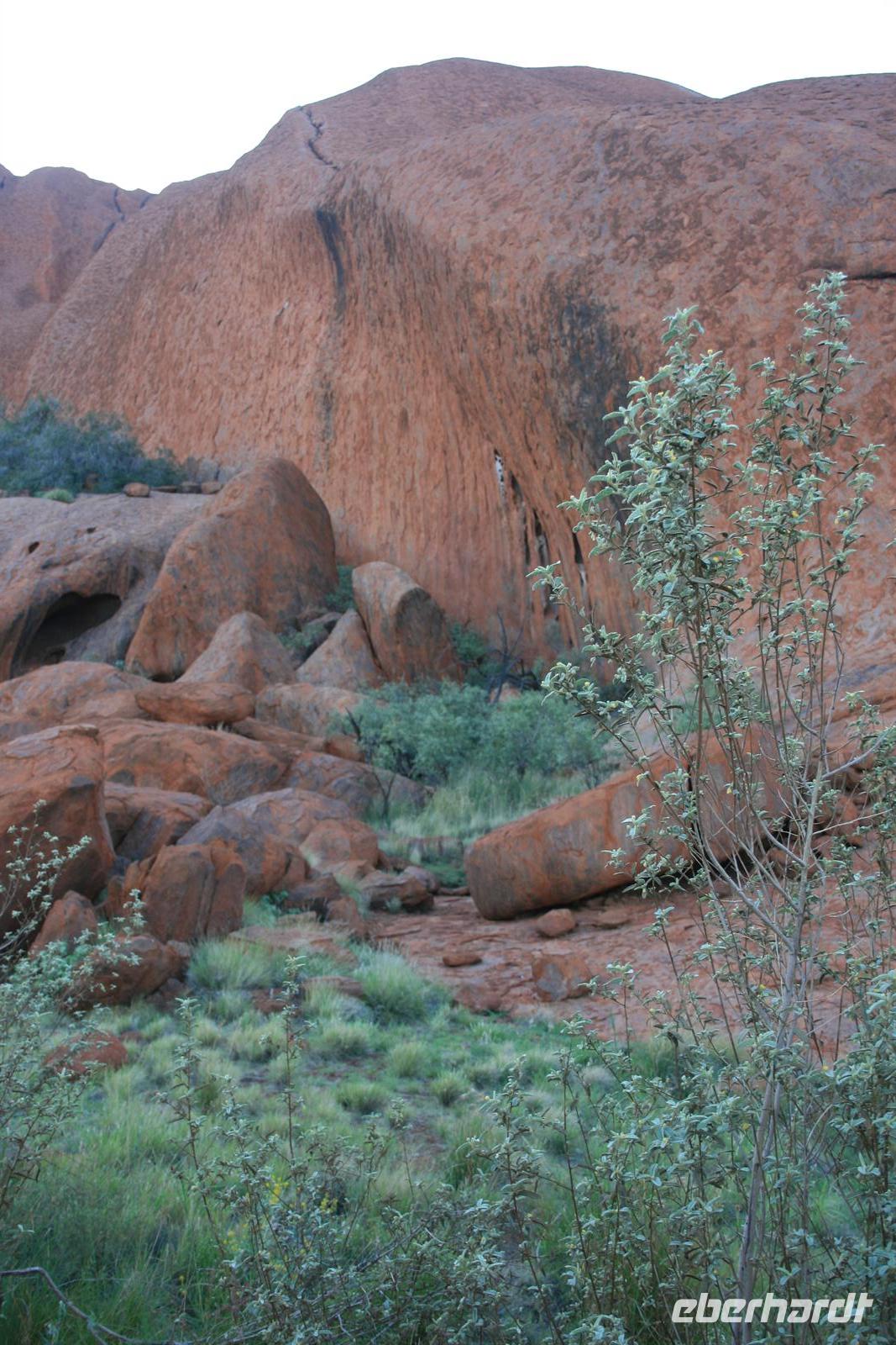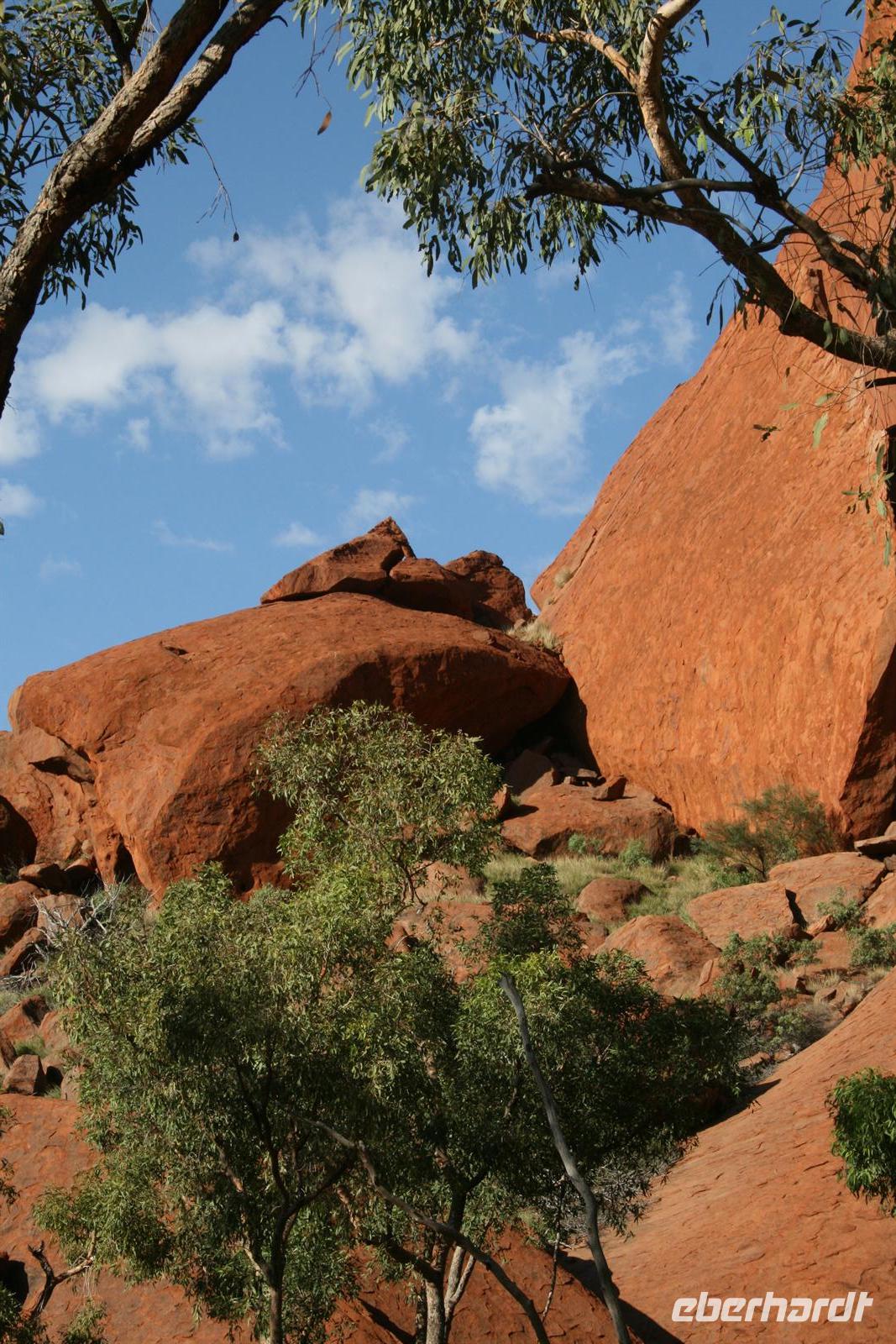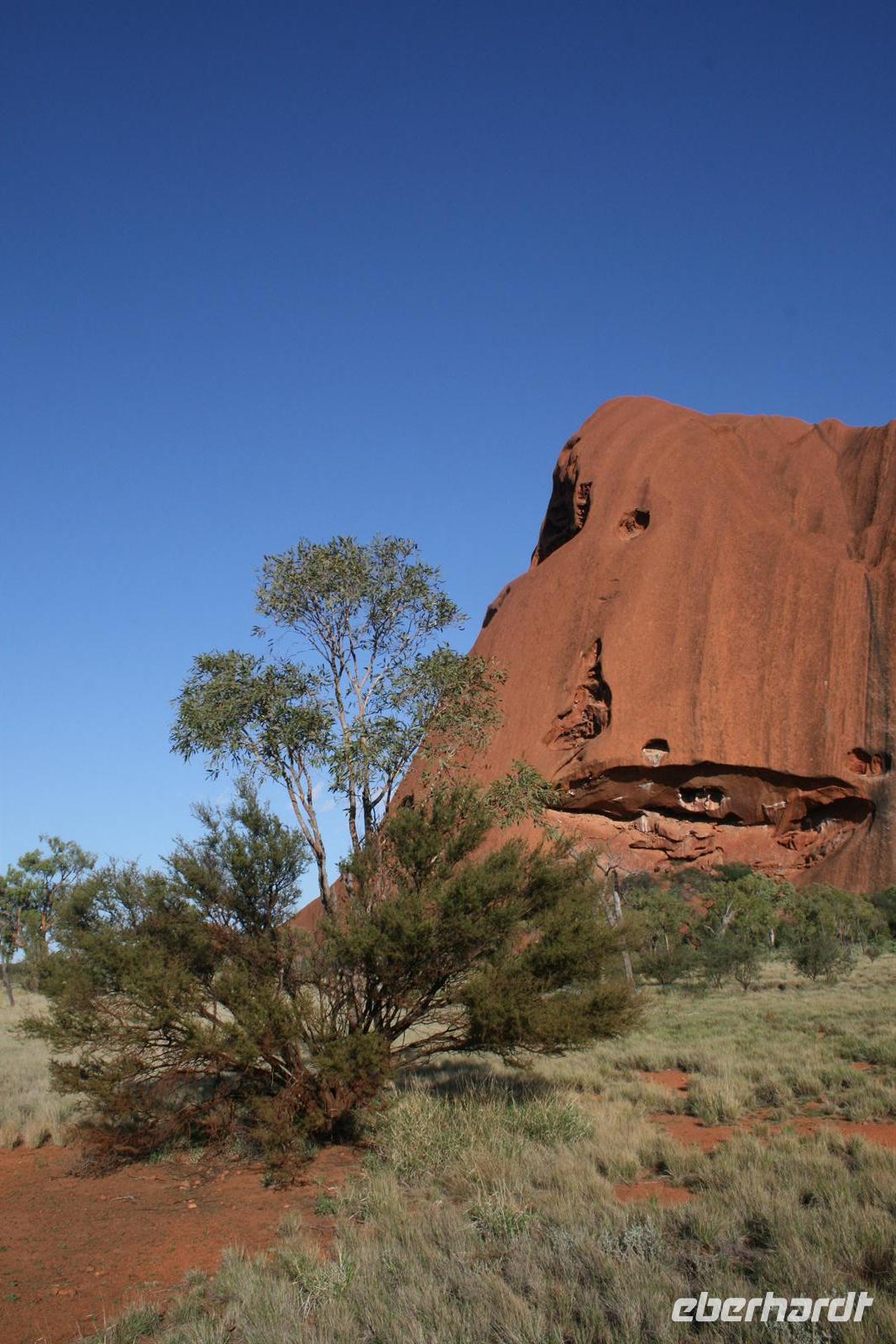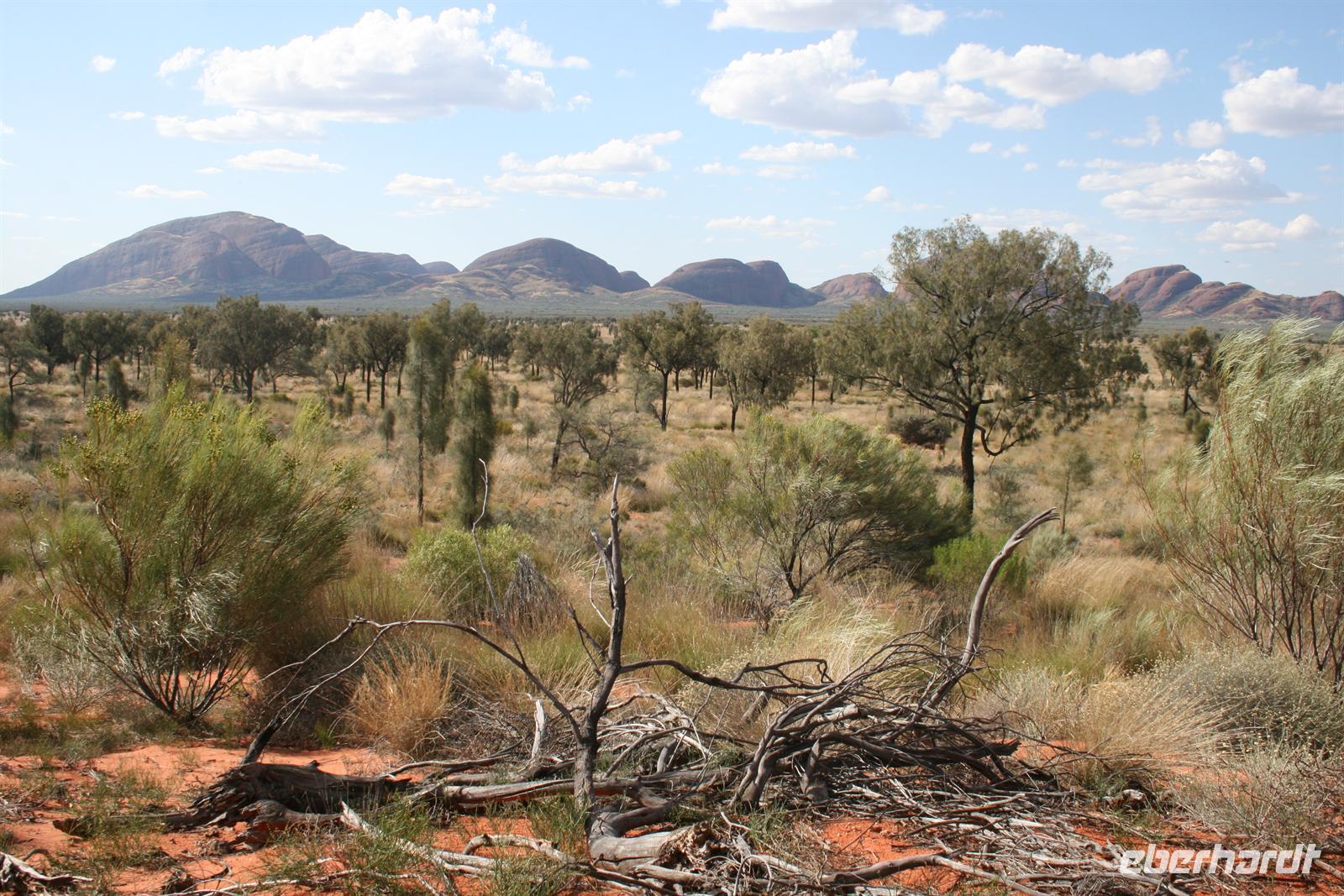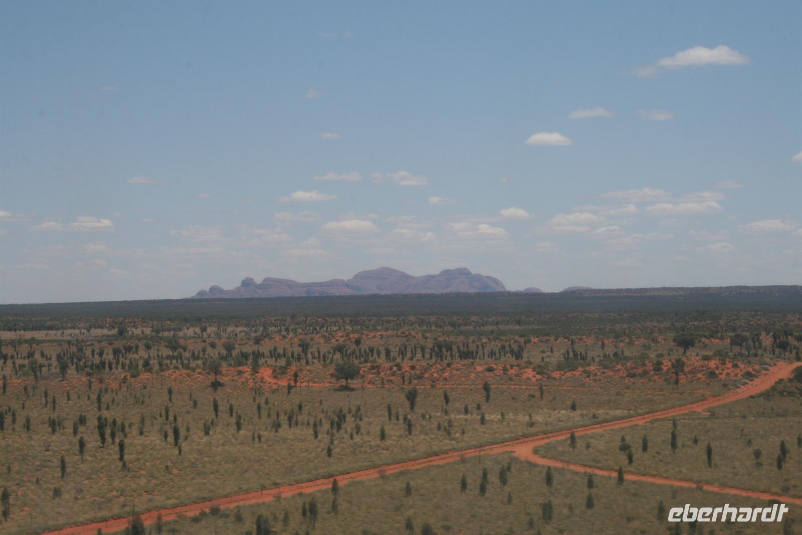 Nach unserem Frühstück wurden wir zum Flughafen Cairns gebracht und flogen auf einem sehr angenehmen Flug bis zum Flughafen Ayers Rock. Da es meist wolkenlos war, hatten wir einen fantastischen Blick auf Australien und sahen endlose Wüste und Halbwüste und vor allem die bekannte rötliche Färbung. Umso beeindruckender ist das Auftauchen des Ayers Rock oder Uluru wie er in der Sprache der Einheimischen und nun auch offiziell heißt beim Landeanflug. Auch die Olgas bzw. Kata Tjutas konnten wir bereits aus dem Flieger bewundern. Auch die Salzseen konnte man wunderbar von oben sehen. Karsten, unser örtlicher Reiseleiter, holte uns am Flughafen ab und wir konnten sofort die Zimmer beziehen. Wir erkundeten im Anschluss per Shuttle das Besuchszentrum und den „Marktplatz“ des Ayers Rock Resorts. Denn ohne Wasser kommt man bei 35 Grad nicht weit. Aber wir wollen uns nicht beschweren, denn wir konnten den Nationalpark so sehen, wie man ihn selten zu Gesicht bekommt. Aufgrund von viel Regen im letzten Jahr ist der Nationalpark sehr grün und es blüht überall. Und auch in den letzten 2 Wochen war es sehr durchwachsen, was der Natur gut tut, aber keinen so schönen Sonnenuntergang ermöglicht. Wir hatten es also wieder toll getroffen. Wir genossen zunächst die Aussicht auf die Kata Tjutas, hörten die Geschichte ihrer Entdeckung und ihrer Umbenennung, denn vor dem ungewöhnlichen Namen Olga, hieß die Erhebung „Berg Müller“. Karsten erklärte uns viel über die Pflanzenwelt: Spinnifax-Gras, Desert Oaks und verschiedene Pflanzen, die die Aborigines zur Ernährung und als Medizin nutzen. Nach einer kurzen Fahrt erreichten wir die Walpa Schlucht, in der wir eine einstündige Wanderung unternahmen. Nun folgte das Highlight, heute zum Bergfest stießen wir mit Schampus am berühmten Berg „Ayers Rock“ an!Wir hatten einen tollen Sonnenuntergang, bei dem sich der Uluru in den verschiedensten Farben