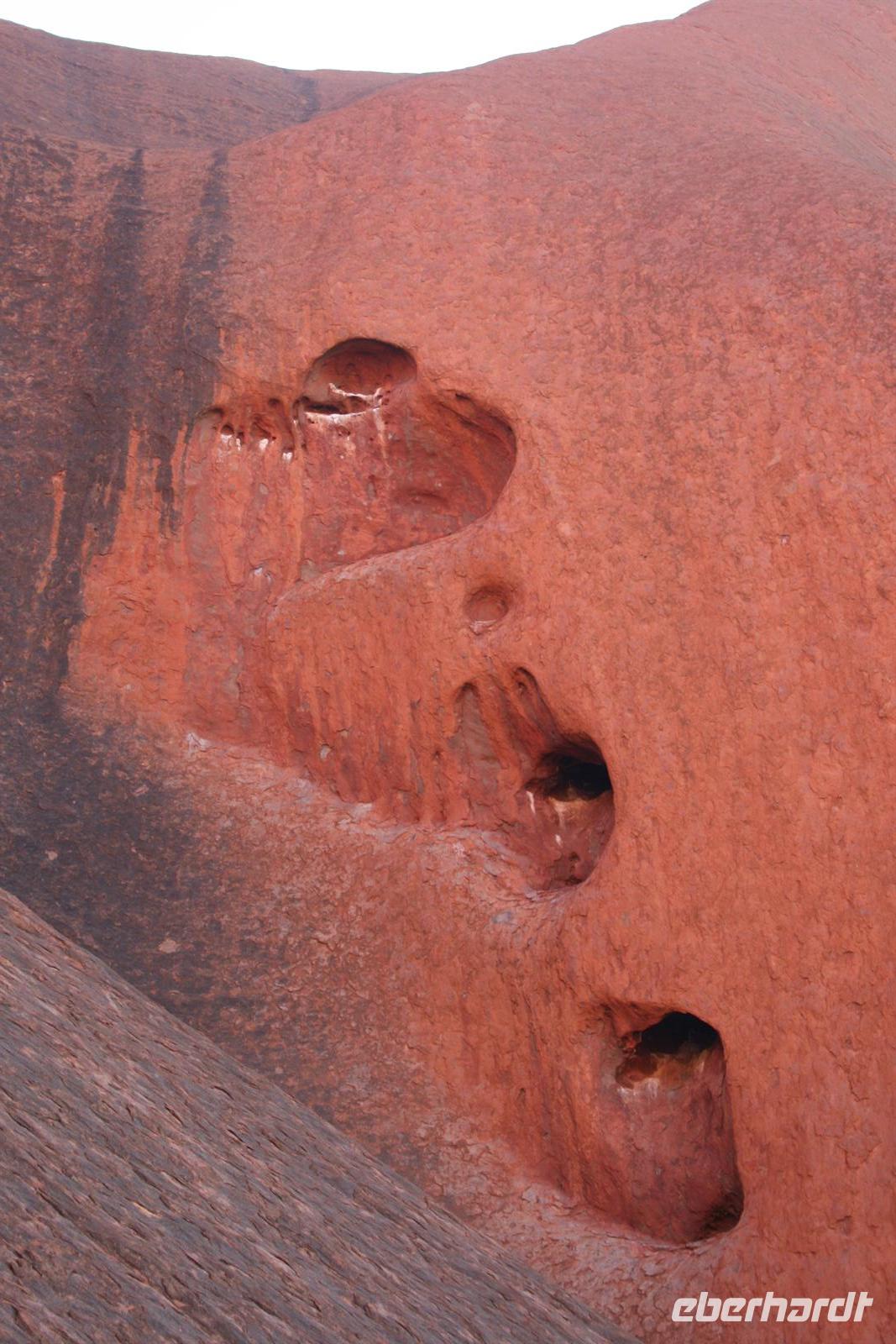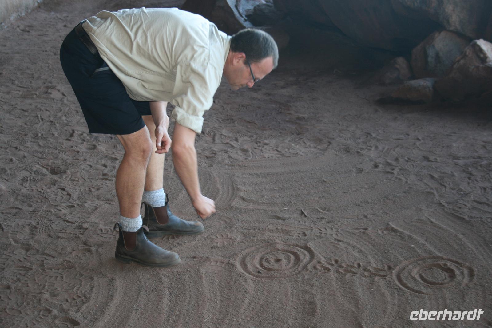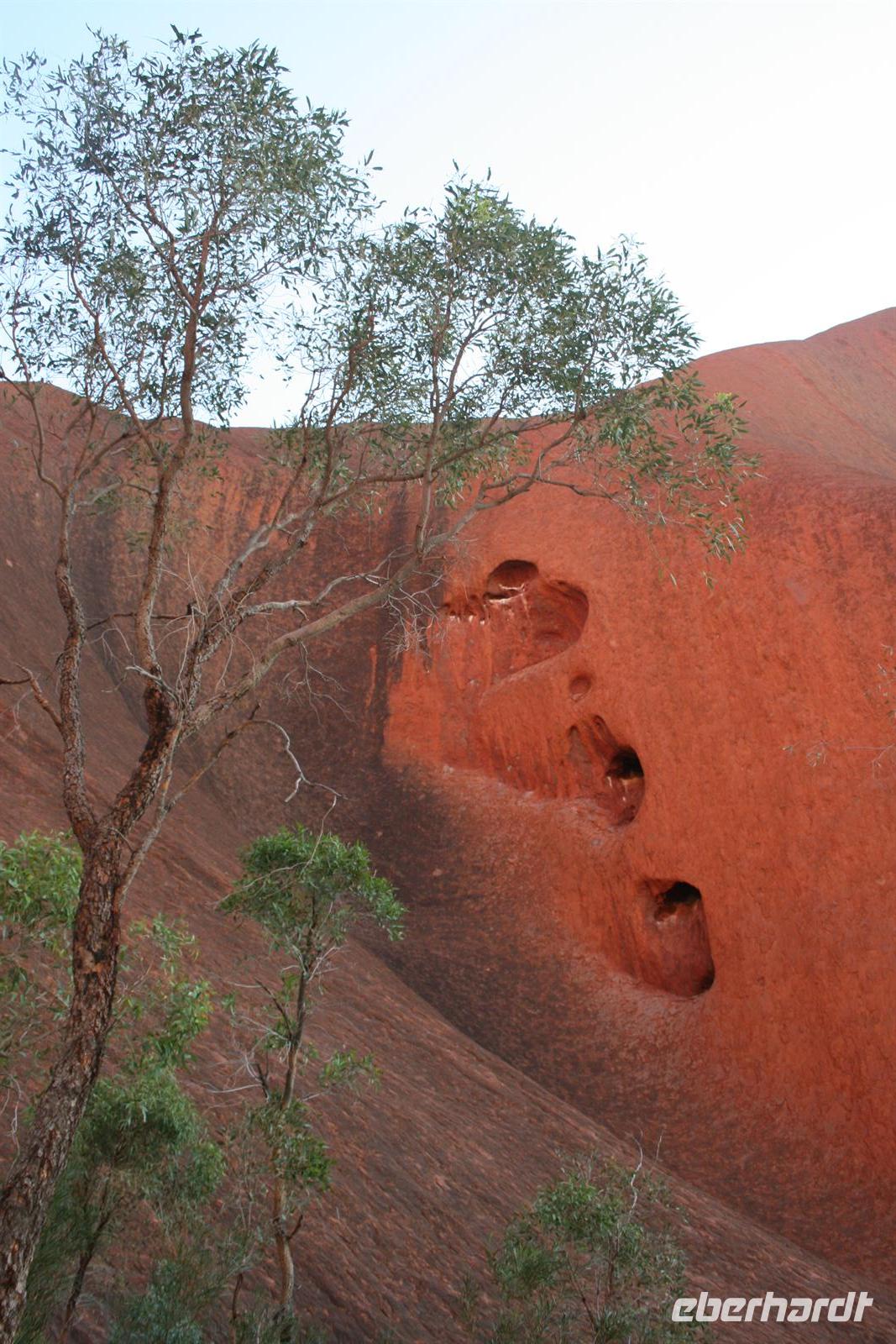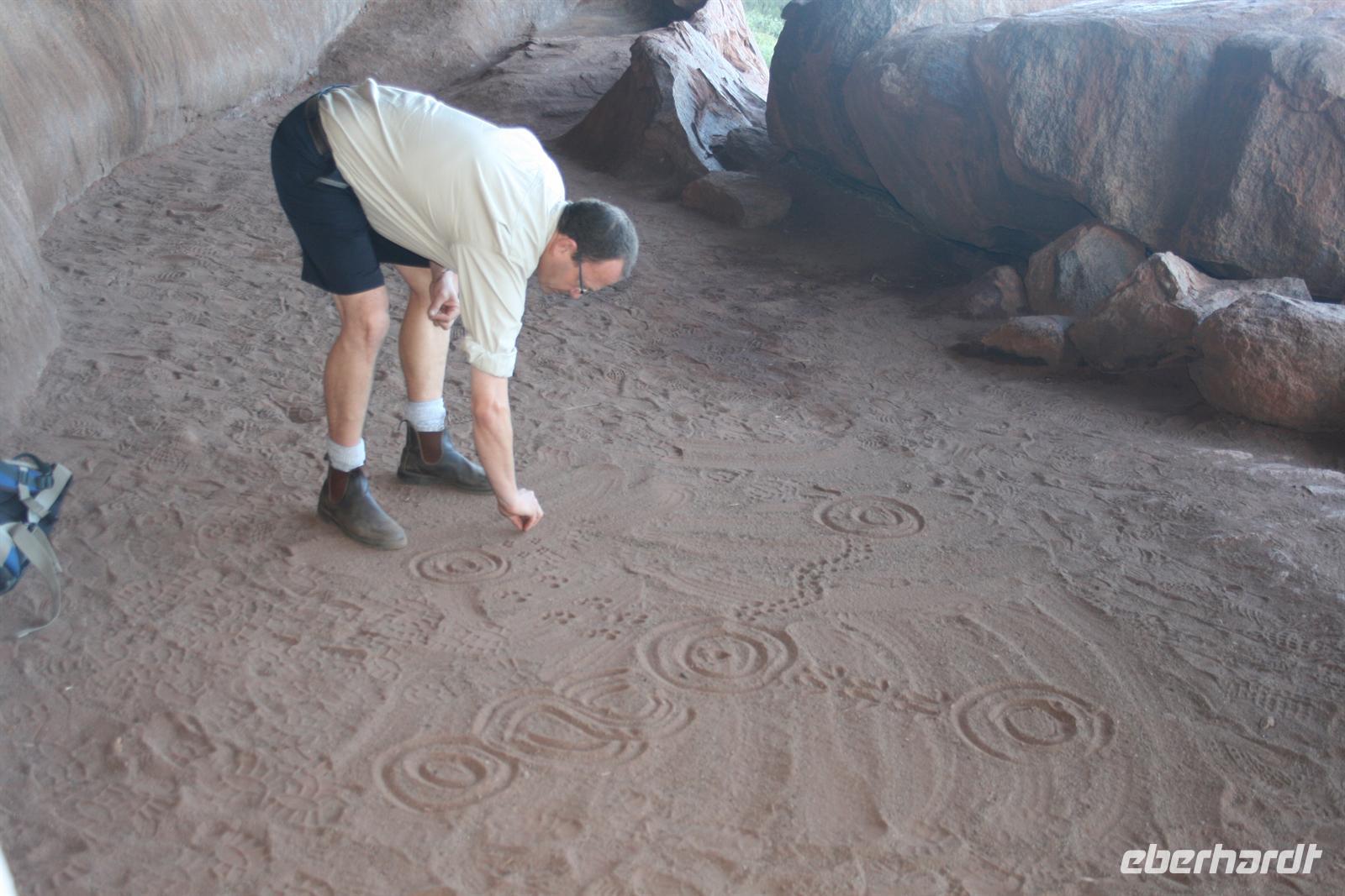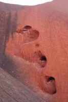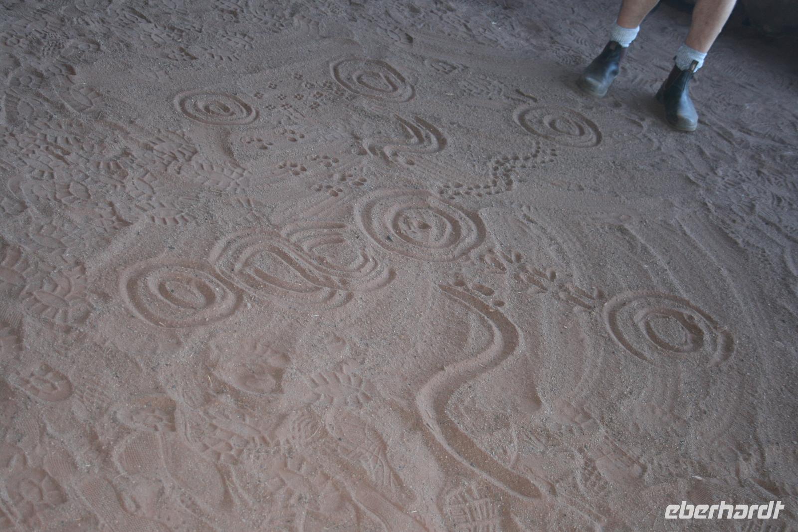 Heute hieß es schon früh aufstehen, denn schließlich wollten wir ja den Sonnenaufgang am Ayers Rock nicht verpassen. So fuhren wir 5 Uhr am Hotel los und hatten vor dem Sonnenaufgang 5.55 Uhr einen Kaffee oder Tee und eine Kleinigkeit im Magen. Auch beim Sonnenaufgang zeigte der Uluru ein schönes Farbenspiel und wurde auf unseren Bildern verewigt. Im Anschluss erzählte uns Karsten drei Geschichten der Aborigines, die sich laut ihrem Glauben am Uluru zugetragen haben. So gibt es eine Geschichte der blauzüngigen Eidechse, die einem Stamm den erlegten Emu stahl, und dafür nach einem Kampf vom Uluru stürzte und man heute noch ihre Hautspuren sehen kann. Oder die Mala Geschichte, die nach der kleinen Känguru-Art benannt ist, deren Existenz man immer noch am Zeremonienstab erkennen kann . Auch die Geschichte, wie der Ayers Rock entstanden sein soll, ist sehr niedlich. Man sagt nämlich der Uluru sei durch Kinder aus Schlamm geformt wurden und im Anschluss seien sie herunter gerutscht und haben so ihre Spuren im Berg hinterlassen. Karsten hat uns natürlich auch die geologische Erklärung geliefert: Erdplatten die einmal vertikal lagen wurden nach oben gedrückt, die Erosion hat Material abgetragen sodass die Berge mittlerweile abgerundet sind und die rote Farbe entsteht durch „Rost“, da das Gestein sehr eisenhaltig ist. Australiens Entstehungsgeschichte geht sehr weit zurück - 330 Millionen Jahre. Im Anschluss an die Erklärungen und kleinen Wanderungen besuchten wir das Kulturzentrum, in dem ebenfalls viele Informationen zur Kultur der Aborigines gegeben wird.
