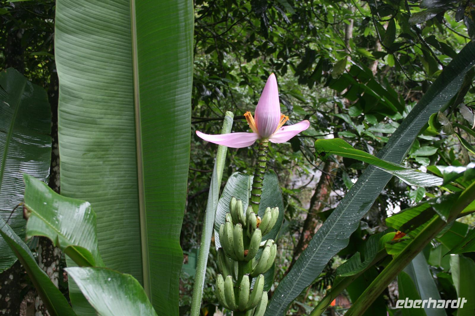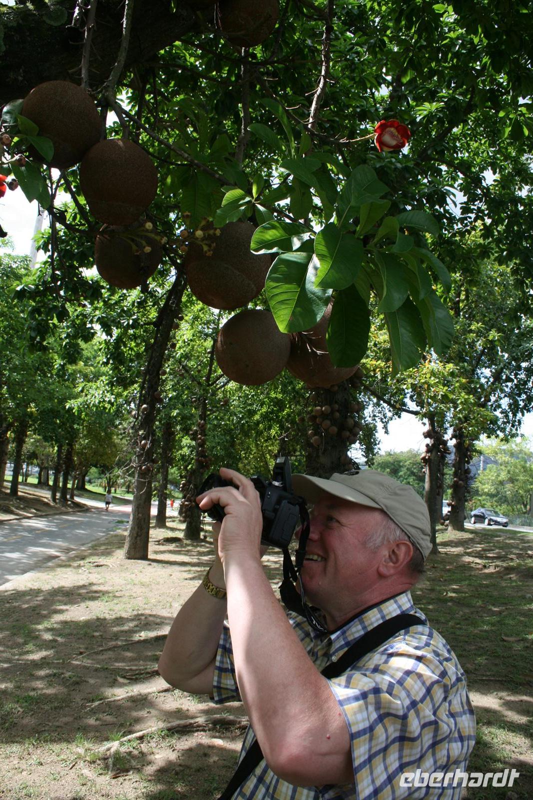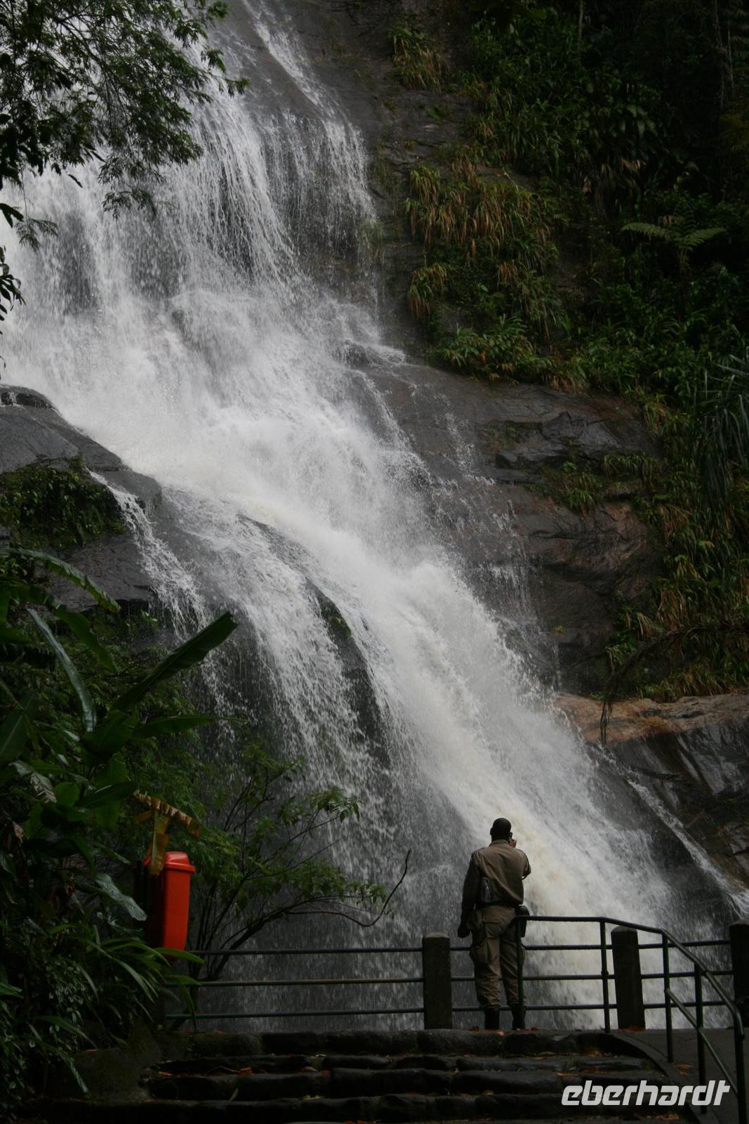Auch heute schien die Sonne 7 Uhr noch Schönheitsschlaf zu halten, aber so ist es eben in Rio - das Leben beginnt nicht so früh . So war es dann 9 Uhr bei unserer Abfahrt im Jeep fast trocken. Allerdings hätte auch kein Tropfen zwischen die Personen gepasst, so eng war es im Jeep, daher wurde dann beim ersten Stopp auch ein 2. Fahrzeug zur Verfügung gestellt. Wir fuhren in die Wolken und mussten daher leider auch auf die Aussicht verzichten, die der Nationalpark Tijuca eigentlich bietet. Wir fotografierten Wasserfälle und Bananenblüten und lauschten den Erklärungen unseres Führers Fabio. Nach einem Stopp im Besuchszentrum stand eine kleine Wanderung durch die tolle Flora des Regenwaldes auf dem Programm und dieser machte nun seinem Namen alle Ehre - es regnete wie aus Kannen. Natürlich sind Weltreisende gut ausgestattet und somit konnte sich jeder am Anfang vor dem Regen schützen, aber letztendlich wurden wir alle ein wenig nass. Der Regenwald hat aber dennoch alle in seinen Bann gezogen. Auf dem Rückweg gab es Stau und so waren wir 13.30 Uhr wieder zurück am Hotel. 15 Uhr hatten wir uns für einen kleinen Spaziergang verabredet - und das Wetter blieb uns hold.