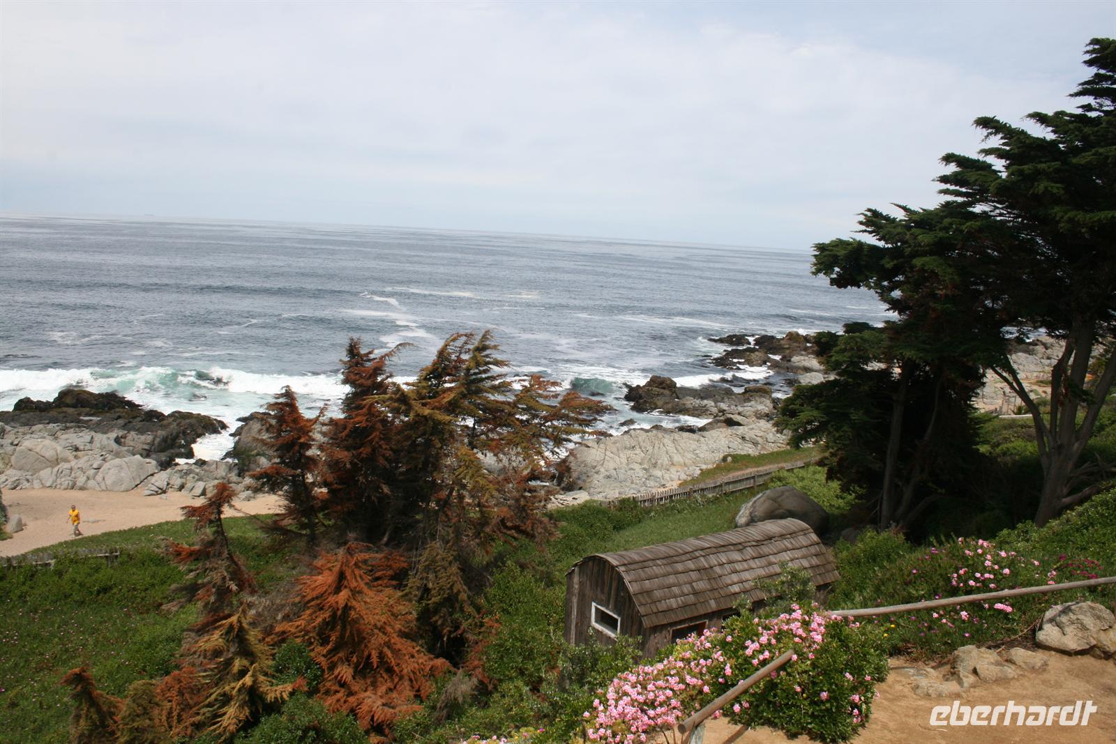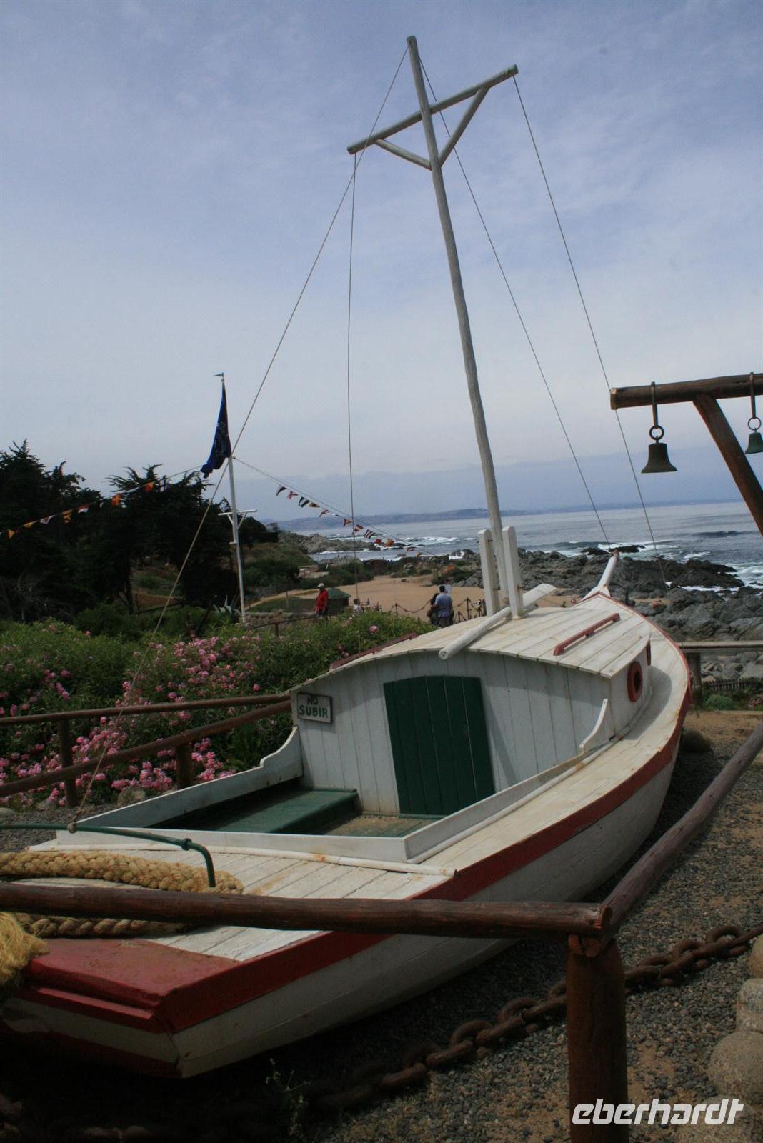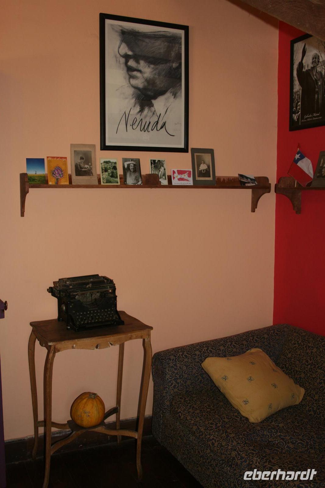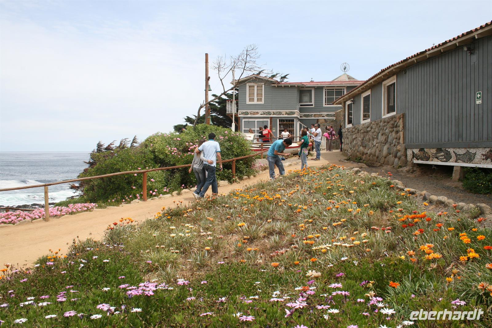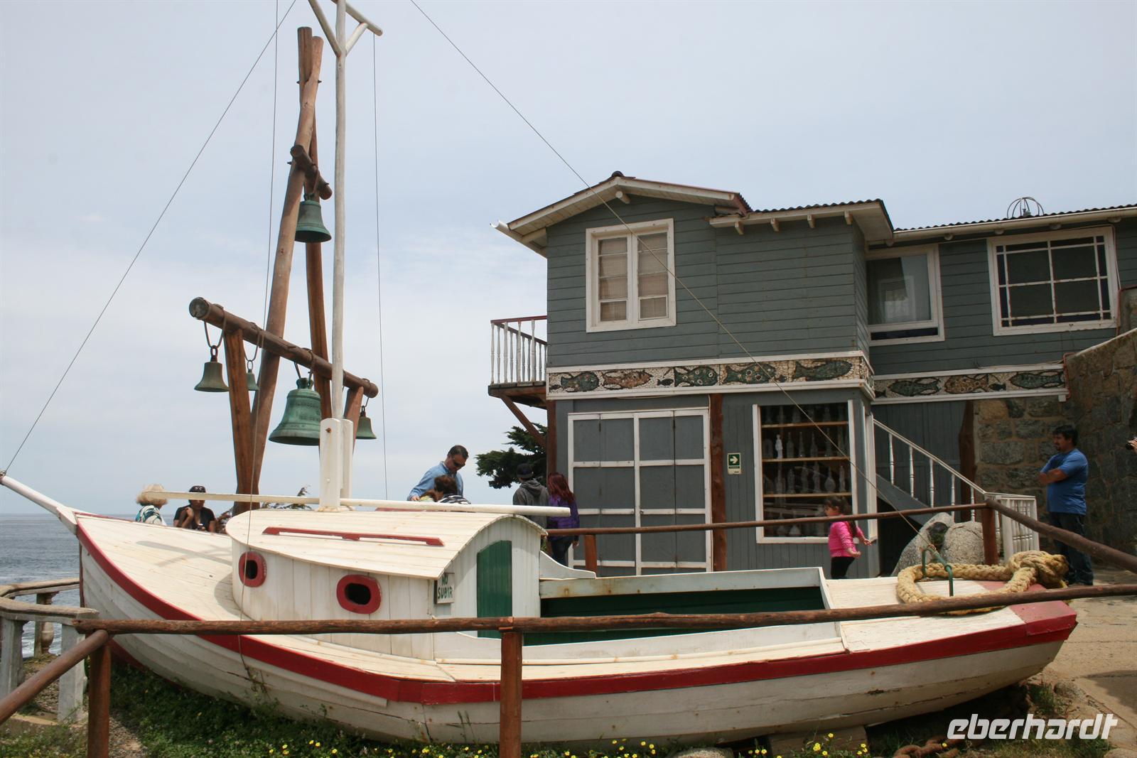Der heutige Tag startete etwas grau in Santiago und auch unsere Stimmung besserte sich erst im Lauf des Tages, denn wir bekamen einen sehr kleinen Bus für unseren Ausflug und es dauerte ein wenig, bis die Busfirma uns tatsächlich einen besseren, größeren Bus zur Verfügung stellte. Als wir diesen „besiedelt“ hatten, genossen wir die Fahrt durch das grüne Curacaví-Tal Richtung Isla Negra, wo Pablo Neruda eines seiner Häuser stehen hatte. Zur Einstimmung las ich eine Passage aus seinem Werk „Ich bekenne, ich habe gelebt“ vor, die uns die Besichtigung des Hauses noch eindrücklicher machte. Im Haus hatten wir eine englische Führung, die ich übersetzte. Und man kann sagen, der Nobelpreisträger für Literatur verstand es zu leben. Auch seine Sammelleidenschaft, ob Gallionsfiguren, Pfeifen oder Flaschen für seine Bar, ist heute zu unserem Vergnügen im Haus verewigt.