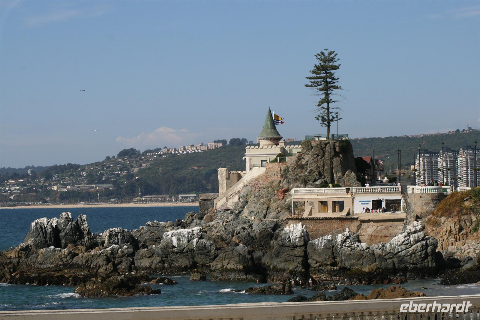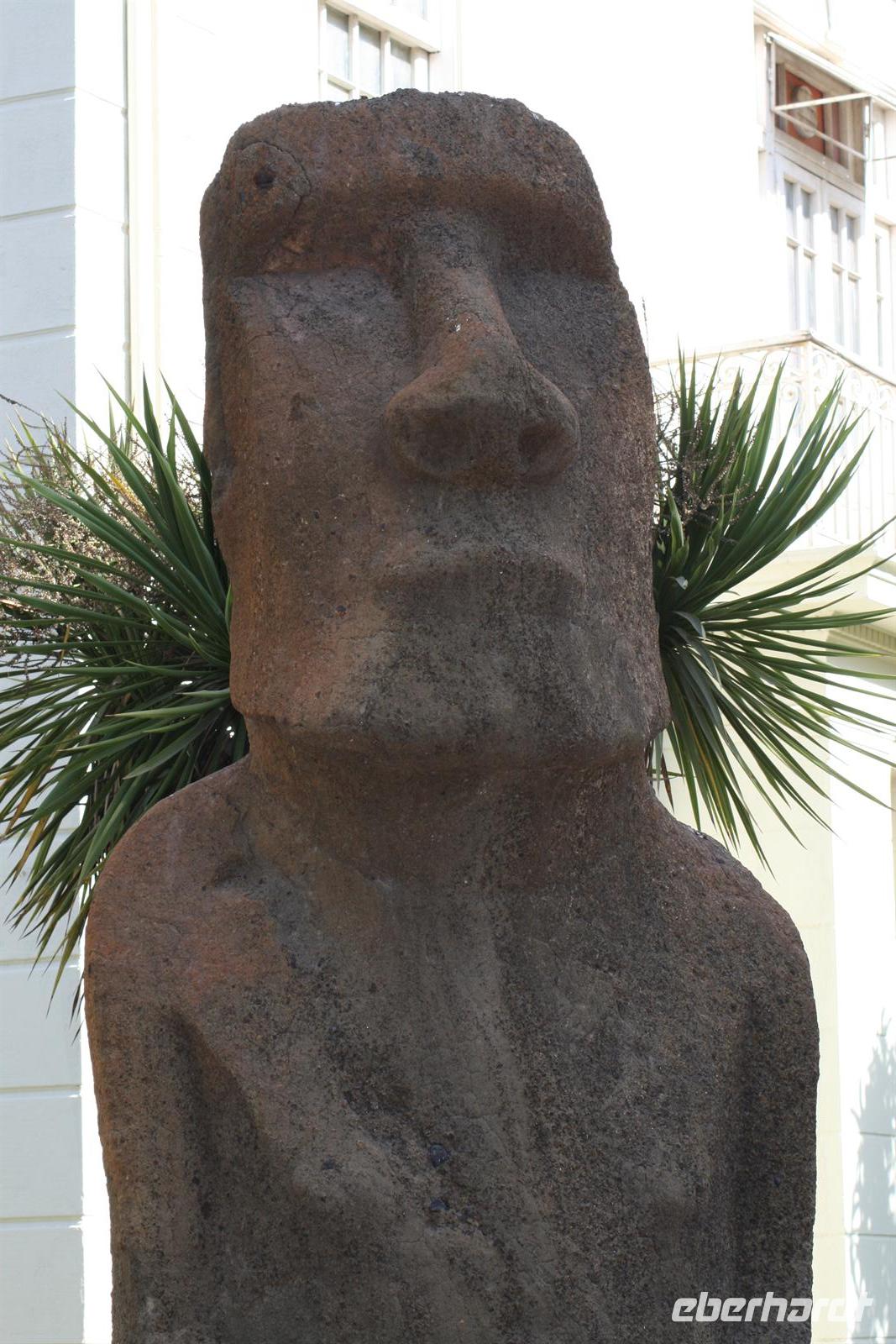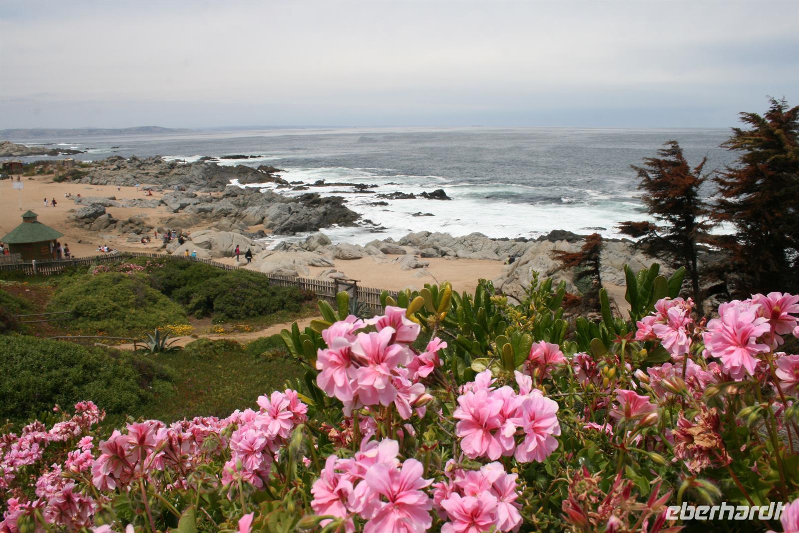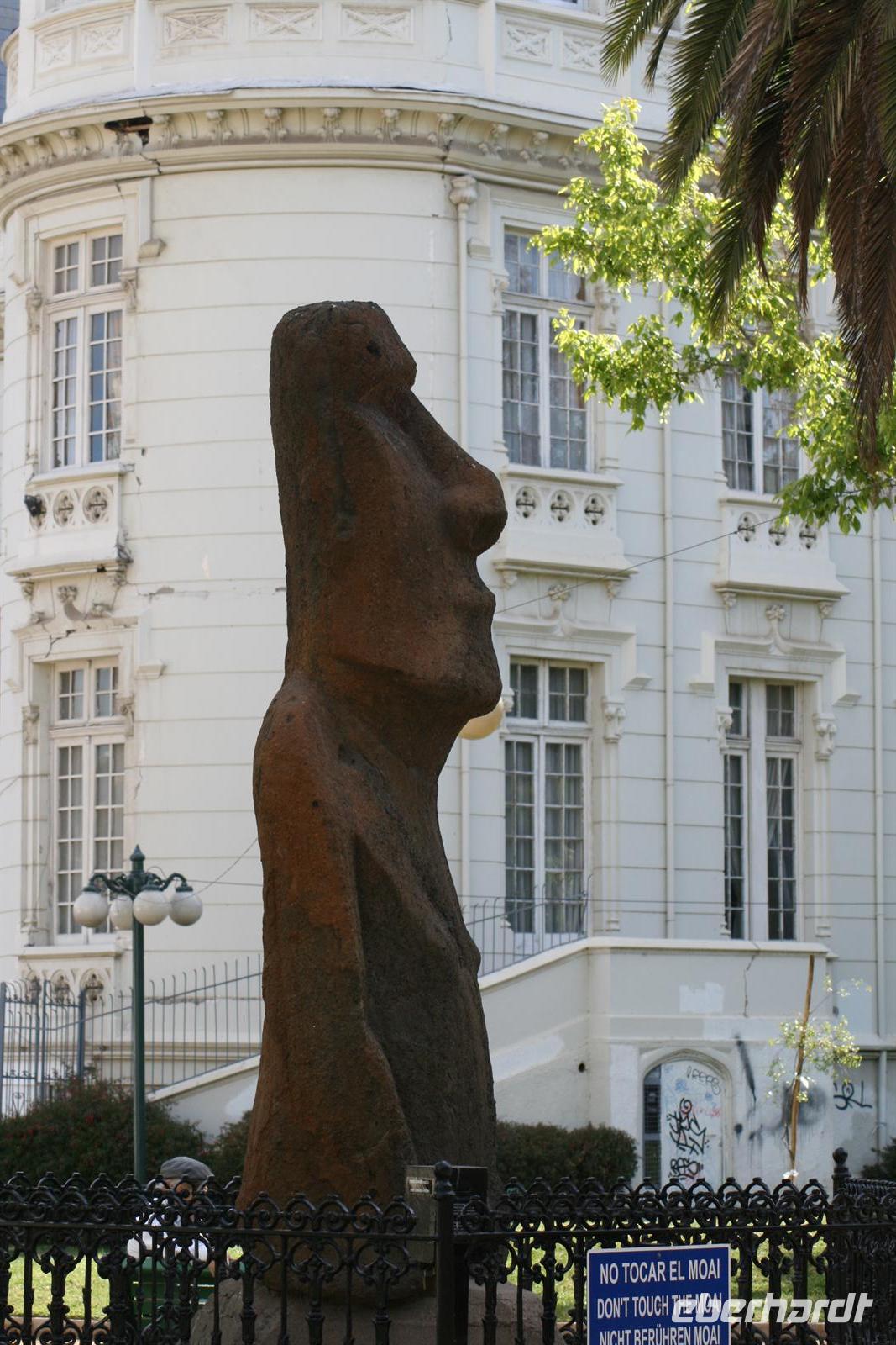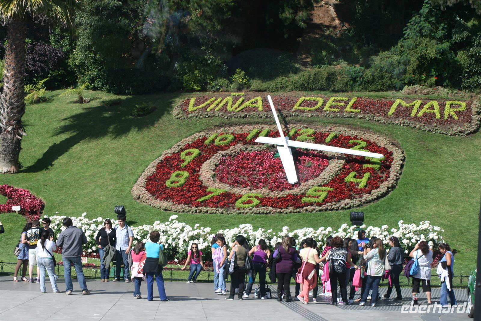 Und man kann sehr gut nachvollziehen, wie dieser herrliche Blick über den Garten zum Meer hinaus sein Schreiben beeinflusst hat. Nach diesem Besuch fuhren wir in ca. einer Stunde nach Valparaiso, um unser Mittagessen zu genießen. Wobei Genuss sicher der falsche Ausdruck ist, das Buffet war reichhaltig, aber die Geräuschkulisse sehr hoch und die Stimmung nicht gediegen. Ich hoffe, dass der Wein, der in Chile sehr lecker ist, ein wenig zu positiver Stimmung beigetragen hat. Danach legten wir einen Stopp am Hafen von Valparaiso ein und spazierten zur ältesten Standseilbahn der Welt, die noch manuell betrieben wird. Wenn die Fahrt auch nur sehr kurz ist, ist sie umso beeindruckender und der Blick über Valparaiso ist schön. Wir fuhren nach Vina del Mar, zu dem es quasi keine Grenze gibt, denn die 2 Städte verschmelzen miteinander. Wir sahen aus dem Bus die hübsche Blumenuhr sowie wichtige Bauwerke des Ortes. Einen Fotostopp legten wir an der einzigen Statue der Osterinsel auf dem Festland ein. Das gegenüberliegende Geschäft mit Schmuck aus Kupfer und Lapislazuli konnte auch einige unserer Gäste begeistern. Der abschließende kurze Spaziergang im Park Quinta Vergara zeigte uns noch einmal die schöne grüne Seite der Küstenstädte. Der heutige Tag war lang, und da auch das Abendessen recht spät war, trafen wir uns nicht zum Essen, sondern einem kleinen Umtrunk mit chilenischem Wein in der Bar - lecker lecker .