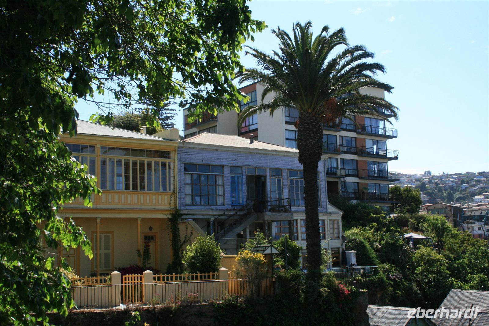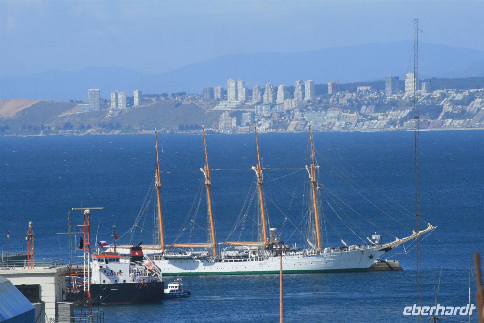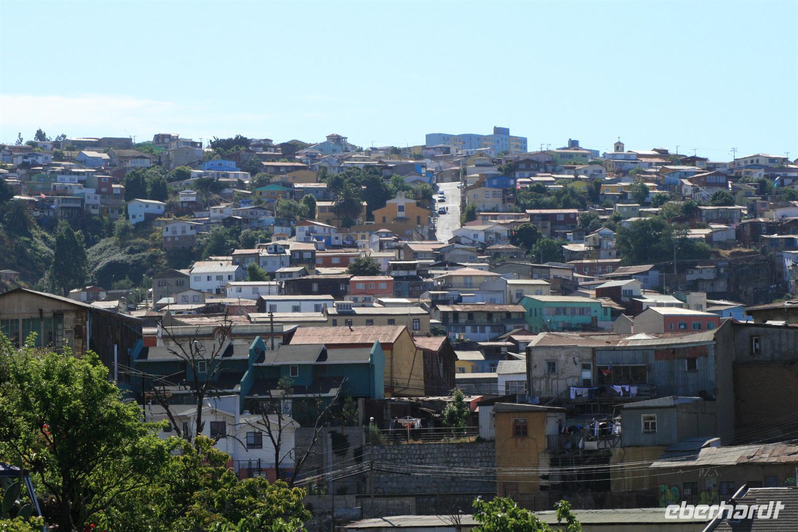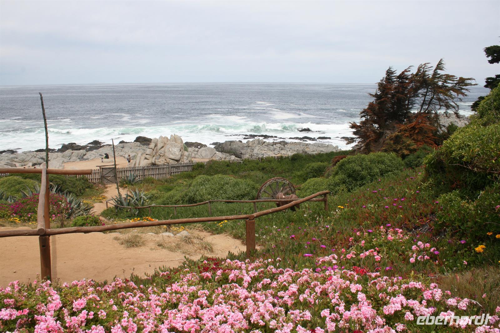 Und man kann sehr gut nachvollziehen, wie dieser herrliche Blick über den Garten zum Meer hinaus sein Schreiben beeinflusst hat. Nach diesem Besuch fuhren wir in ca. einer Stunde nach Valparaiso, um unser Mittagessen zu genießen. Wobei Genuss sicher der falsche Ausdruck ist, das Buffet war reichhaltig, aber die Geräuschkulisse sehr hoch und die Stimmung nicht gediegen. Ich hoffe, dass der Wein, der in Chile sehr lecker ist, ein wenig zu positiver Stimmung beigetragen hat. Danach legten wir einen Stopp am Hafen von Valparaiso ein und spazierten zur ältesten Standseilbahn der Welt, die noch manuell betrieben wird. Wenn die Fahrt auch nur sehr kurz ist, ist sie umso beeindruckender und der Blick über Valparaiso ist schön. Wir fuhren nach Vina del Mar, zu dem es quasi keine Grenze gibt, denn die 2 Städte verschmelzen miteinander. Wir sahen aus dem Bus die hübsche Blumenuhr sowie wichtige Bauwerke des Ortes. Einen Fotostopp legten wir an der einzigen Statue der Osterinsel auf dem Festland ein. Das gegenüberliegende Geschäft mit Schmuck aus Kupfer und Lapislazuli konnte auch einige unserer Gäste begeistern. Der abschließende kurze Spaziergang im Park Quinta Vergara zeigte uns noch einmal die schöne grüne Seite der Küstenstädte. Der heutige Tag war lang, und da auch das Abendessen recht spät war, trafen wir uns nicht zum Essen, sondern einem kleinen Umtrunk mit chilenischem Wein in der Bar - lecker lecker .