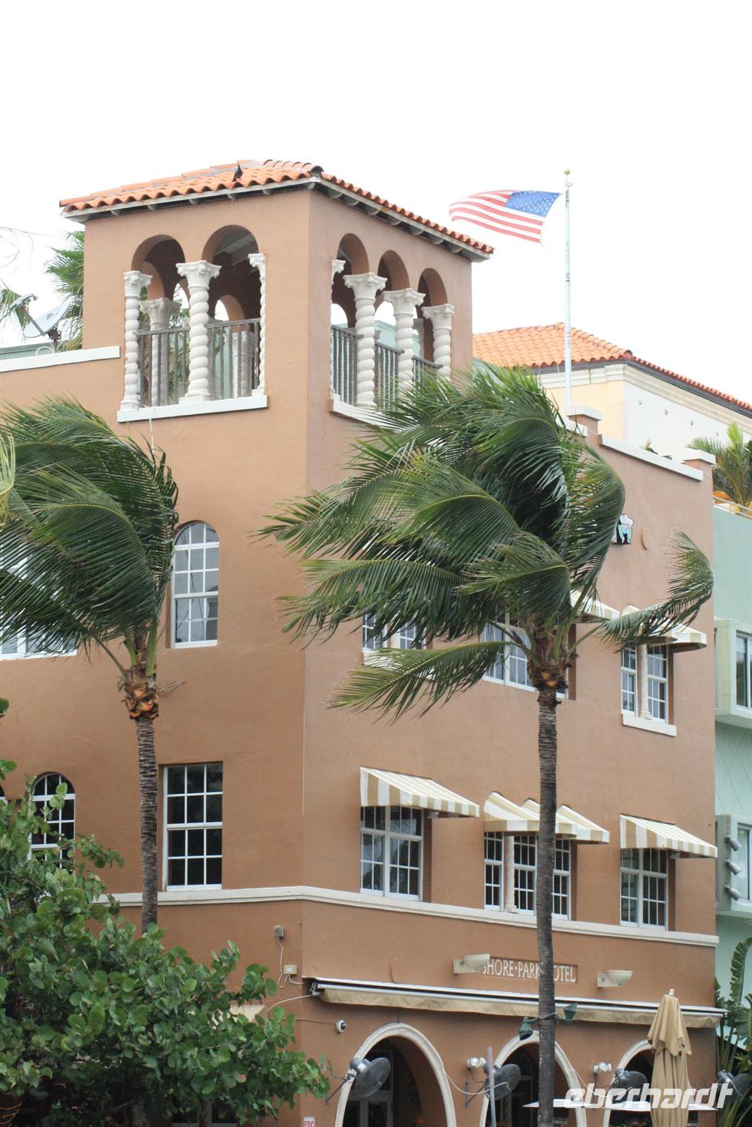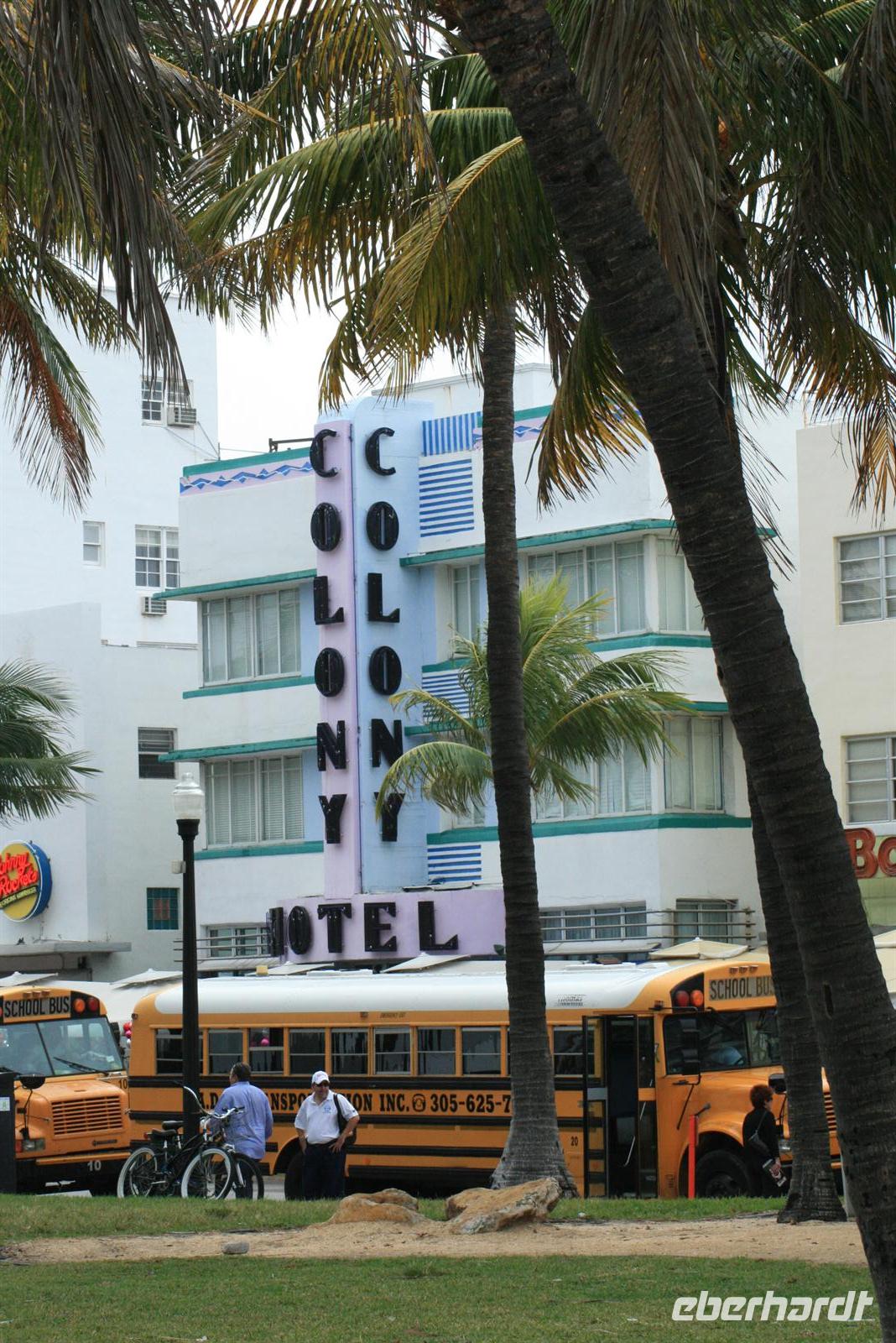Noch im Dunkeln erreichten wir Miami und beim Landeanflug konnte man die typisch rechteckige Anordnung einer amerikanischen Stadt sehen. Die Einreise mit Fingerabdruck und Foto zusätzlich zur Passkontrolle und vorherigen Registrierung im Internet dauerte natürlich recht lang, aber ohne „Zwischenfälle“ konnten alle in die Vereinigten Staaten einreisen. Irgendwie verfolgte uns der Regen, denn auch heute goss es in immer kleineren Abständen wie aus Gießkannen. Zuerst einmal machten wir uns im Hotel frisch und stärkten uns am Frühstücksbuffet - also Omelette können die Amerikaner hervorragend. Was uns alle überraschte, denn wir waren ja mehr oder weniger „Amerika-Frischlinge“, war die Tatsache, dass im Süden von Florida, also um Miami teilweise nur spanisch gesprochen wird. Dies erlebten wir auf unserer Fahrt nach Cocoa Beach, wo wir die erste Nacht in Amerika verbrachten. Auf dem Weg dorthin besuchten wir das berühmte Art Deco-Viertel und beobachteten das Treiben auf dem berühmten Ocean Drive. Am Biltmore Hotel, einem Nobelhotel aus den 1920ern im Gebiet Coral Gables legten wir einen Stopp ein. Beim nächsten Stopp stärkten wir uns mit einem guten Kaffee. Am späten Nachmittag trafen wir nach ca. 4 Stunden im Hilton Hotel ein. Das Abendessen im Hotel schmeckte sehr gut und bald legten wir unsere müden Häupter nieder, denn die letzte Nacht im Flieger steckte uns doch noch in den Knochen.