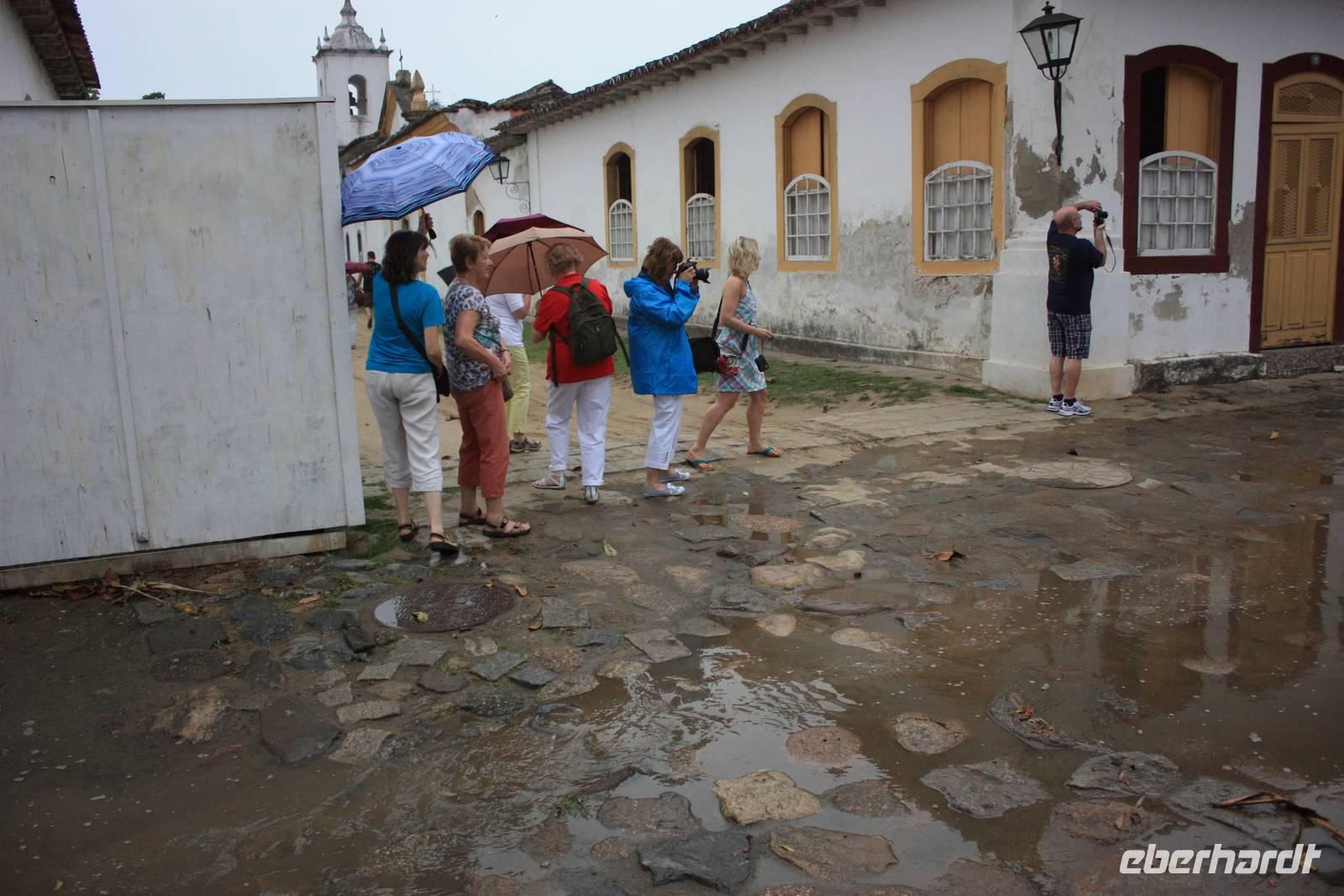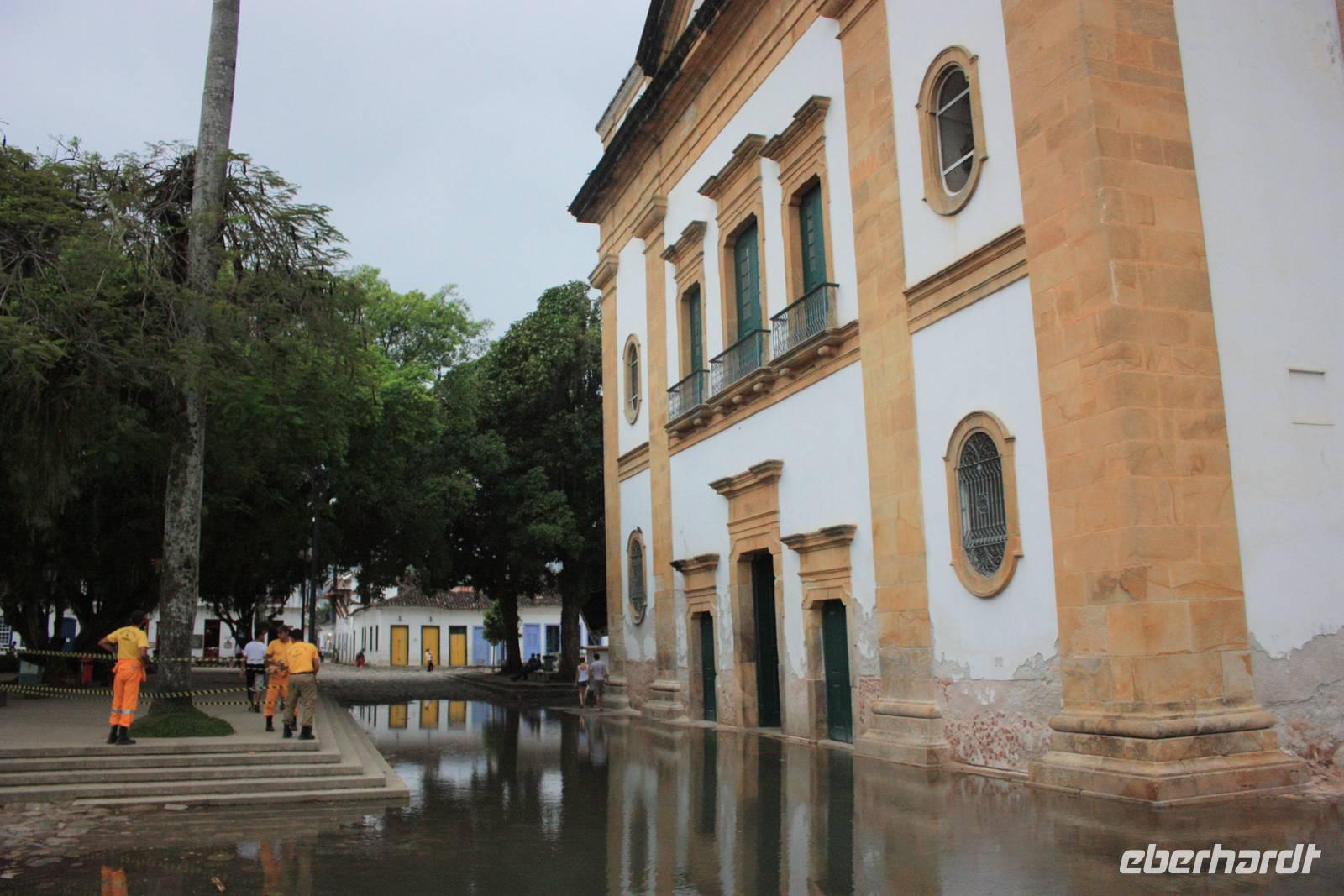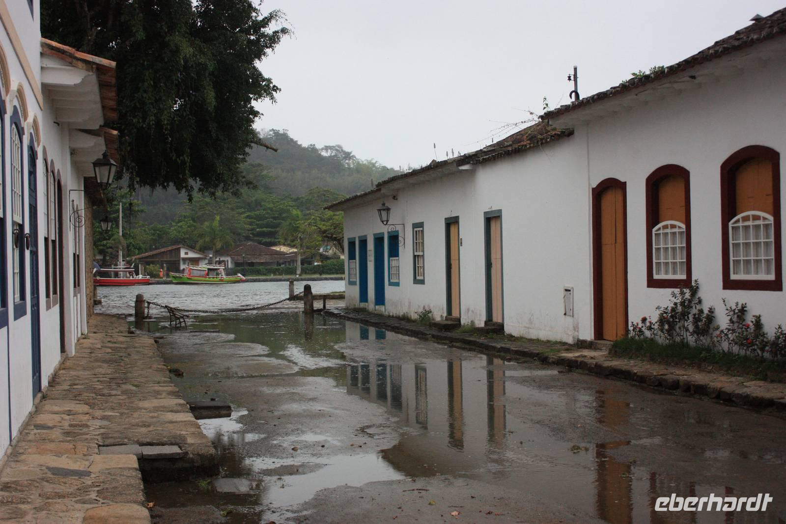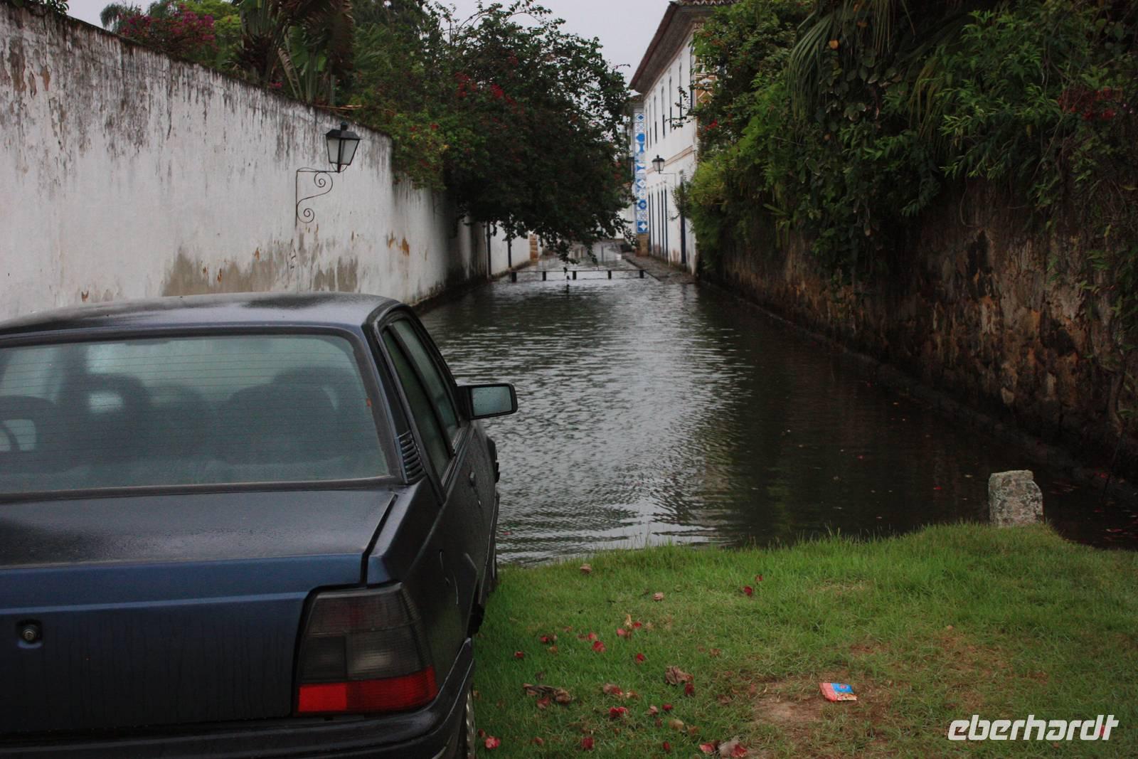 Nun sind die Zimmer auch fertig: Schlicht brasilianisch eingerichtet, sauber und ordentlich.. man kann nicht meckern. Nach einer großzügigen Siesta geht es auch schon weiter mit dem eigentlichen Rundgang durch Paraty. Kaum haben wir uns an der Rezeption eingefunden, kommt schon das erste Highlight, das sogar unseren Reiseleiter Maik überrascht. Er hatte schon einigen Gruppen von der Gezeitenströmung erzählt, aber noch nie konnte er es pünktlich aufs Stichwort zeigen. Er erklärt uns die mit dem Naturphänomen verbundene Besonderheit dieses Ortes. Die Einwohner von Paraty hatten sich die Flut damals zum Vorteil gemacht um Fäkalien täglich ohne jeden Umstand zu entsorgen. Für uns bedeutet der steigende Wasserpegel jedoch nur, dass wir zusehen müssen, wie wir die Straßen überqueren. Die Bordsteinkanten sind genau an das Wasserlevel angepasst, die Straßen selbst werden regelmäßig im 12-Stunden-Takt geflutet und sind interessante Fotomotive. Paraty hat seinen brasilianischen Reiz behalten. Die Häuserfassaden sind typisch weiß gestrichen und bilden einen tollen Kontrast zu den blauen, türkisen und manchmal auch roten Tür- und Fensterrahmen.
