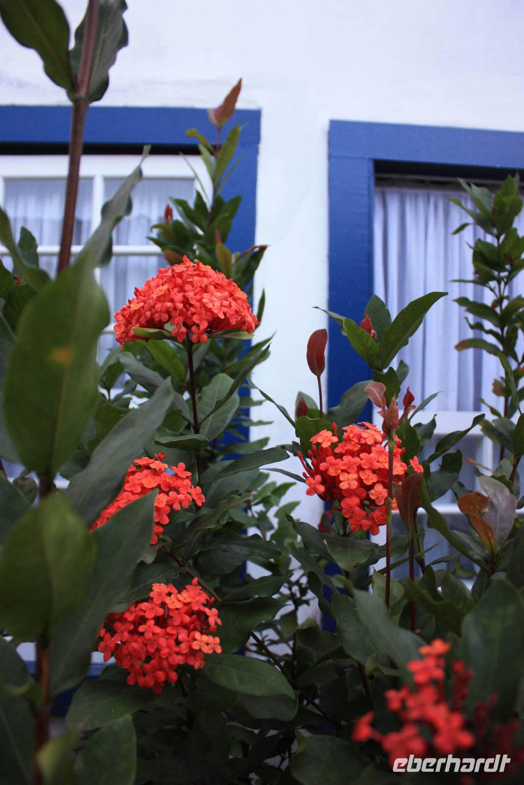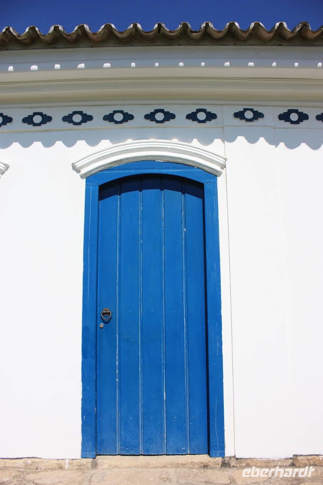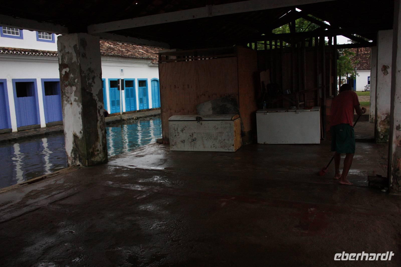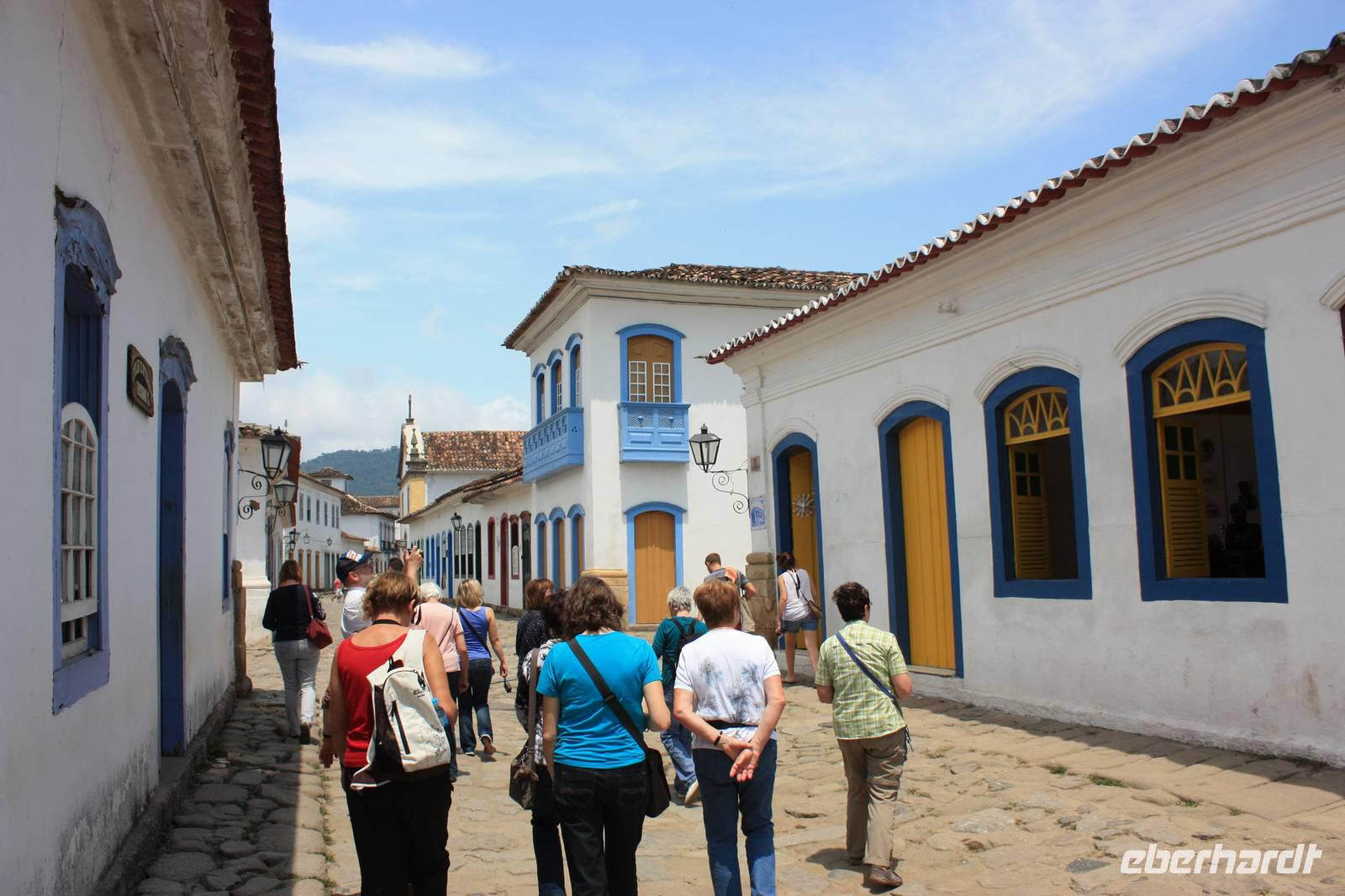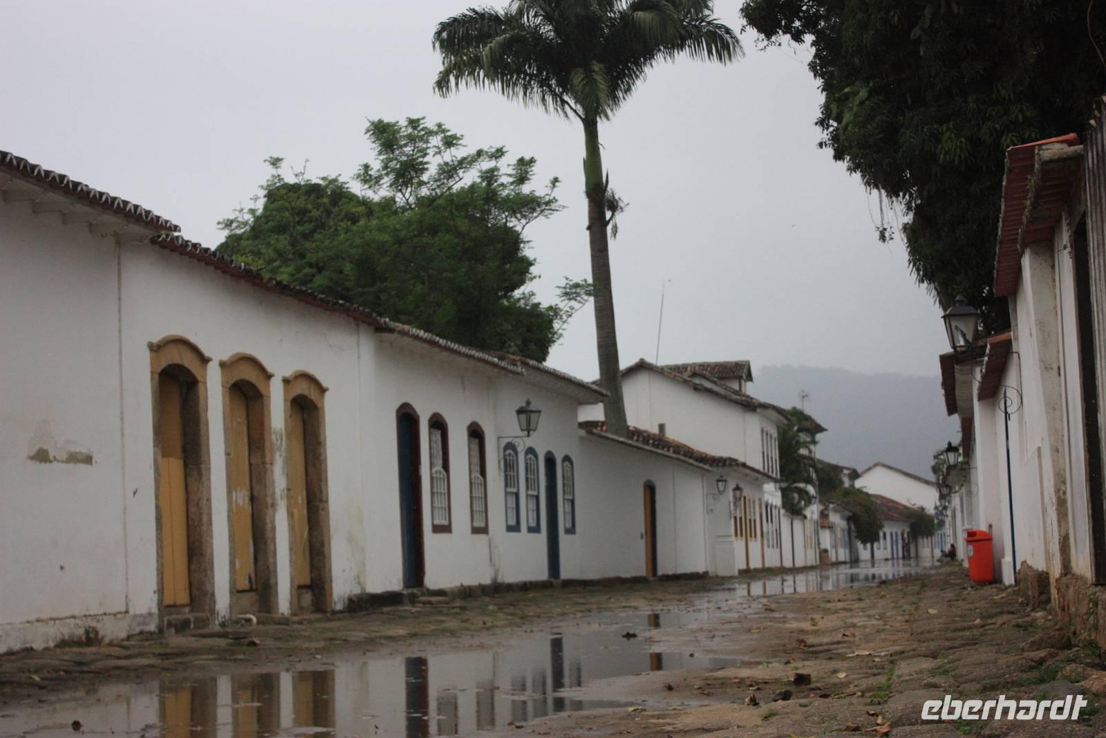 Nun sind die Zimmer auch fertig: Schlicht brasilianisch eingerichtet, sauber und ordentlich.. man kann nicht meckern. Nach einer großzügigen Siesta geht es auch schon weiter mit dem eigentlichen Rundgang durch Paraty. Kaum haben wir uns an der Rezeption eingefunden, kommt schon das erste Highlight, das sogar unseren Reiseleiter Maik überrascht. Er hatte schon einigen Gruppen von der Gezeitenströmung erzählt, aber noch nie konnte er es pünktlich aufs Stichwort zeigen. Er erklärt uns die mit dem Naturphänomen verbundene Besonderheit dieses Ortes. Die Einwohner von Paraty hatten sich die Flut damals zum Vorteil gemacht um Fäkalien täglich ohne jeden Umstand zu entsorgen. Für uns bedeutet der steigende Wasserpegel jedoch nur, dass wir zusehen müssen, wie wir die Straßen überqueren. Die Bordsteinkanten sind genau an das Wasserlevel angepasst, die Straßen selbst werden regelmäßig im 12-Stunden-Takt geflutet und sind interessante Fotomotive. Paraty hat seinen brasilianischen Reiz behalten. Die Häuserfassaden sind typisch weiß gestrichen und bilden einen tollen Kontrast zu den blauen, türkisen und manchmal auch roten Tür- und Fensterrahmen.