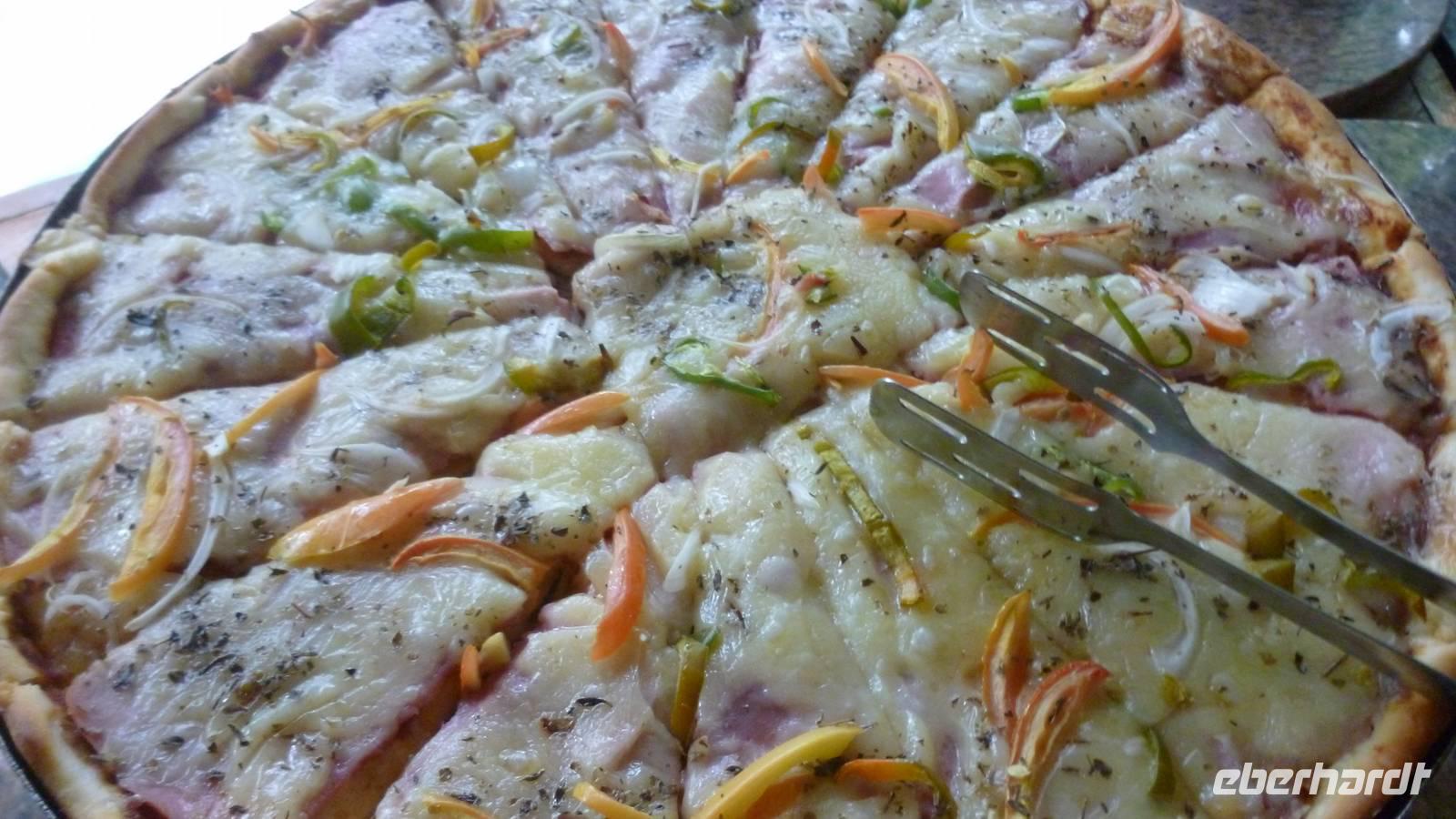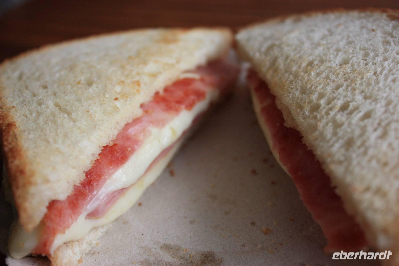 Da unsere Zimmer erst in zwei Stunden bezugsfertig sind vertreiben wir uns die Zeit bei einem ersten Bummel durch Paraty und werden auch den kleinen Mittagshunger los: Die etwas lieblos eingerichteten Bistros erweisen sich als tolle Anlaufstelle für einen herzhaften Snack. Wir probieren die sogenannten "Misto Quente" (=heiße Mischung), im Prinzip Sandwiches aus Toast mit Schinken und Käse überbacken. Schlicht, aber lecker! Dazu gibt es Orangensaft, der frisch und live vor unseren Nasen gepresst wird, eine bessere Erfrischung gibt es bei diesen schwülen Temperaturen gar nicht. Dennoch sehnen wir uns nach einer kalten Dusche und einem gemütlichen Bett.