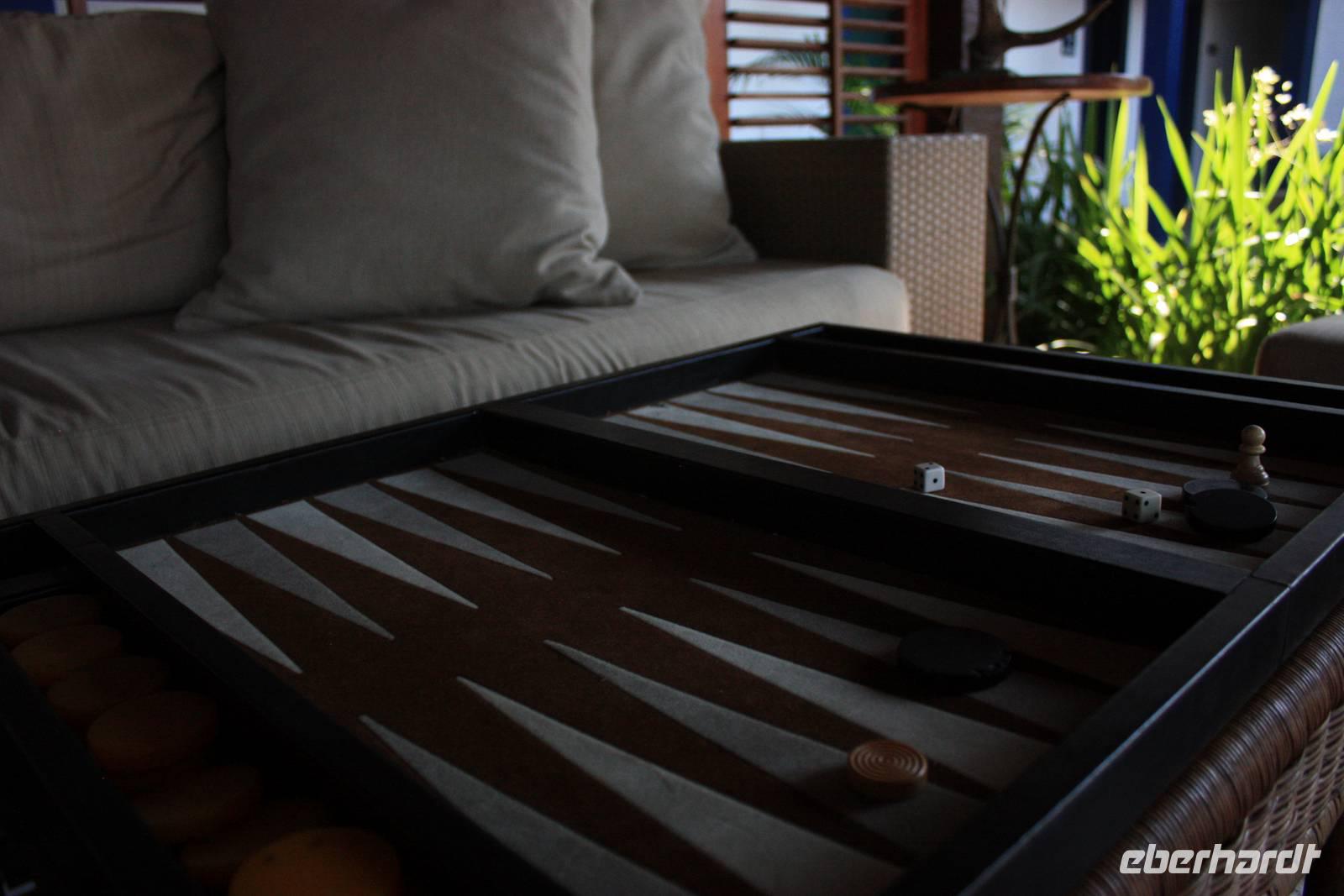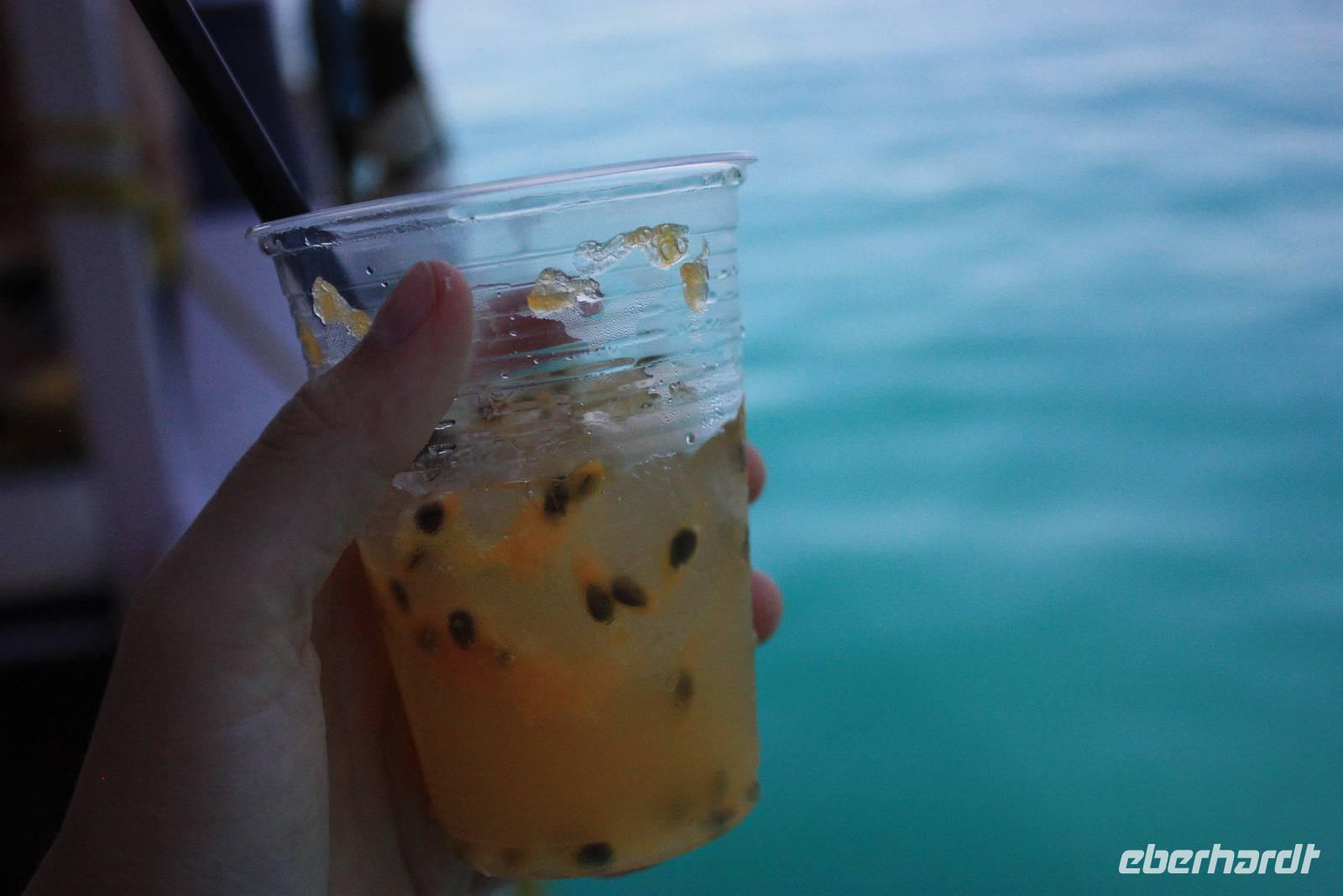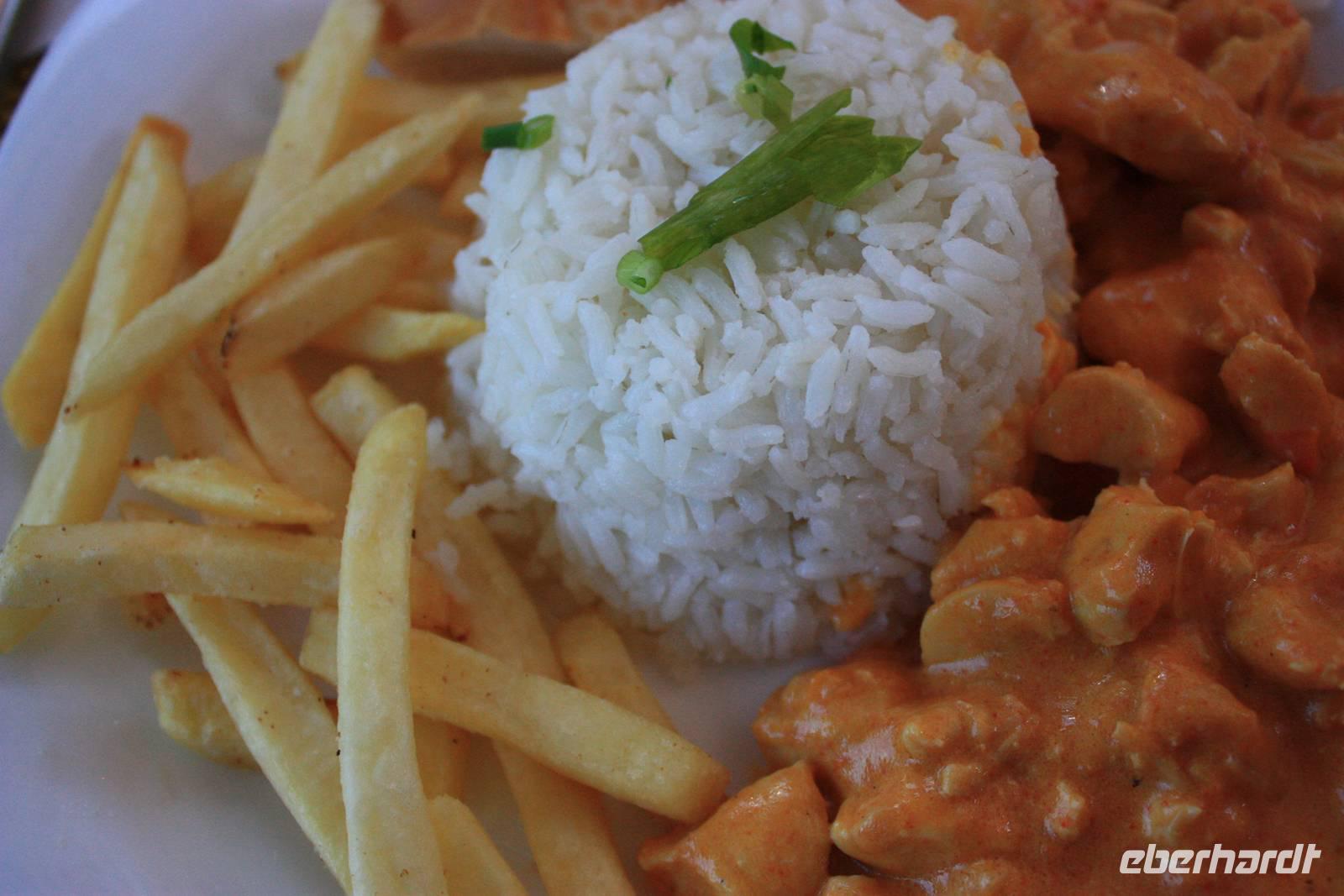 Nach dem vielen Schwimmen und Planschen wird es Zeit für das Mittagessen. Zur Auswahl stehen zwei Fischgerichte, zum Beispiel "Moqueca de peixe" und ein Hühnchengericht. Egal für welches wir uns entscheiden, es schmeckt toll! Dazu gönnen wir uns einen erfrischenden Caipi-Maracuja.