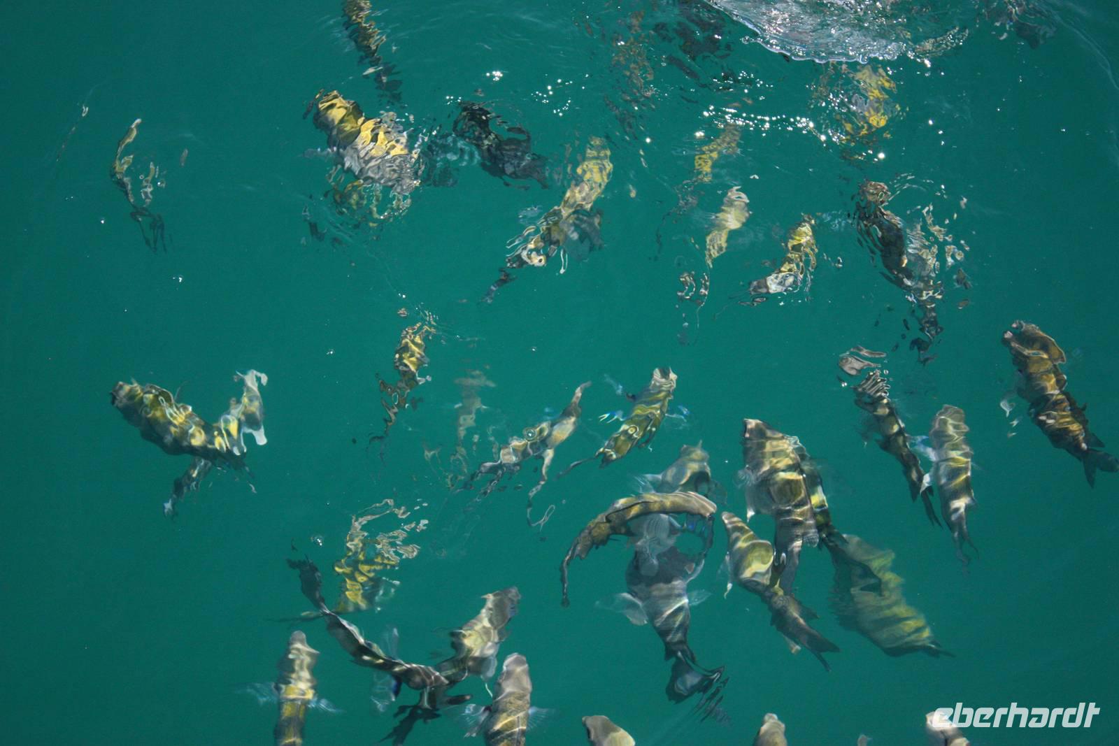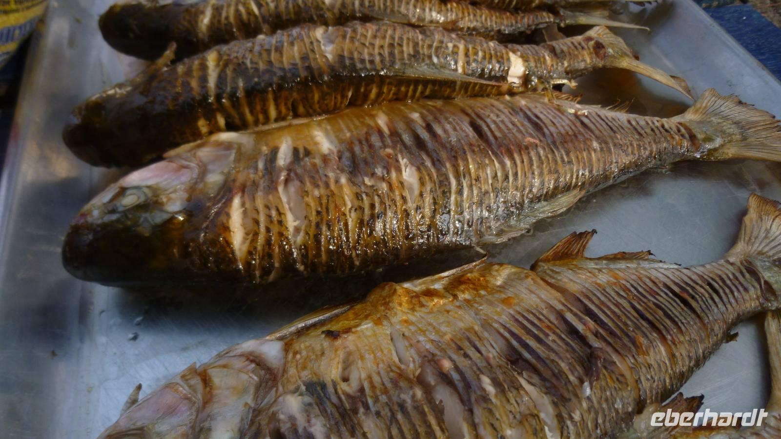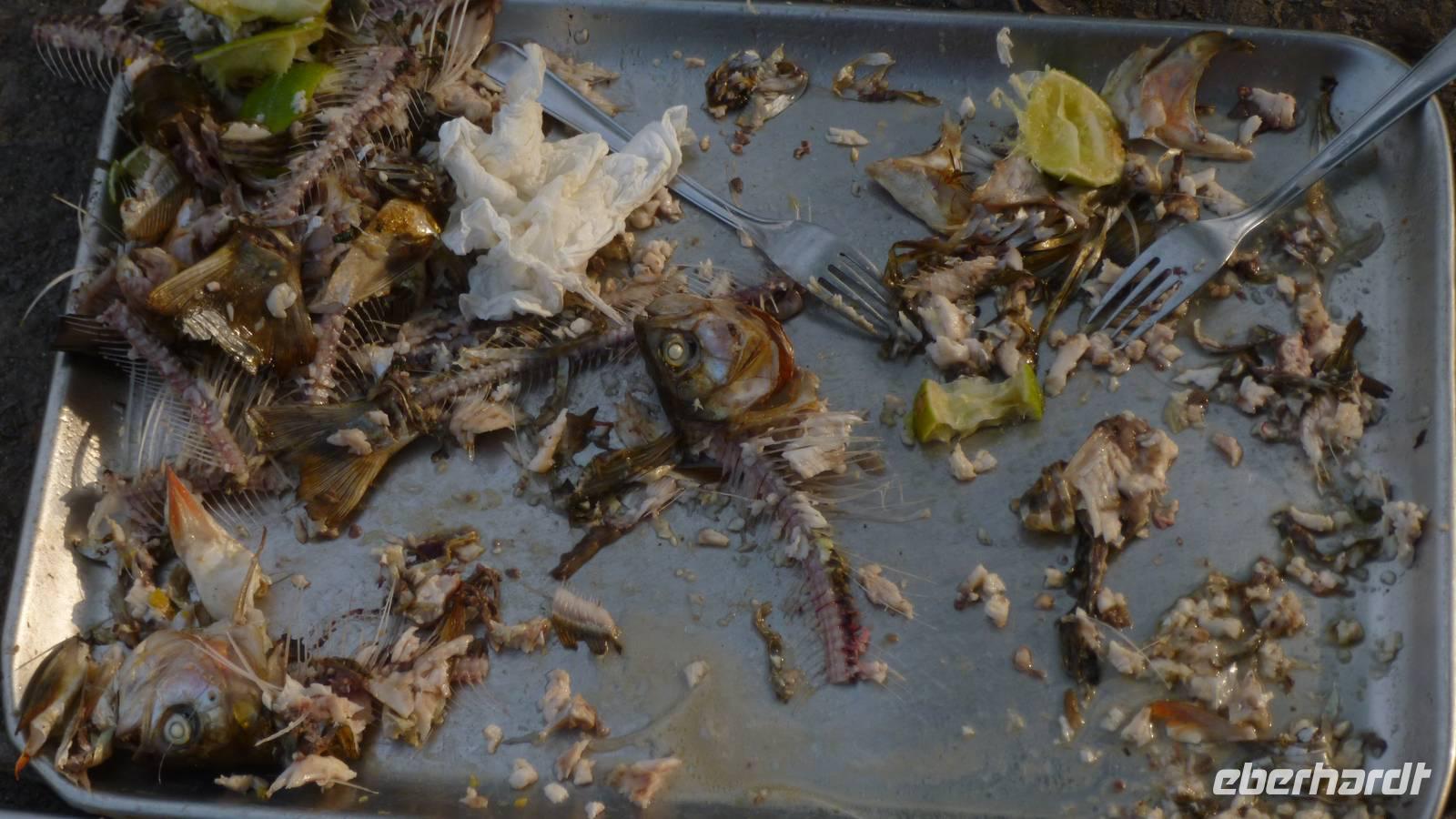 Der Fisch schmeckt toll! Dabei ist er nicht einmal richtig gewürzt wurden, der Eigengeschmack reicht schon völlig aus. Wenig später sind von dem Schmaus nur noch die Krähten übrig.