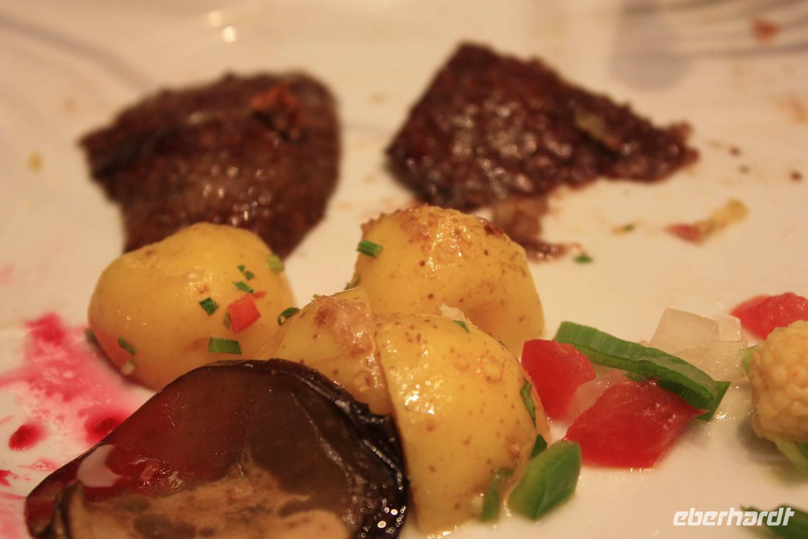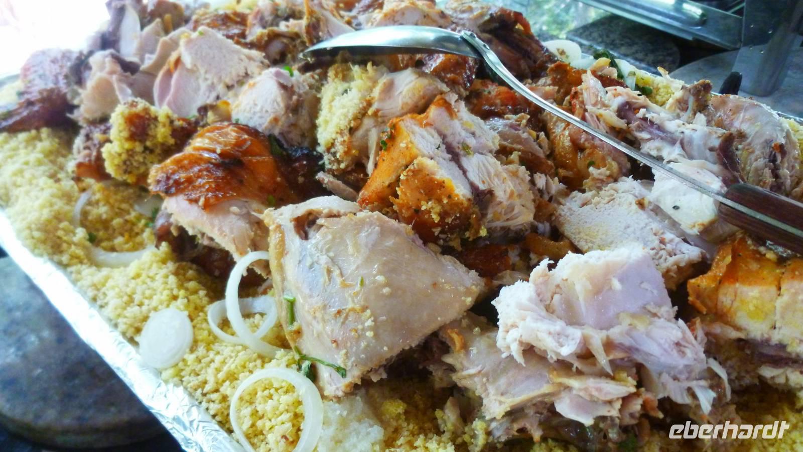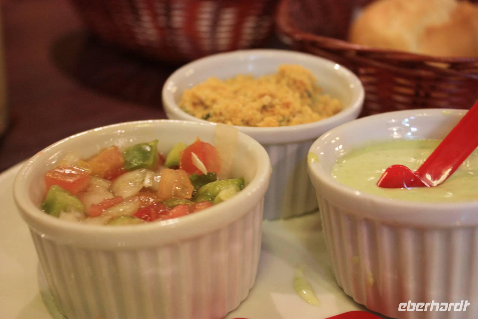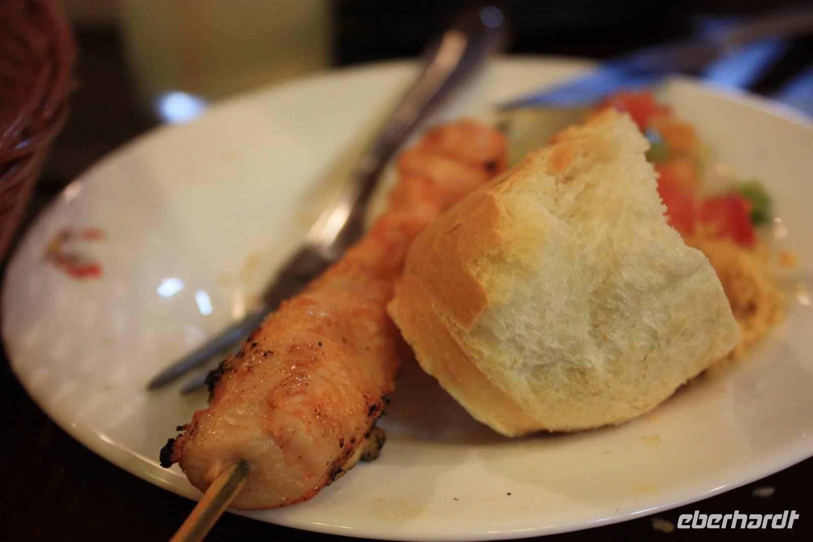 Doch dann kommt der Ahh-Moment: Genau das ist das Prinzip dieses Restaurants: Churrasco rodizio. Die unterschiedlichen Spießvariationen werden einfach gegrillt und dann präsentiert - es verkauft sich schon irgendwie. Also greifen wir dann doch zu. Die Fleischspieße sind super. Dazu gibt es geschmortes Gemüse, Couscous und Brot, und für diejenigen, die sich mit ihrem Zimmerpartner einigen können, auch einen leckeren Knoblauchdip.