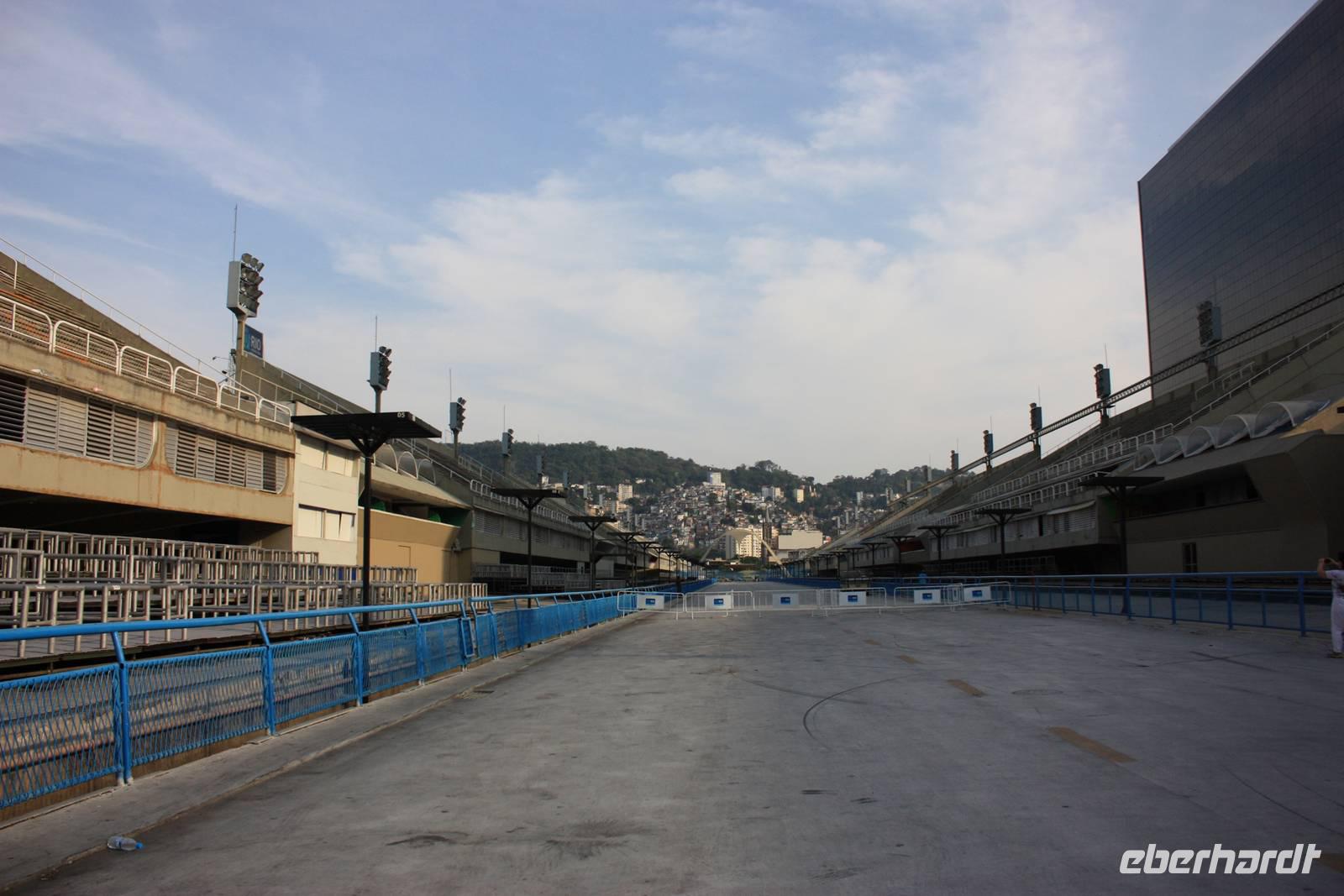 Über 900 Meter erstrecken sich die Tribünen an beiden Seiten der Straße des Sambodromo, wo im Februar die Parade des Jahres stattfindet. 12 Sambaschulen aus Rio und anderen Städten treten hier gegeneinander an. Was für uns wie ein schöner großer Festumzug aussieht, ist für die Schulen ein harter Wettkampf, denn es steht viel Geld auf dem Spiel und noch viel wichtiger: die Ehre der Sambaschule. Bei diesem Wettstreit bewertet die Jurie alles, von den Umzugswagen,Tänzern und Kostümen bis hin zum Liedtext und der Band.