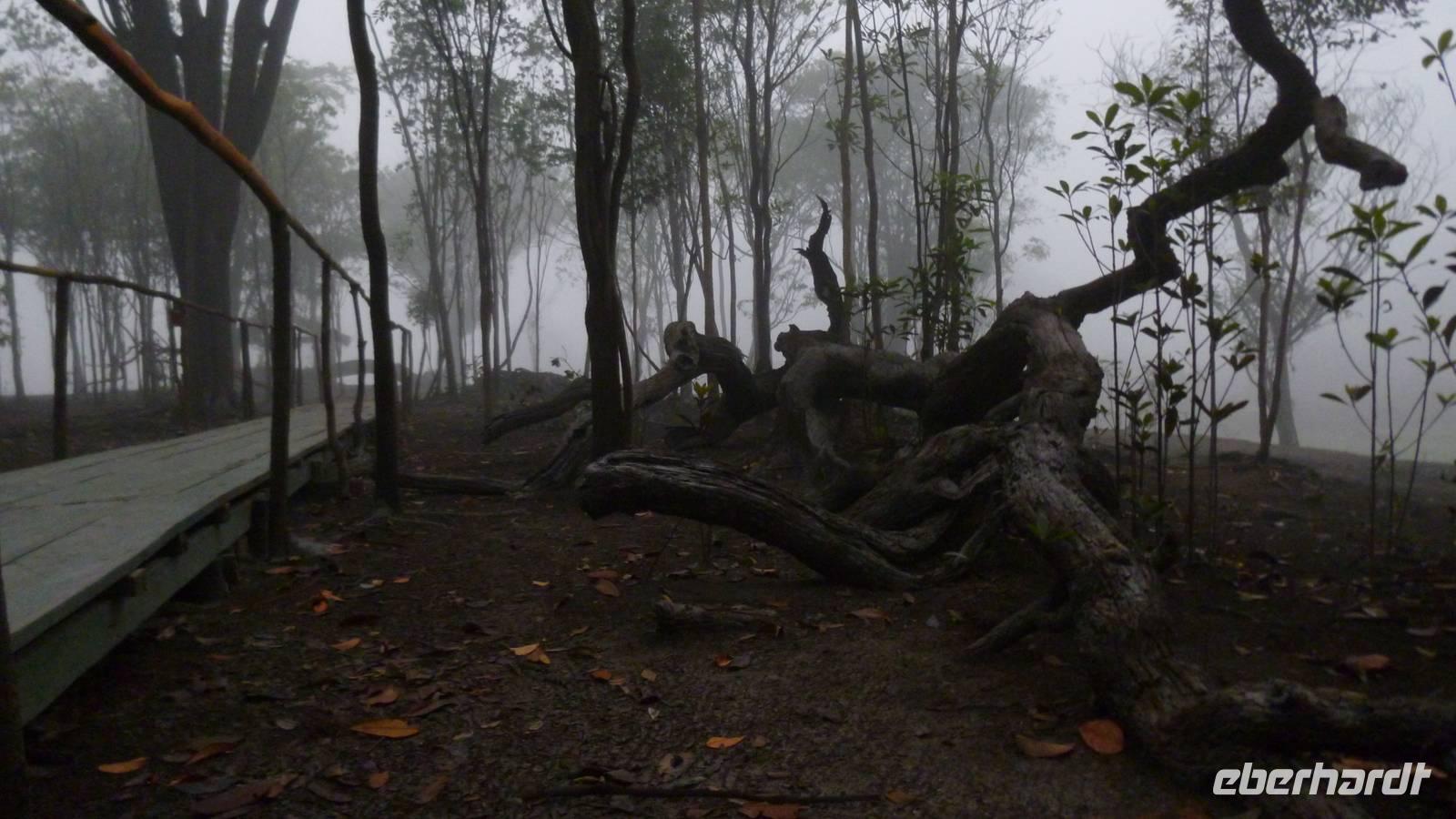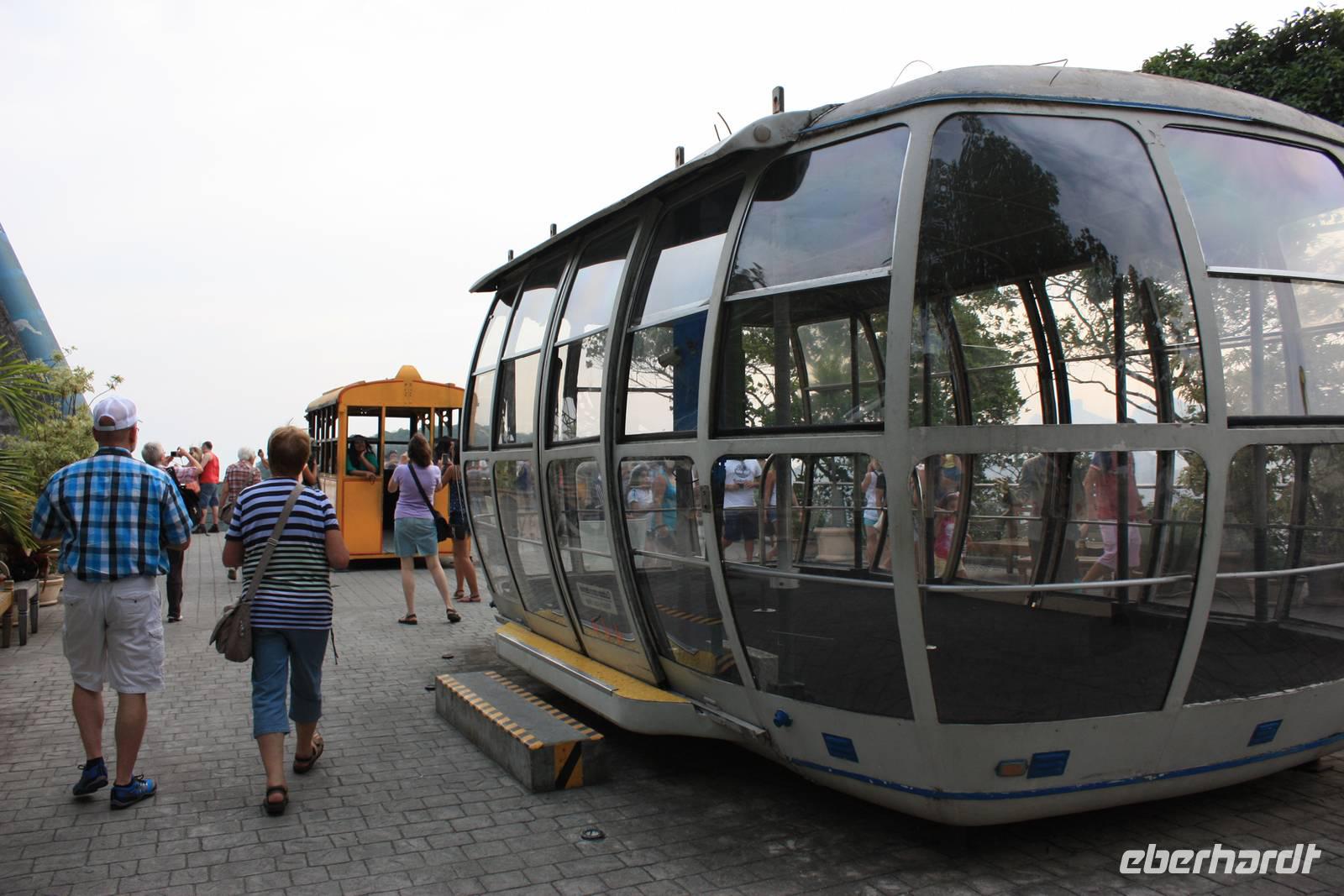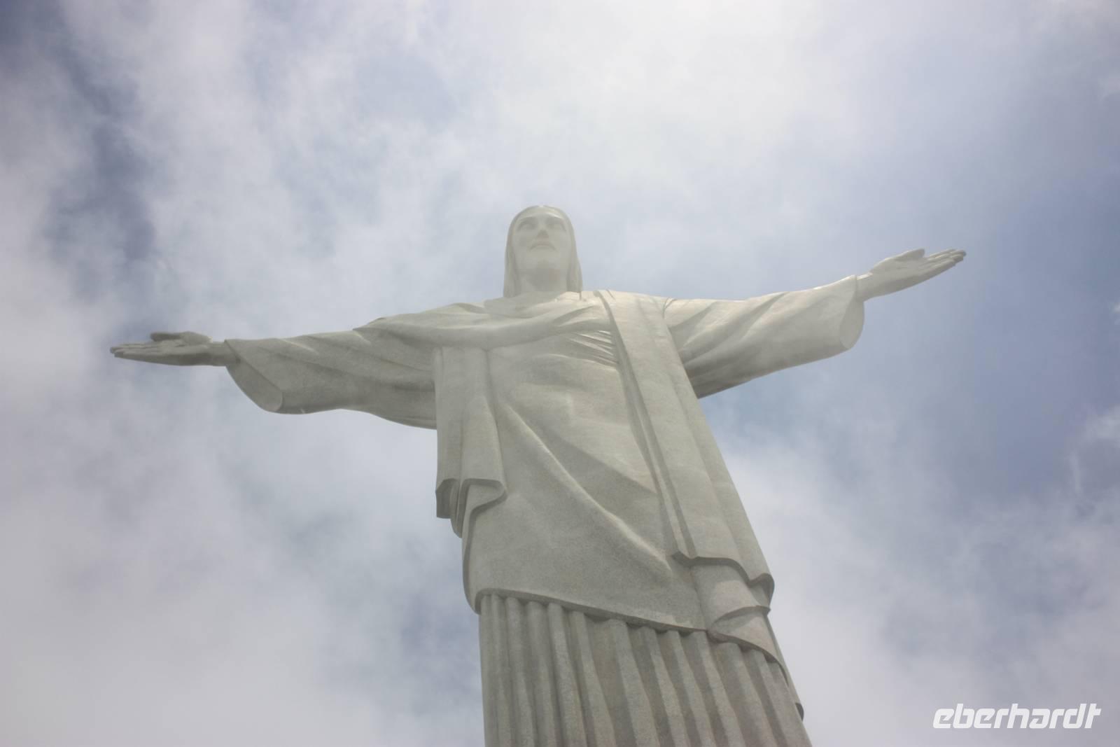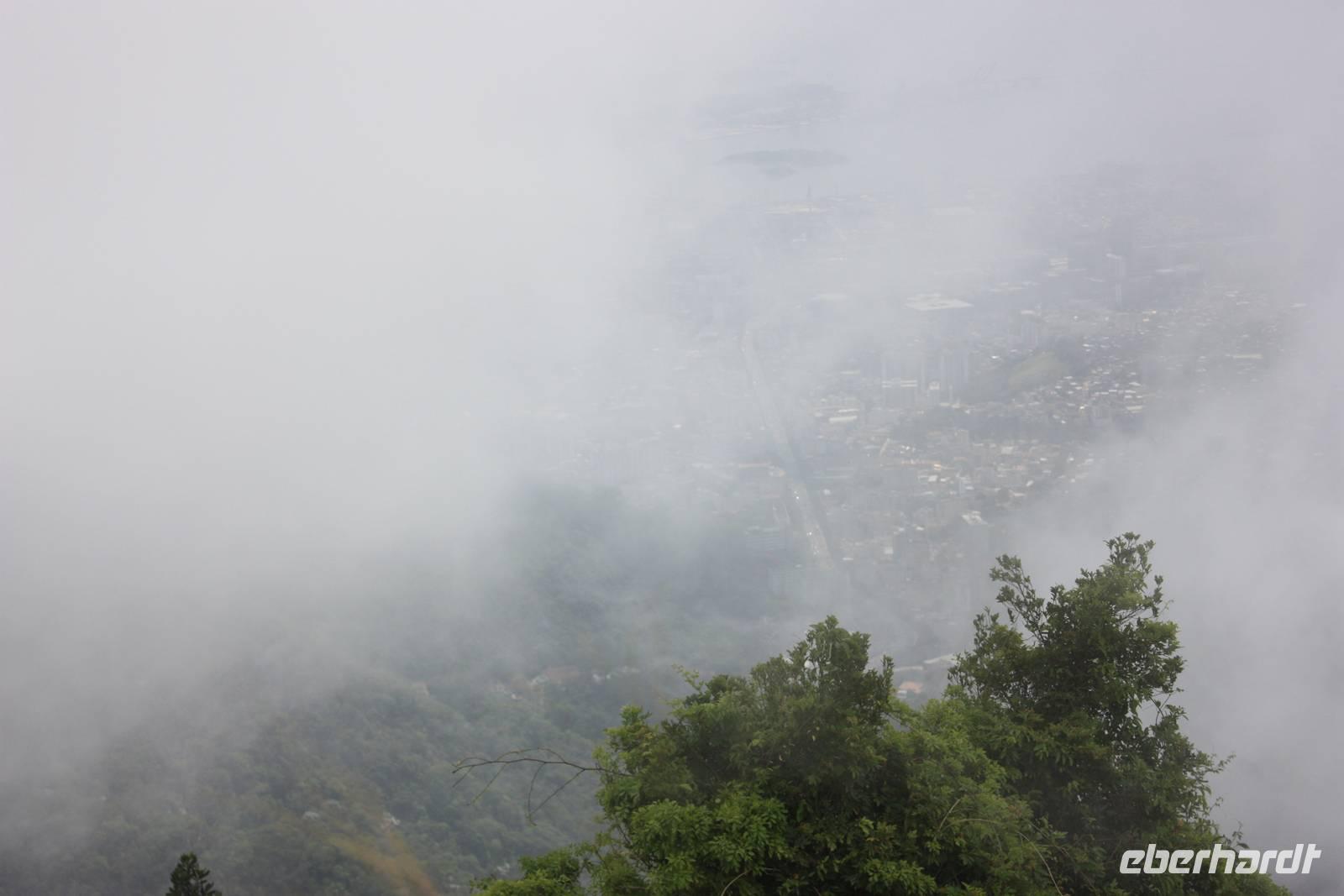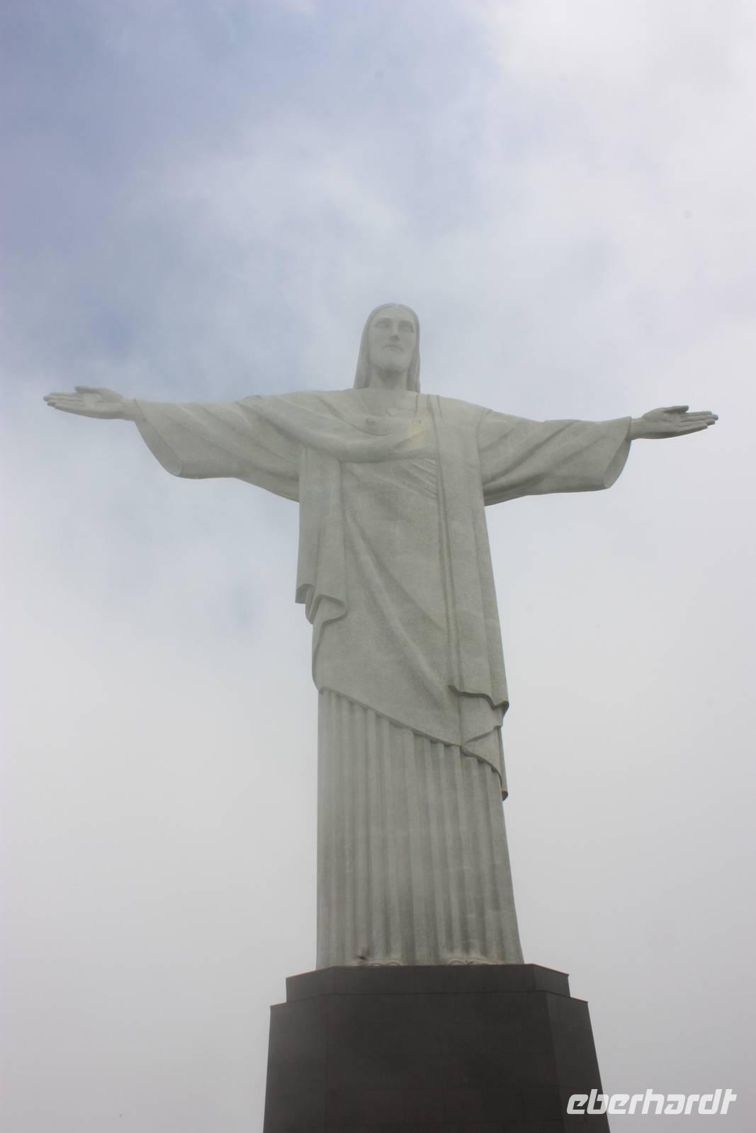 Der Corcovado liegt versteckt in den Wolken, doch vielleicht haben wir ja Glück und es zieht plötzlich auf, wenn wir oben sind. Durch den Tijuca-Wald fährt die Bahn bis an den Gipfel des Berges. Mit einem Fahrstuhl werden noch die letzten Höhenmeter überwunden und dann die Enttäuschung: von der großen Christusstatue sehen wir leider nur den Sockel. Wir geben die Hoffnung nicht auf und laufen zur Plattform, die sich vor der Statue erstreckt.
