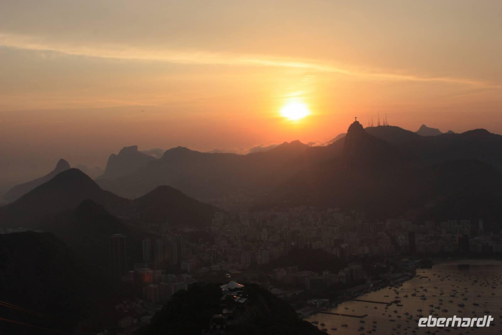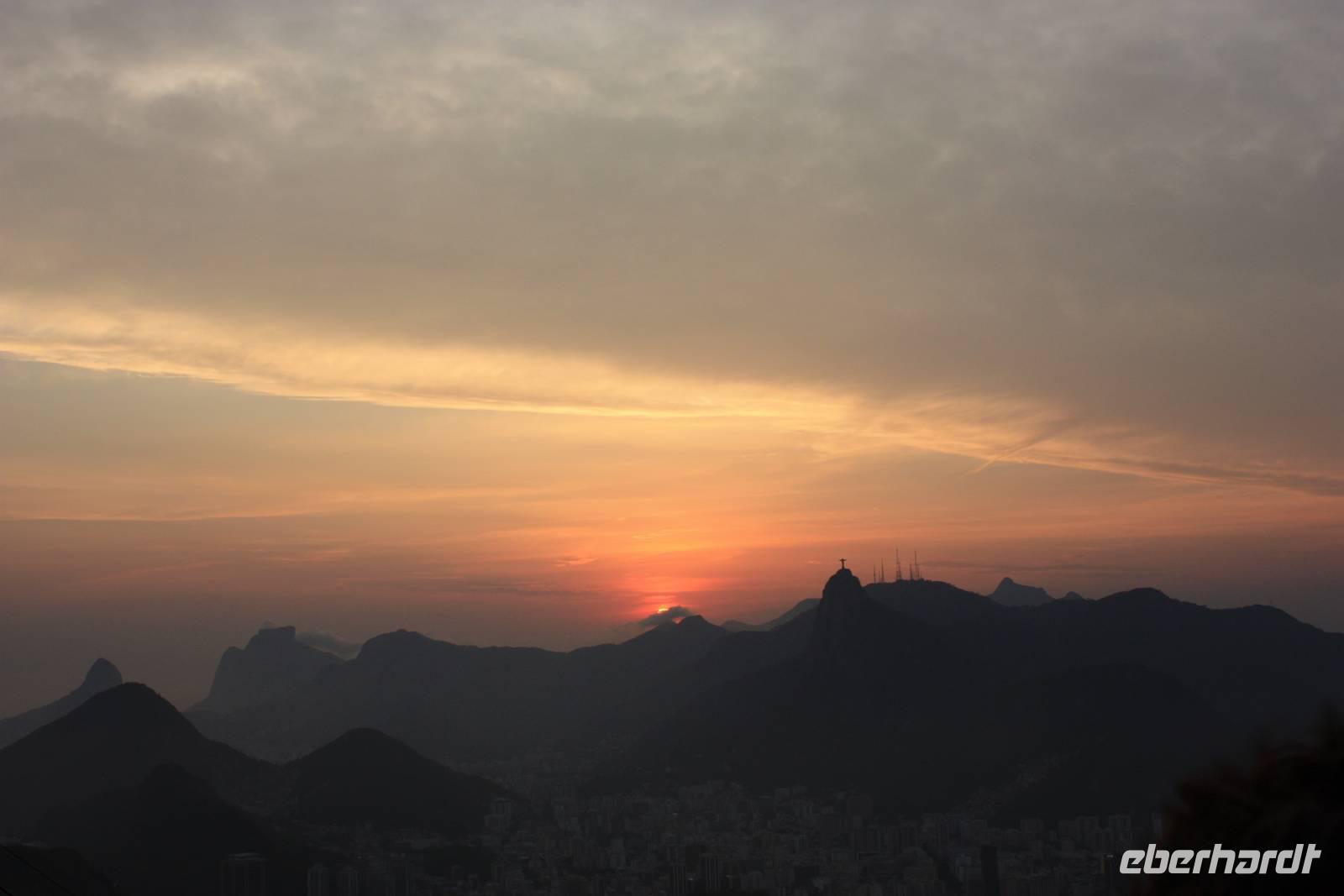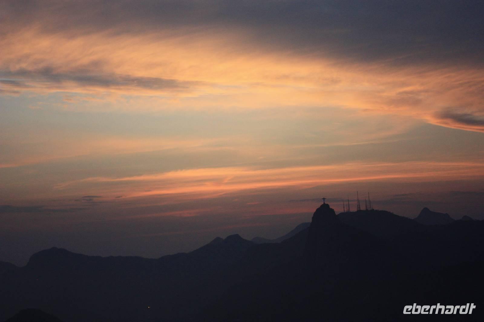 Nun ist die perfekte Tageszeit gekommen für den Pão de Açucar, den Zuckerhut. Mit der Seilbahn geht es in zwei Etappen immer höher bis wir endlich oben ankommen und die ganze Stadt uns bei wunderschönem Licht zu Füßen liegt. Maik scheint alles perfekt geplant zu haben: wir sind gerade rechtzeitig dort um atemberaubende Fotos zu schießen in der Abendröte des Sonnenuntergangs. Rosarote und orangene Wolken rahmen die Berge ein und die berühmte Christusstatue schaut direkt zu uns rüber und steht in tollem Kontrast zum Himmel, als die Sonne langsam hinter den Bergen verschwindet.
