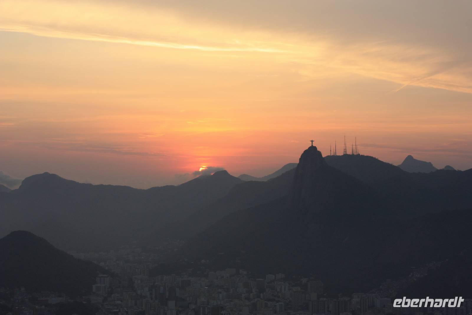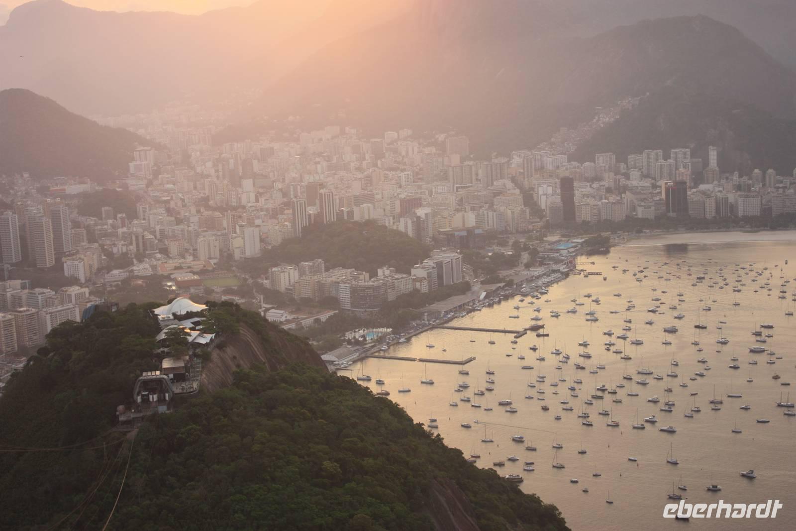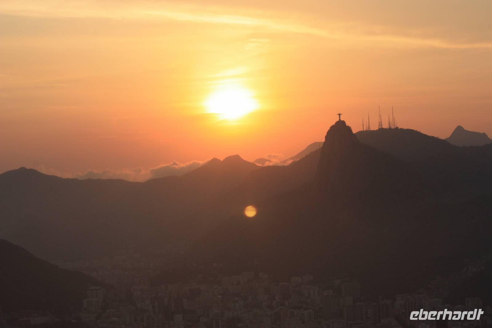 Nun ist die perfekte Tageszeit gekommen für den Pão de Açucar, den Zuckerhut. Mit der Seilbahn geht es in zwei Etappen immer höher bis wir endlich oben ankommen und die ganze Stadt uns bei wunderschönem Licht zu Füßen liegt. Maik scheint alles perfekt geplant zu haben: wir sind gerade rechtzeitig dort um atemberaubende Fotos zu schießen in der Abendröte des Sonnenuntergangs. Rosarote und orangene Wolken rahmen die Berge ein und die berühmte Christusstatue schaut direkt zu uns rüber und steht in tollem Kontrast zum Himmel, als die Sonne langsam hinter den Bergen verschwindet.