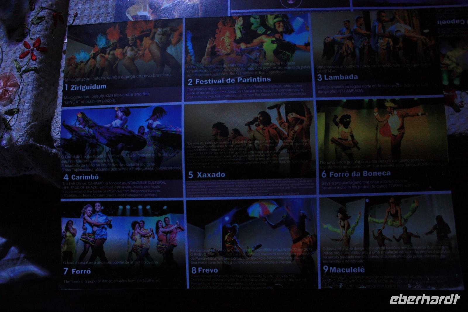 Noch einen Caipirinha bestellen und dann geht es auch schon los. Begleitet von einer eingespielten Liveband wird uns ein Tanz nach dem anderen gezeigt. Sogar die Kampfsportart Capoeira ist dabei. Ein wirklicher Kampfsport ist es nicht.. es sieht eher aus wie eine Art Spiel zwischen zwei Akrobaten.