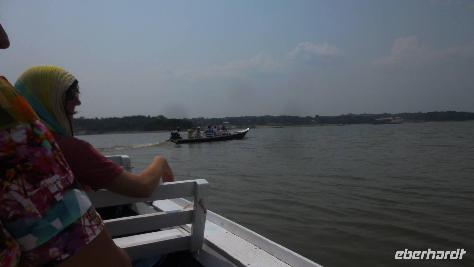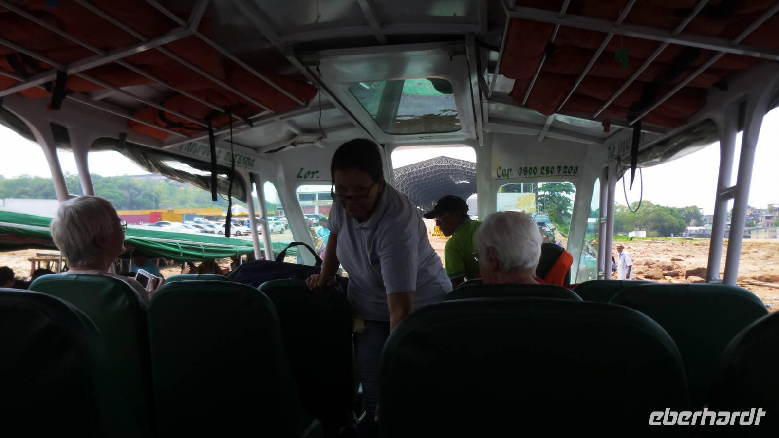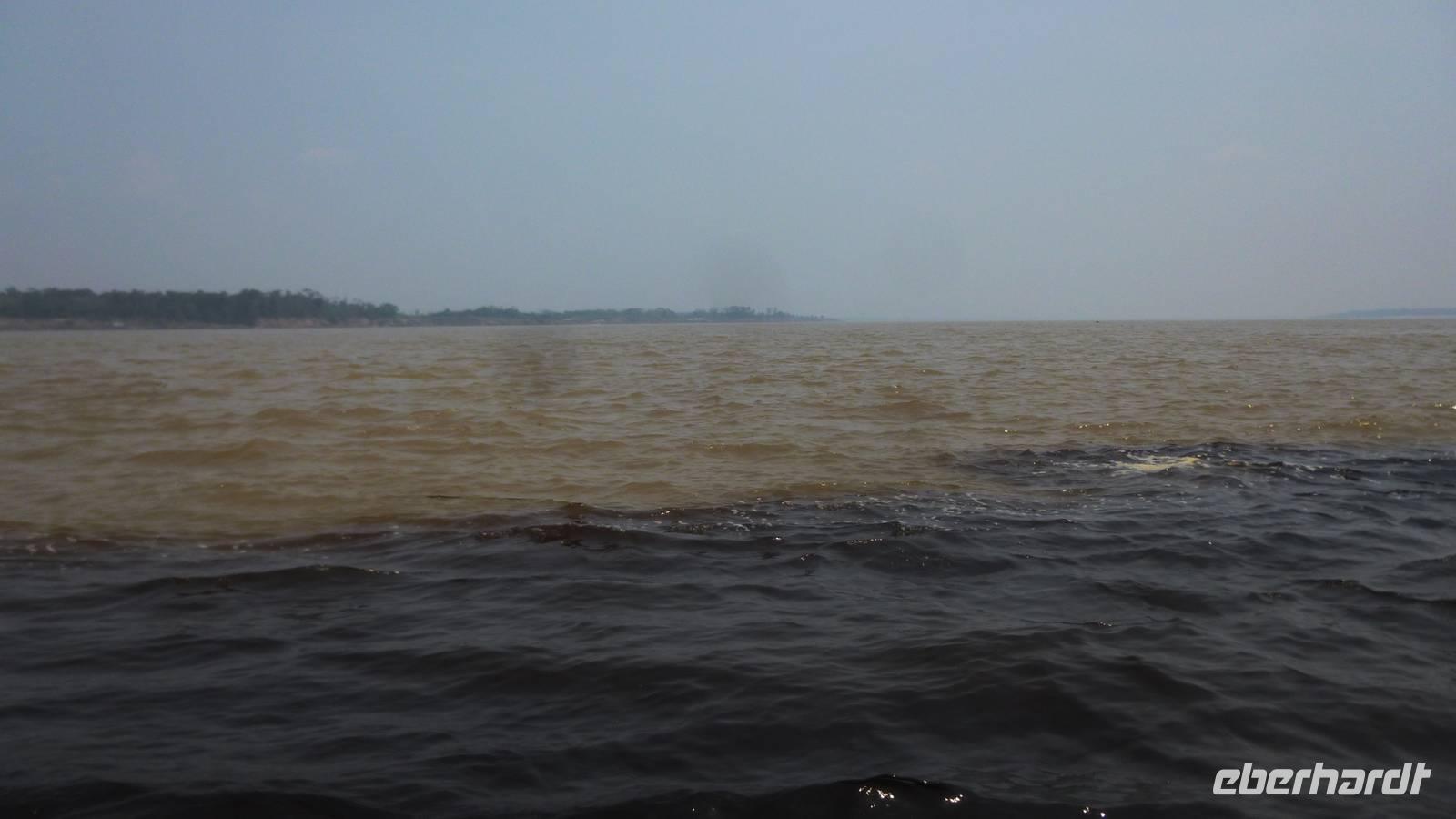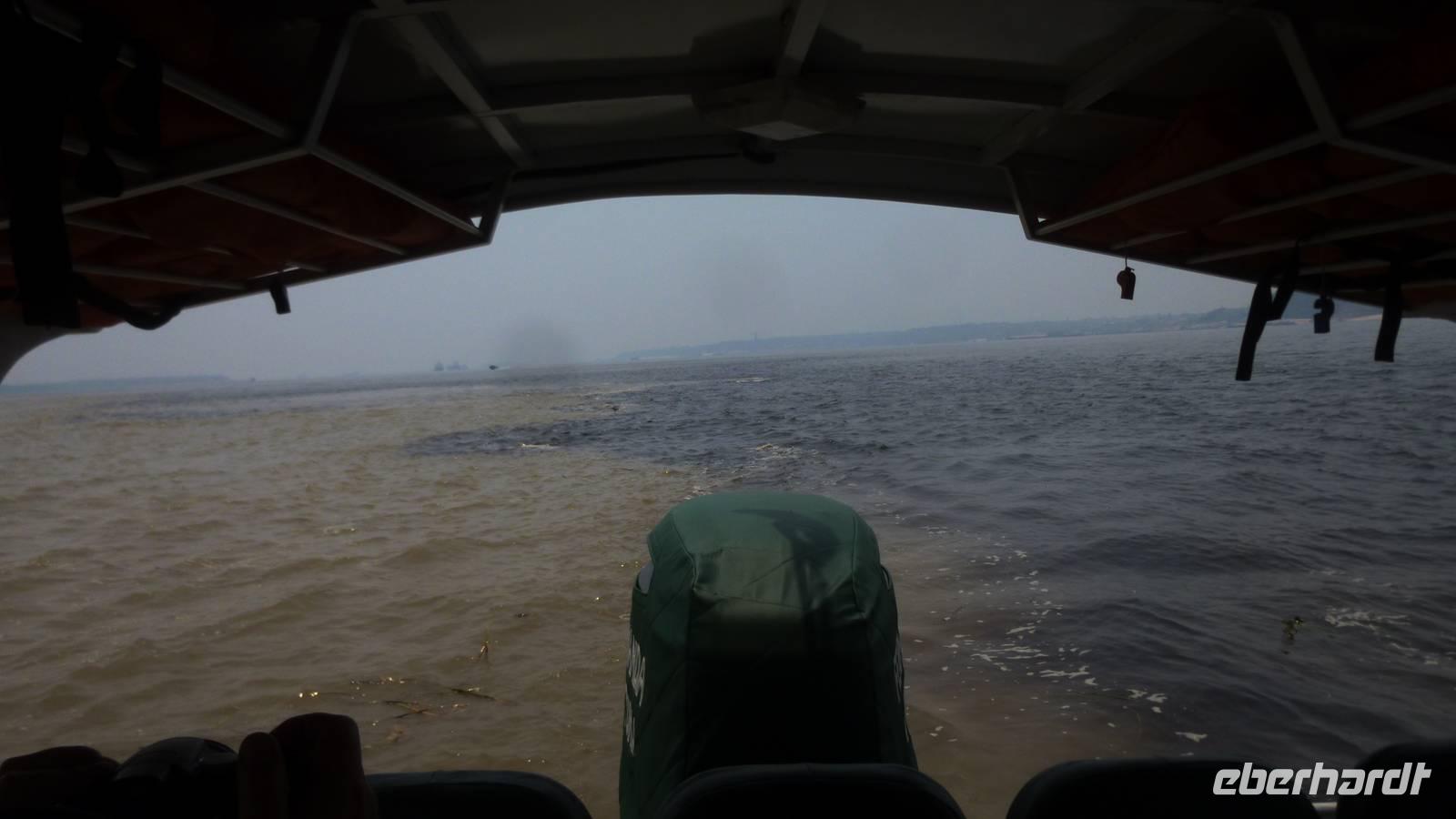 Das Abenteuer Amazonas beginnt. Koffer werden aufs Boot verladen und schon kann die einstündige Fahrt losgehen. Hier bei Manaus sieht man ganz deutlich den Zusammenfluss von Rio Negro und Rio Solimoes. Aber wirklich vermischen tut sich da nichts, denn sowohl die Temperaturen, als auch die Zusammensetzung des Wassers unterscheiden sich so sehr, dass die beiden Gewässer einfach nicht miteinander auskommen wollen. Das macht nichts, so ergibt sich für uns ja immerhin ein spektakuläres Fotomotiv.