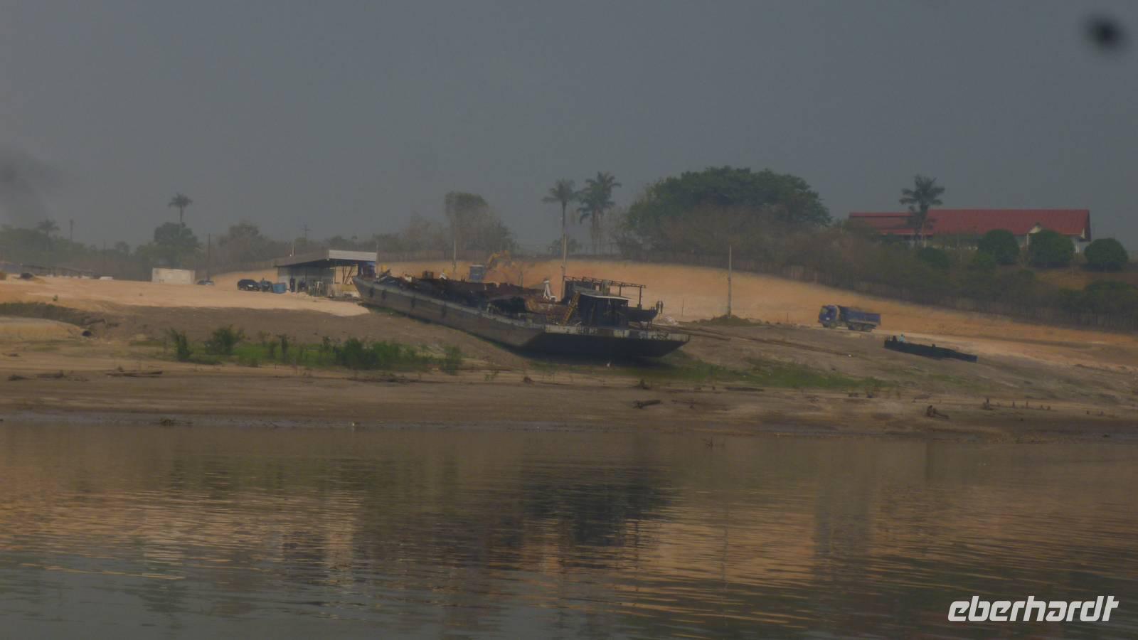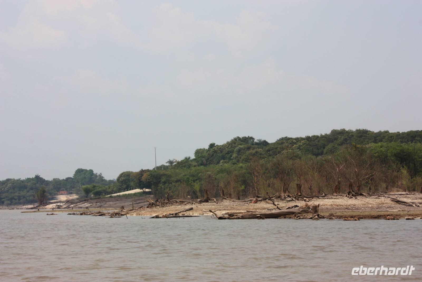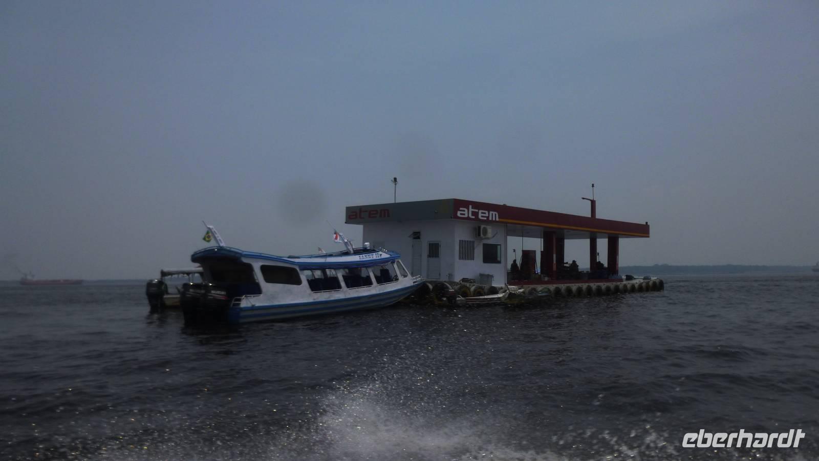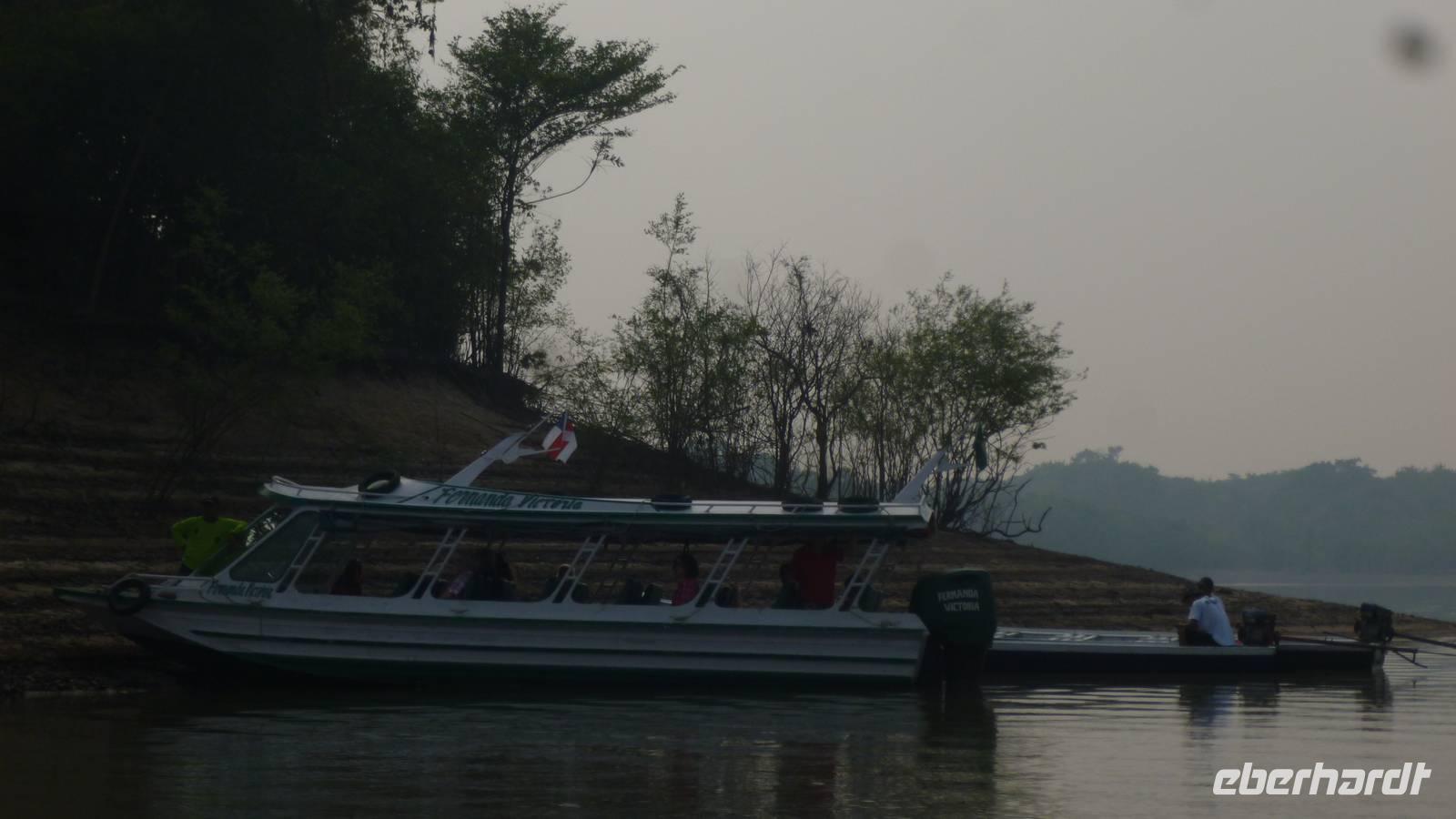 Das Abenteuer Amazonas beginnt. Koffer werden aufs Boot verladen und schon kann die einstündige Fahrt losgehen. Hier bei Manaus sieht man ganz deutlich den Zusammenfluss von Rio Negro und Rio Solimoes. Aber wirklich vermischen tut sich da nichts, denn sowohl die Temperaturen, als auch die Zusammensetzung des Wassers unterscheiden sich so sehr, dass die beiden Gewässer einfach nicht miteinander auskommen wollen. Das macht nichts, so ergibt sich für uns ja immerhin ein spektakuläres Fotomotiv.