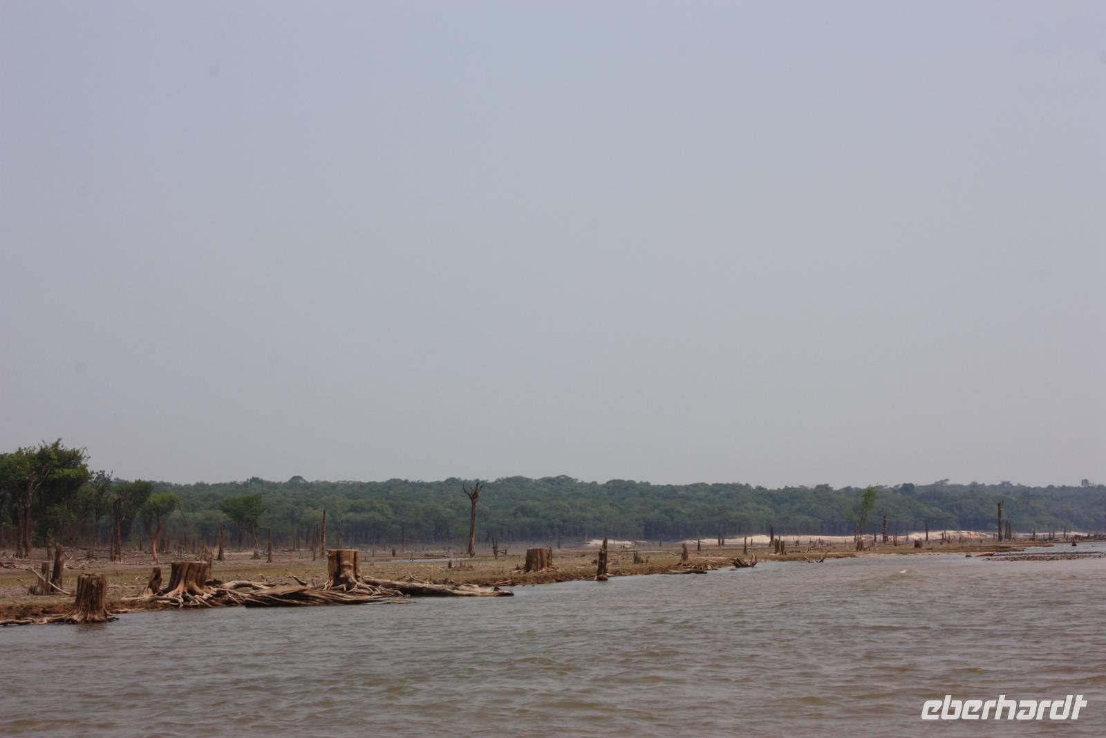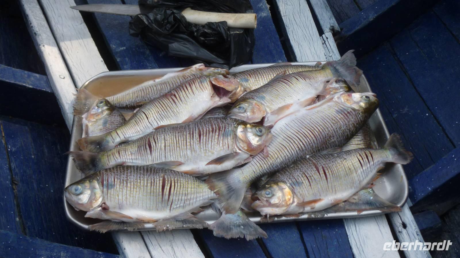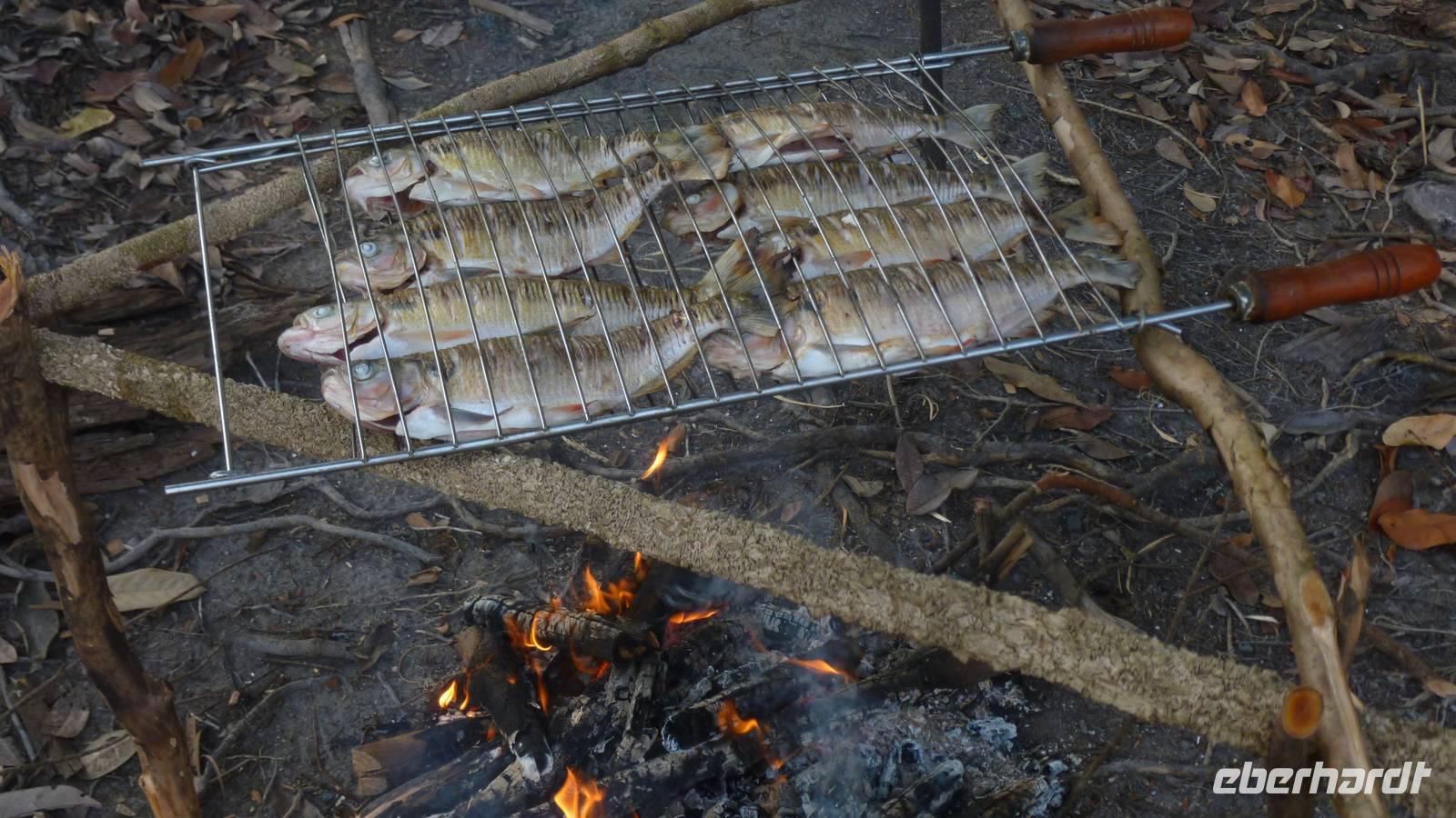 Ein geübter Angler würde sich kaputt lachen über die Methode, mit der wir unser Glück versuchen. Aber am Ende klappt es doch und wir haben, Dank der Unterstützung unserer erfahrenen Guides, genügend Fische gefangen um davon satt zu werden. Am Nachmittag kommt der Fang übers Feuer. Unser Tarzan ist ein wahrer Überlebenskünstler.. im Nu hat er ein Feuer gezaubert.