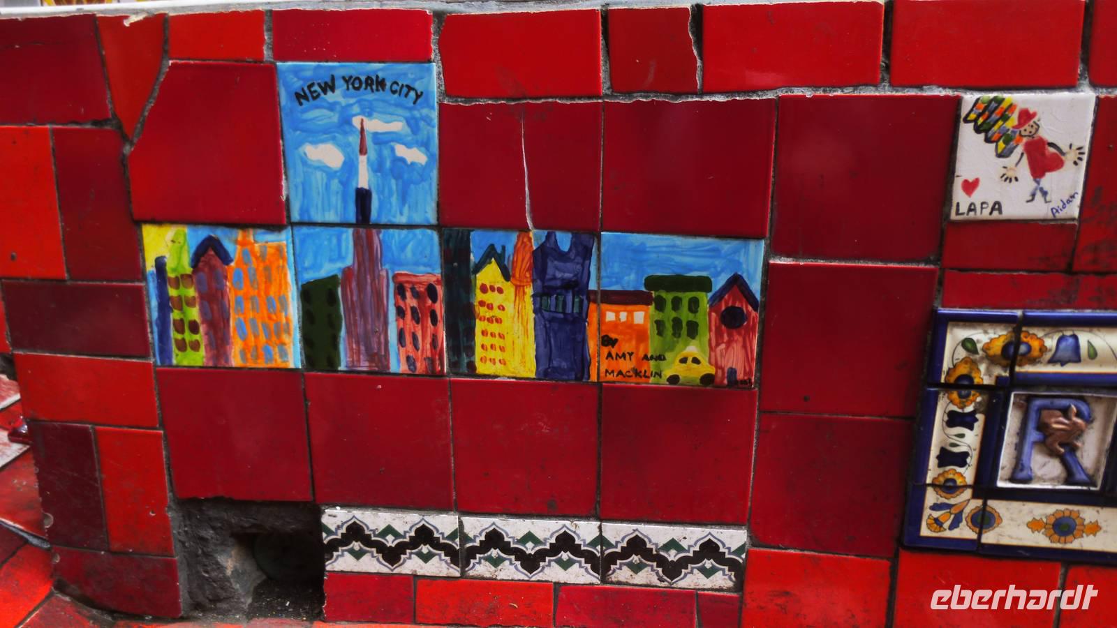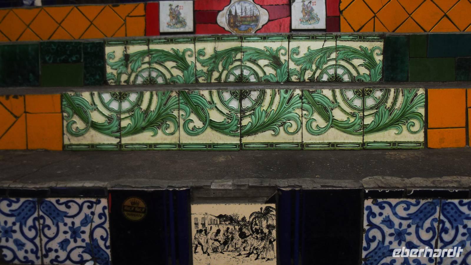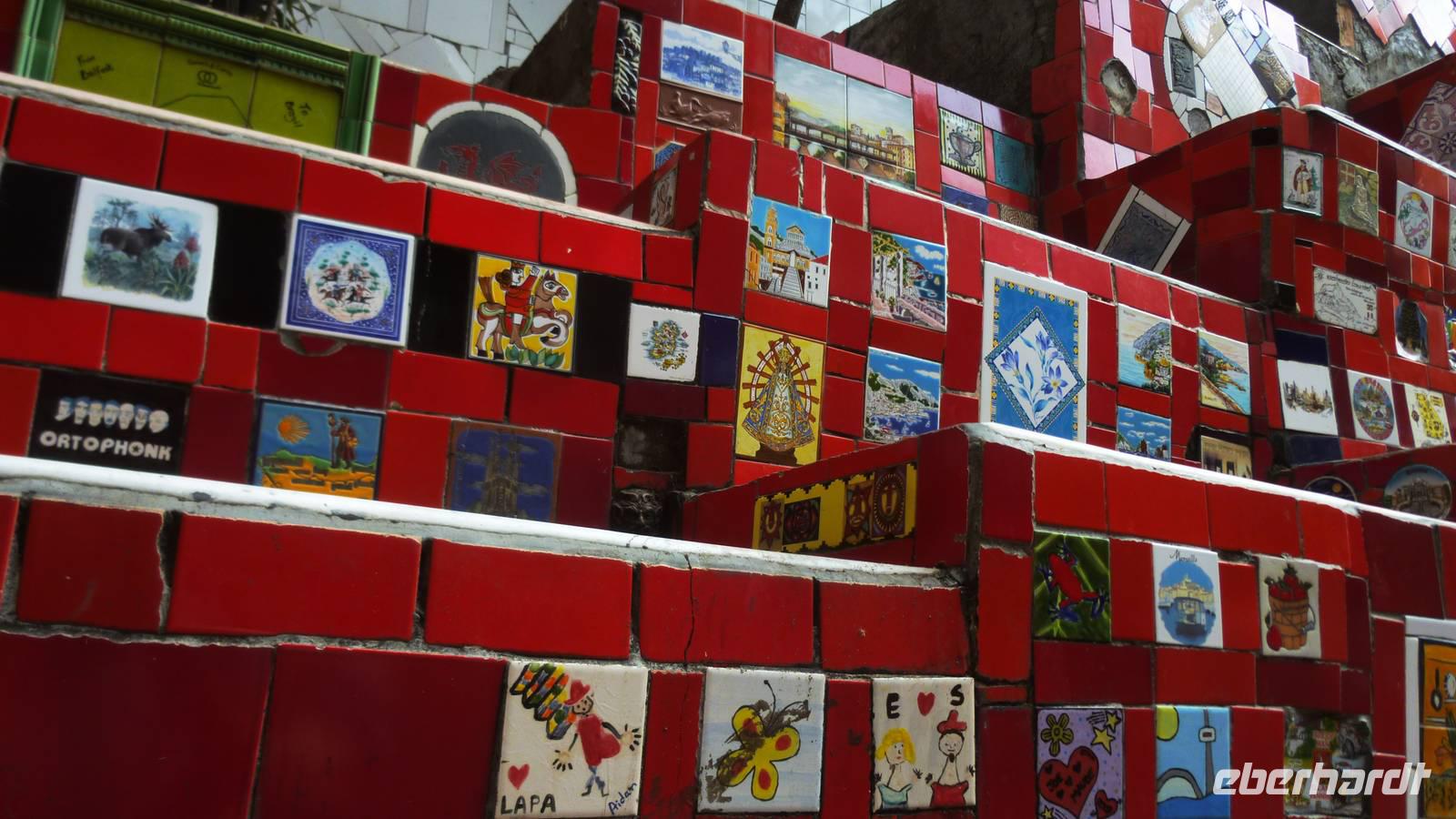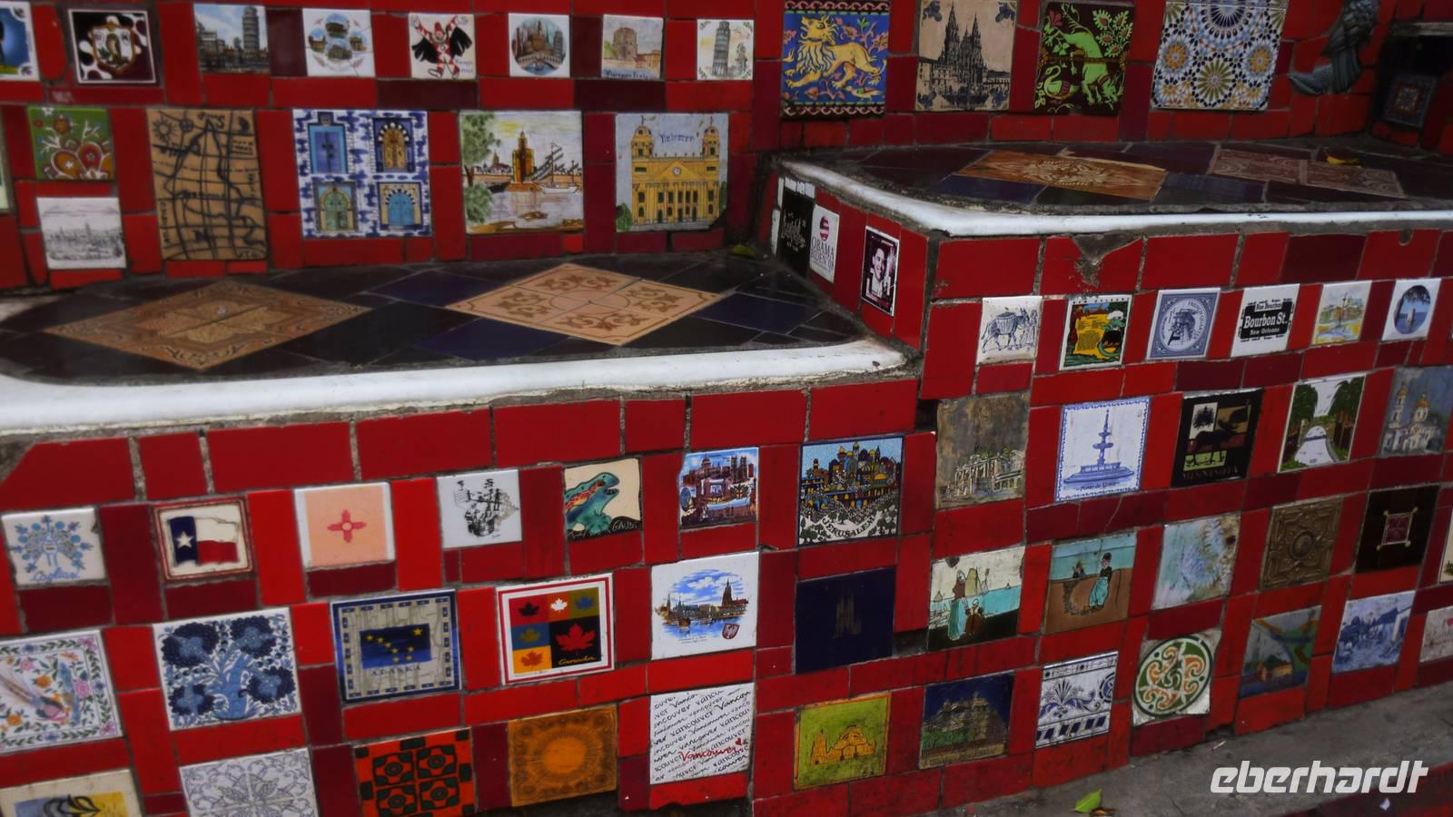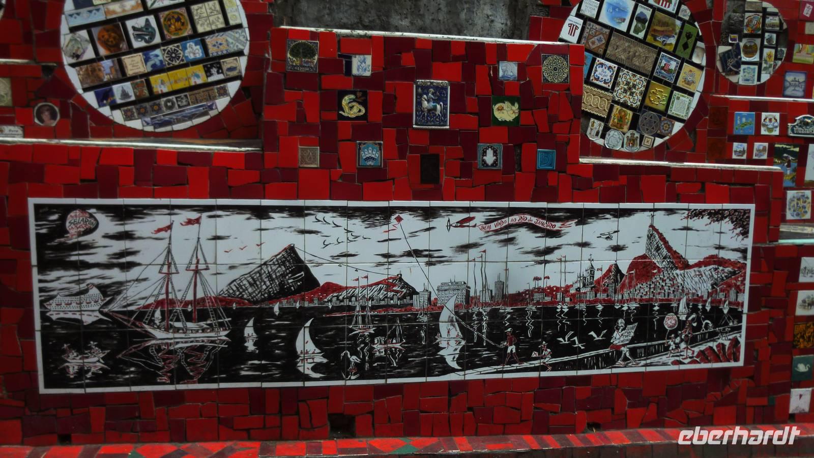 Unser erster Halt ist im Stadtviertel Lapa. Eine wirkliche Touristengegend ist das nicht, doch sie hält etwas ganz besonderes für Reisende bereit. Vor Jahren hat der Künstler Selarón begonnen, eine lange Treppe des seines Viertels mit bunten Kacheln zu verzieren. Im Laufe der Jahre kamen immer mehr dazu und Reisende aus aller Welt brachten ihm Kacheln zur Dekoration der Treppe. Heute ist die "Escadaria Selarón" ein wahres Kunstwerk und man könnte dort am liebsten Stunden verbringen. Nach dem traurigen Tod des Künstlers hat sich der Flair dieser Treppe jedoch geändert, bedauert unser Carioca (=Einwohner von Rio de Janeiro), aber es wird als Fotomotiv immer beliebter bei Turisten. Ein guter Ort für unser Gruppenfoto!