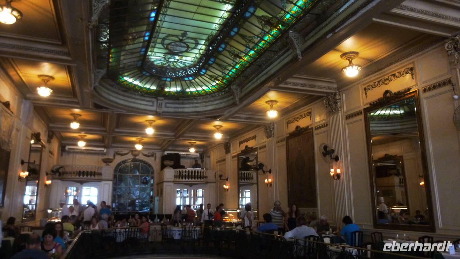 Unser letzter Programmpunkt für heute ist das Cafe Colombo. In Rios schönstem Café aus dem Jahre 1894 genießen wir ein köstliches Mittagsbuffet und lernen ein weiteres typisch brasilianisches Gericht kennen: Feijoada, ein Eintopf aus schwarzen Bohnen und Fleisch.