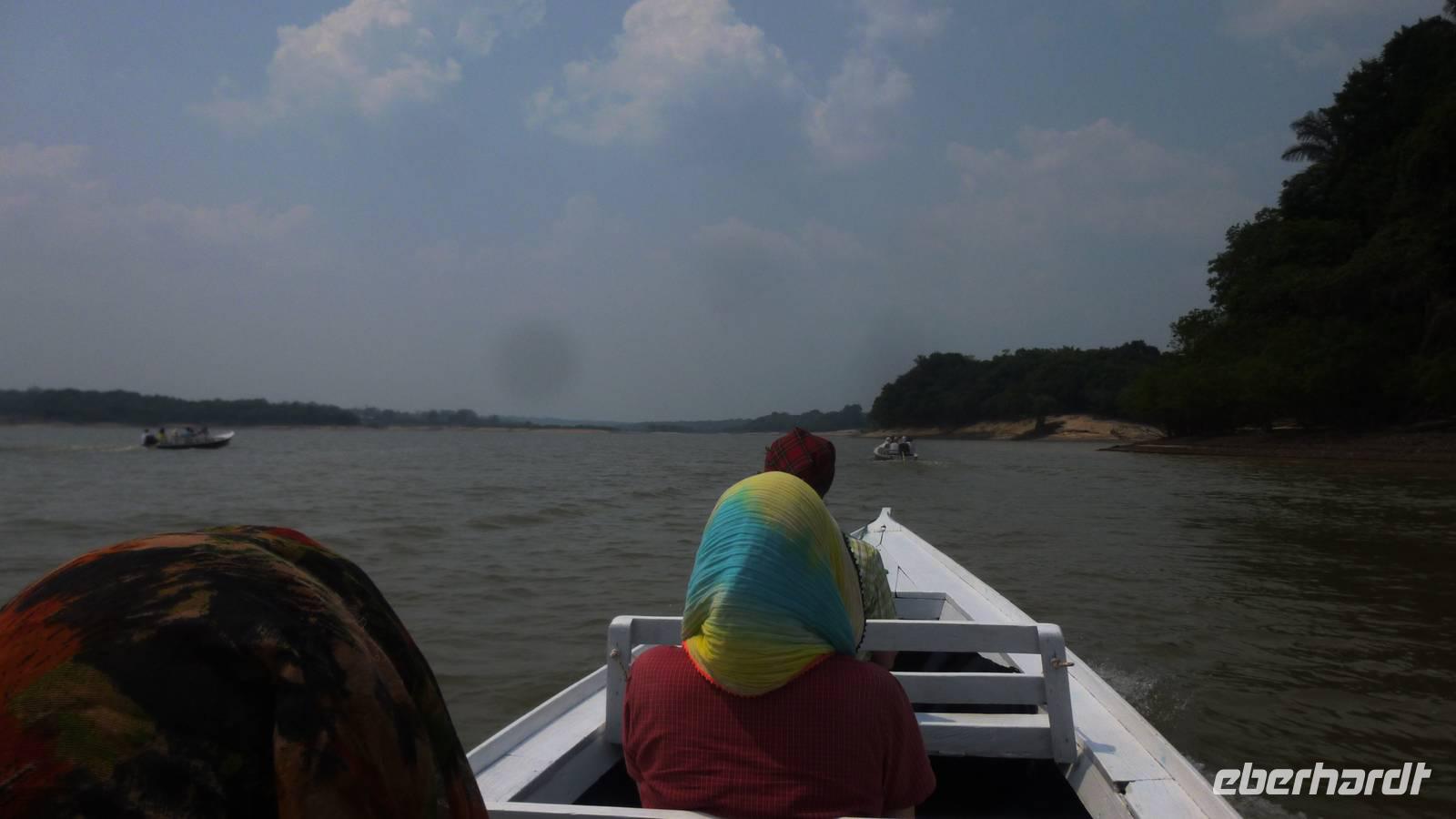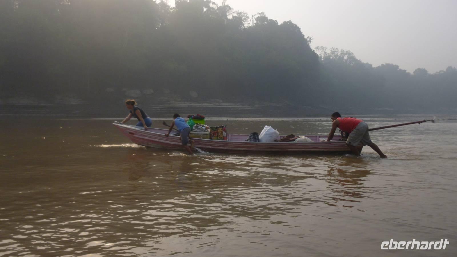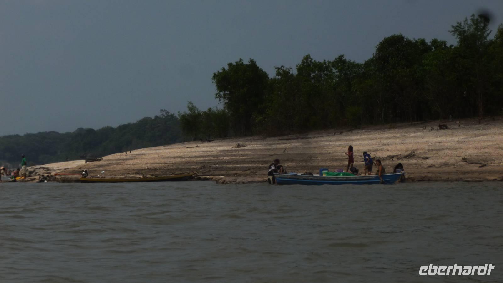 Wir erreichen den ersten Seitenarm, in den wir auch mit viel Schwung rein fahren. Wenige Minuten vergehen und die Entscheidung steht fest: Wir können in diesem Speedboot nicht weiter. Aufgrund einer andauernden Dürre ist der Amazonas viel flacher als sonst, das Boot würde stecken bleiben. Also steigen wir um in 3 schmale Boote von Amazon Village. Die Koffer werden extra verladen. Wir scheinen nur schleppend durchzukommen, nur eins der Boote schafft es auf Anhieb bis zum Village. Für die anderen beiden heißt es Aussteigen und Schieben. Zum Glück sind die Einwohner so kontaktfreudig und hilfsbereit und schieben kräftig mit. Sie nutzen den Sonntag um baden zu gehen im erfrischenden Wasser des Flusses.
