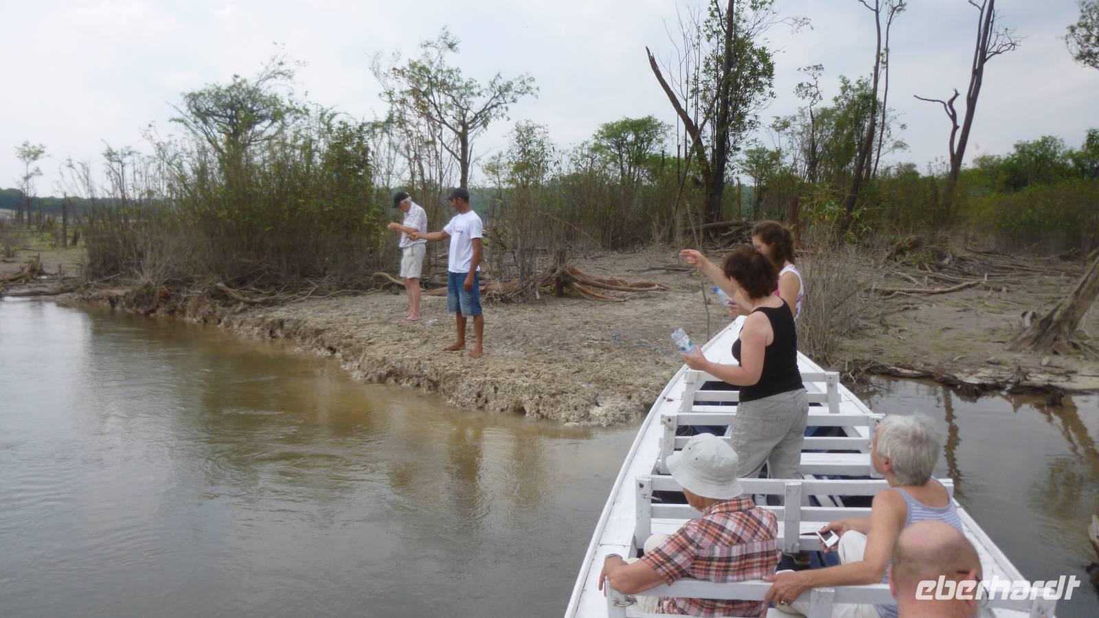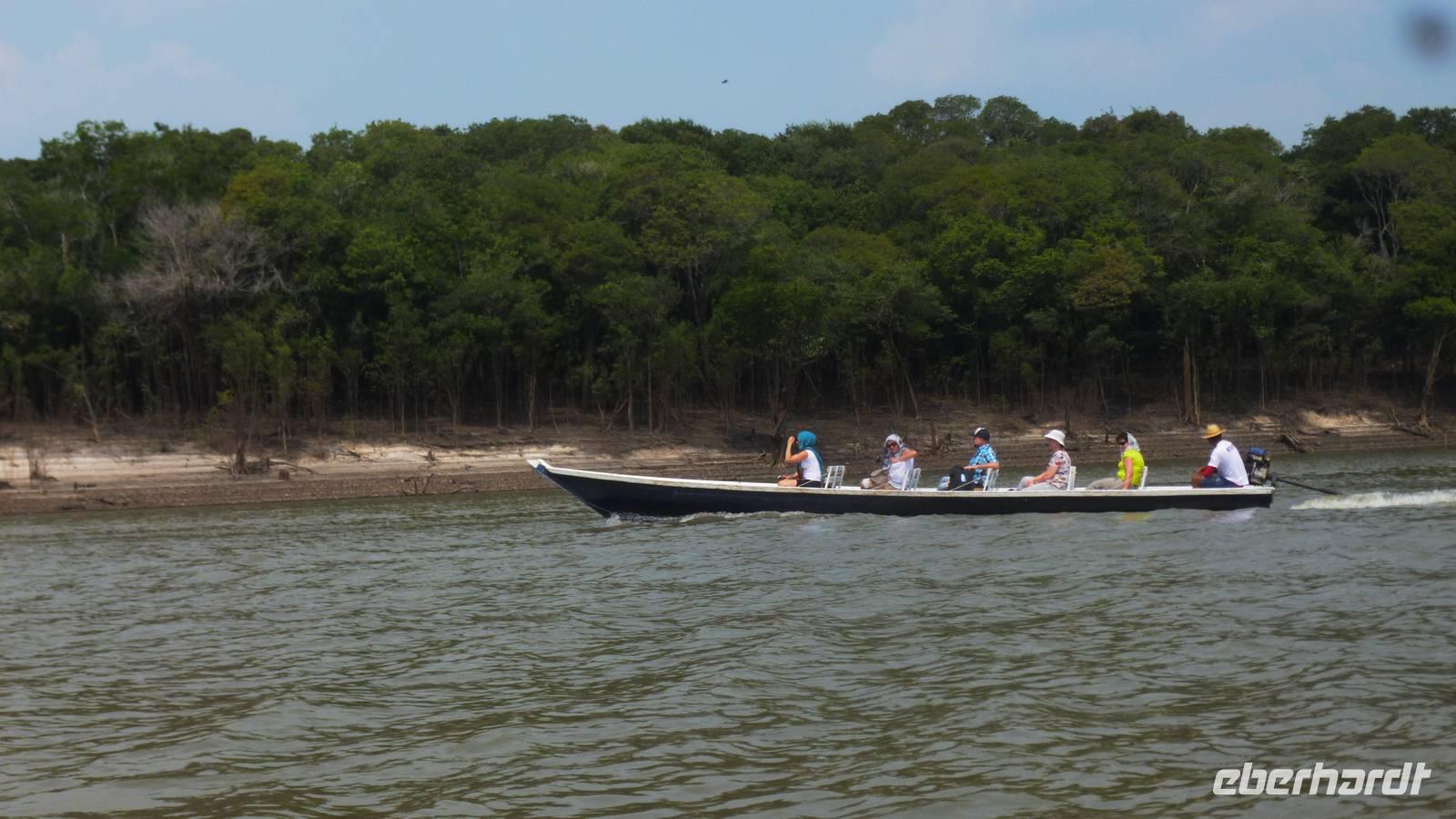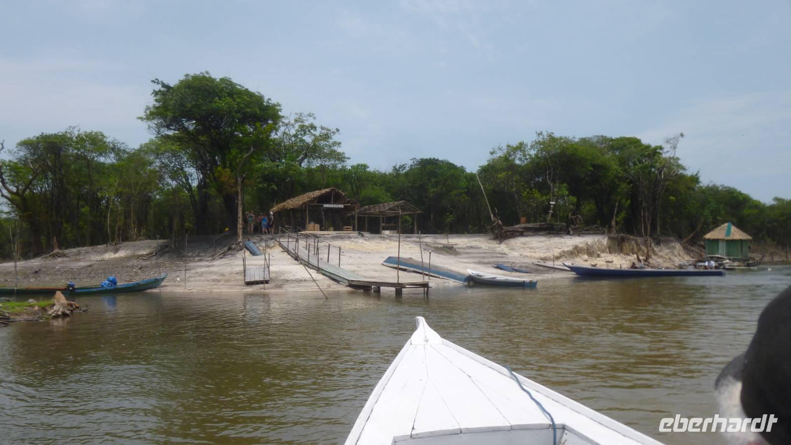 Wir erreichen den ersten Seitenarm, in den wir auch mit viel Schwung rein fahren. Wenige Minuten vergehen und die Entscheidung steht fest: Wir können in diesem Speedboot nicht weiter. Aufgrund einer andauernden Dürre ist der Amazonas viel flacher als sonst, das Boot würde stecken bleiben. Also steigen wir um in 3 schmale Boote von Amazon Village. Die Koffer werden extra verladen. Wir scheinen nur schleppend durchzukommen, nur eins der Boote schafft es auf Anhieb bis zum Village. Für die anderen beiden heißt es Aussteigen und Schieben. Zum Glück sind die Einwohner so kontaktfreudig und hilfsbereit und schieben kräftig mit. Sie nutzen den Sonntag um baden zu gehen im erfrischenden Wasser des Flusses.
