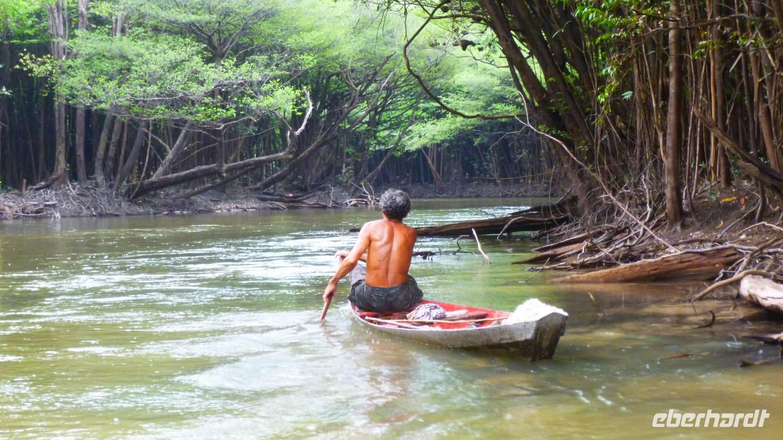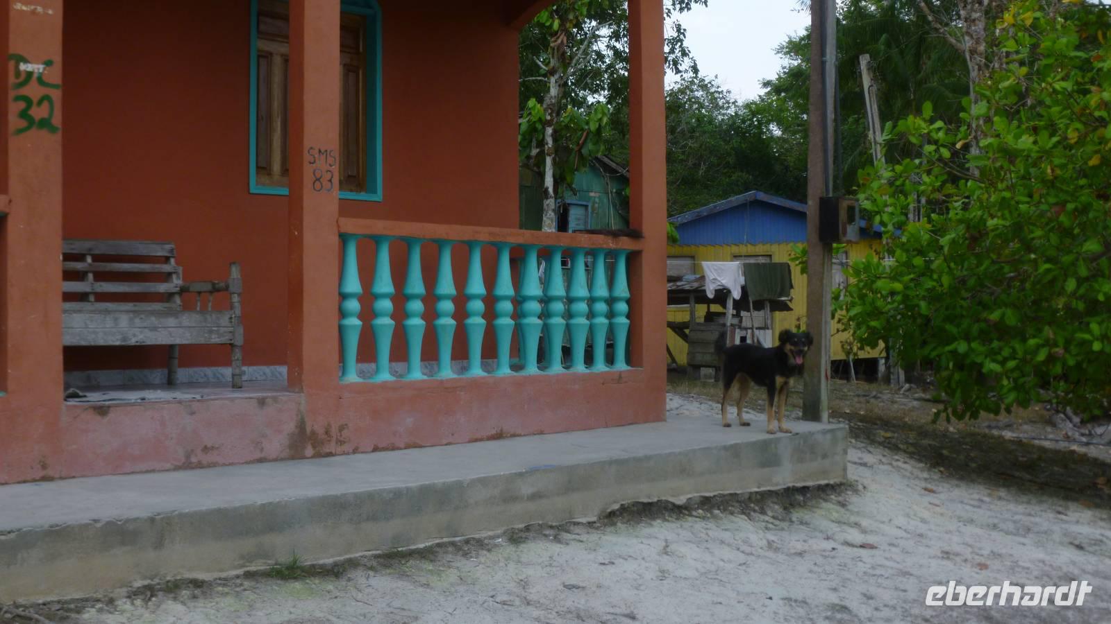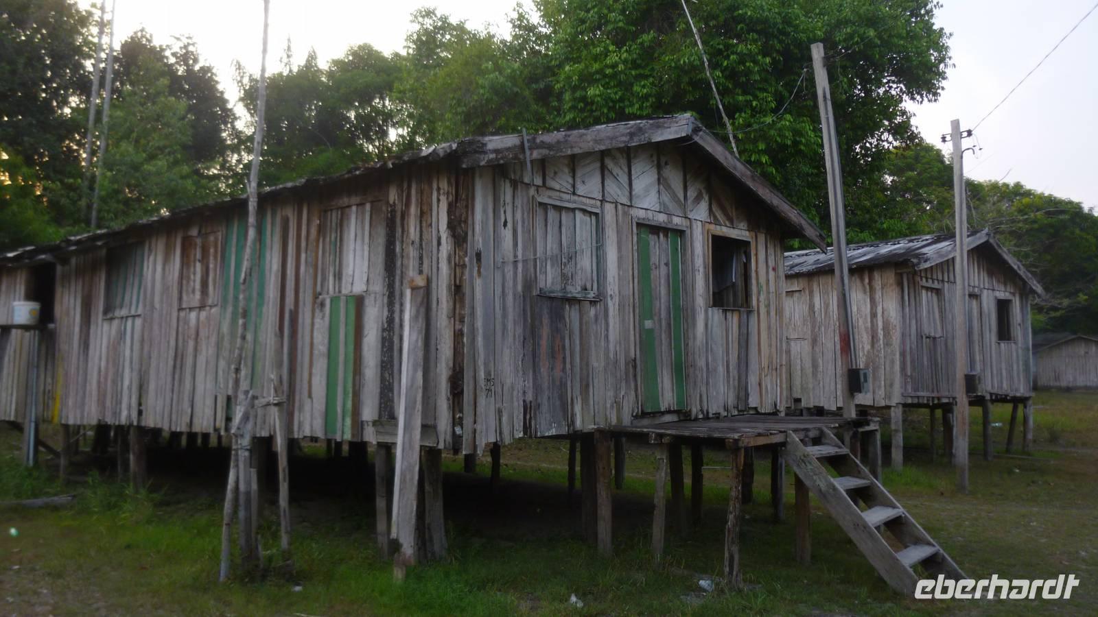 Dann ein Schreckmoment: Tarzen wollte gerade mit dem Boot wieder los, da tritt er plötzlich in einen Stachelrochen! Wir leiden mit ihm.. es muss höllisch wehtun. Doch schon am nächsten Morgen werden wir ihn wohl auf wiedersehen. Wir machen uns auf den Weg zu einem kleinen Dorf der Ureinwohner des Gebietes. Die typischen kleinen Häuschen nennen sich "Caboclo". Rosi erklärt uns die Herstellung von Manjokmehl, welches die Dorfbewohner gemeinsam und in großen Mengen regelmäßig produzieren. Es ist eines der Hauptnahrungsmittel hier im Amazonasgebiet und lebensnotwendig für die Bewohner.