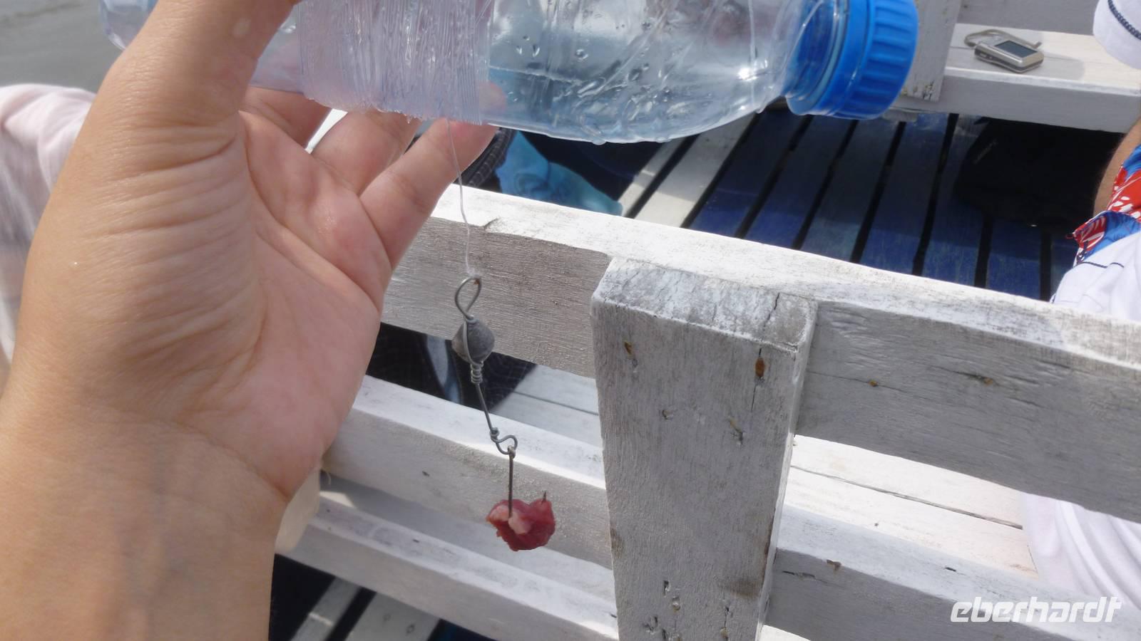 Wir bekommen unsere "Angeln": Eine kleine Plasteflasche, umwickelt mit der Angelschnur, an der am Ende ein Haken befestigt ist.