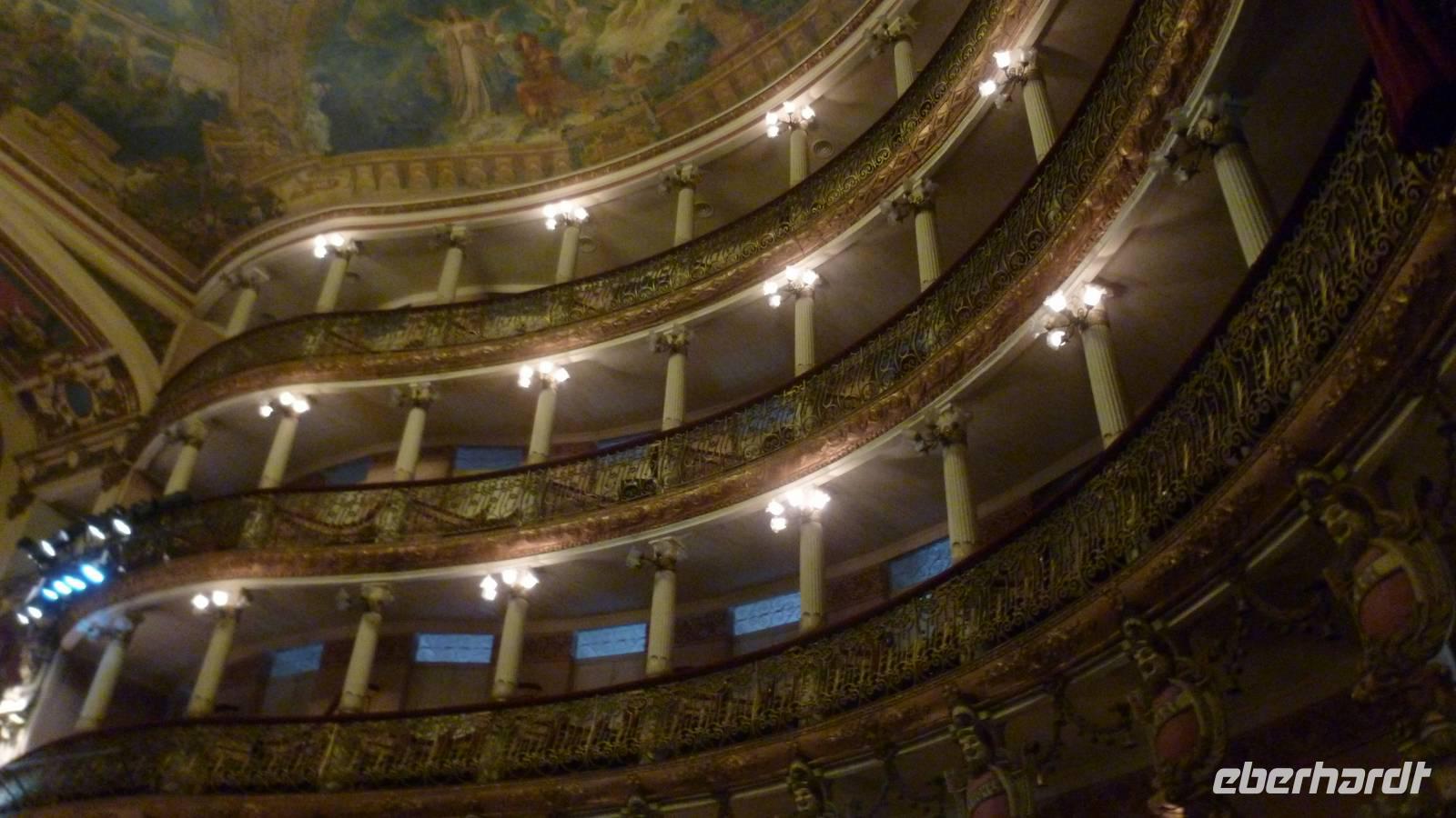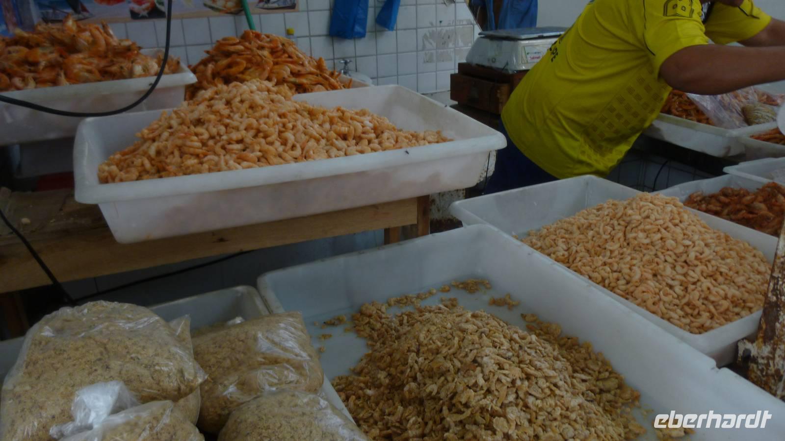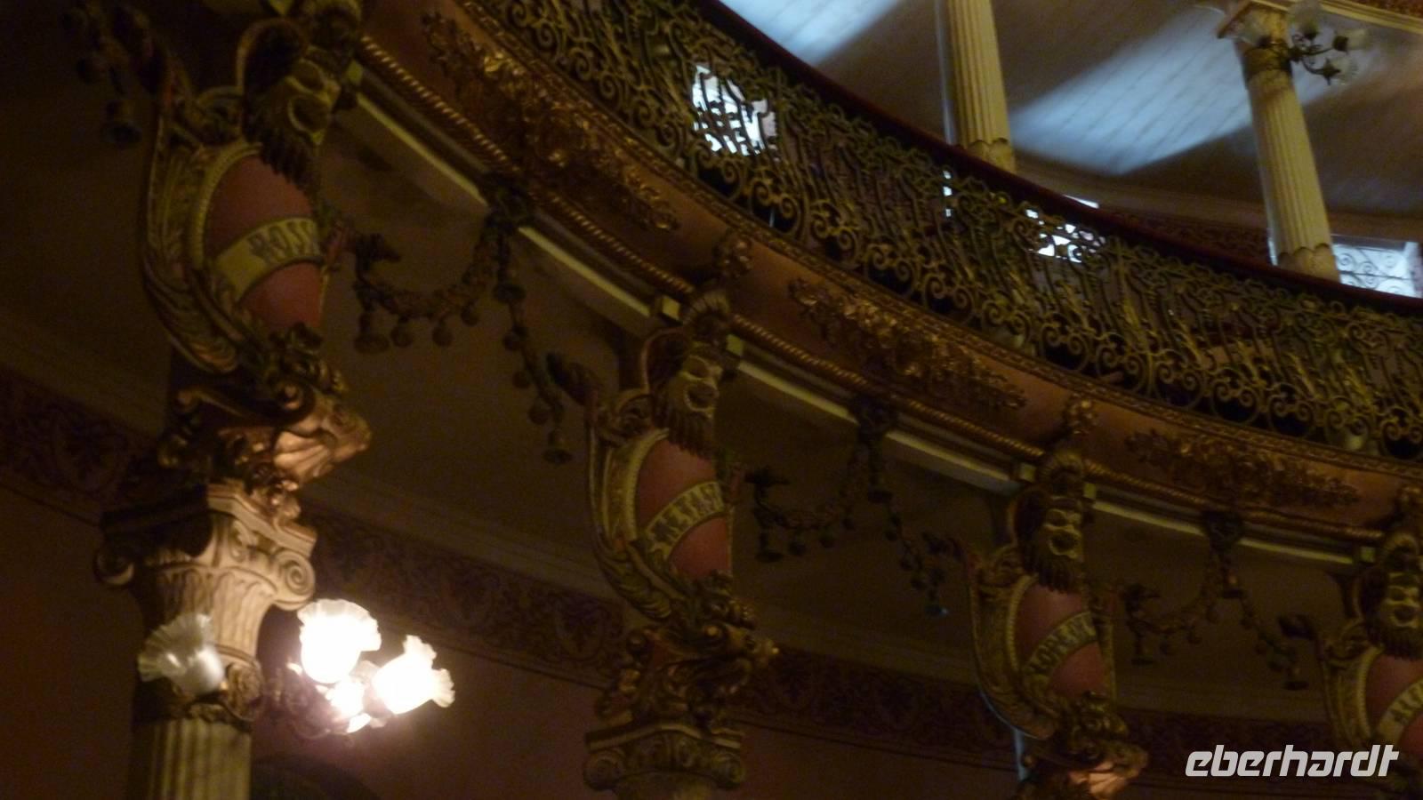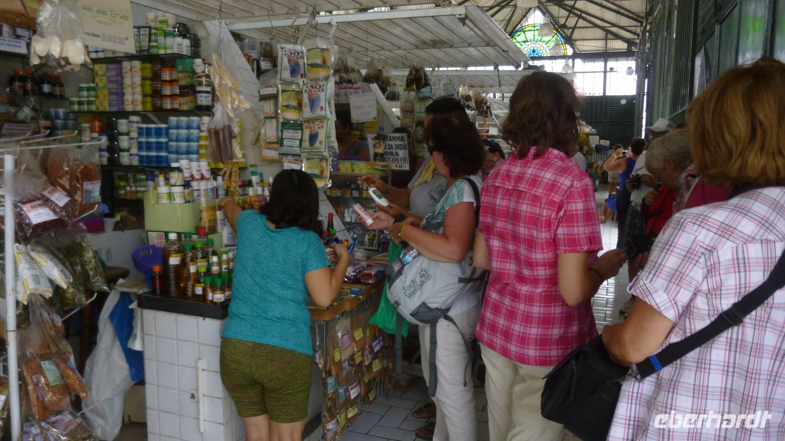 Während der Stadtrundfahrt durch Manaus erklärt und Rosi umfassend die Entwicklung der Stadt, welche mit der Entdeckung von Kautschuk einen riesigen Boom erlebte. Wir besichtigen das Prachtstück von Manaus: das Theater. Das Blattgold an den Geländern und die Polster der Sitze sind noch original erhalten. Wir sind beeindruckt. Letzter Halt der heutigen Tour ist die Markthalle. Wir folgen Rosi's Rat und besorgen uns auch etwas von dem Wunderöl, mit dem man sämtliche Hautirritationen heilen kann. Es kostet auch gar nicht viel. Der Markt bietet außerdem einiges an Fisch, Obst, bis hin zu Zimmerpflanzen. Schade, dass wir nicht viel Zeit haben und schnell weiter müssen zum Restaurant. Ein weiteres tolles Buffet erwartet uns und wir schlagen uns den Bauch voll, denn wir wissen genau: im Flugzeug der Brasilianischen Fluggesellschaft Gol wird es nichts zu Essen geben, zumindest nicht inklusive.