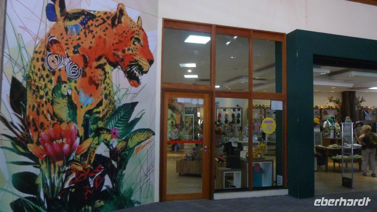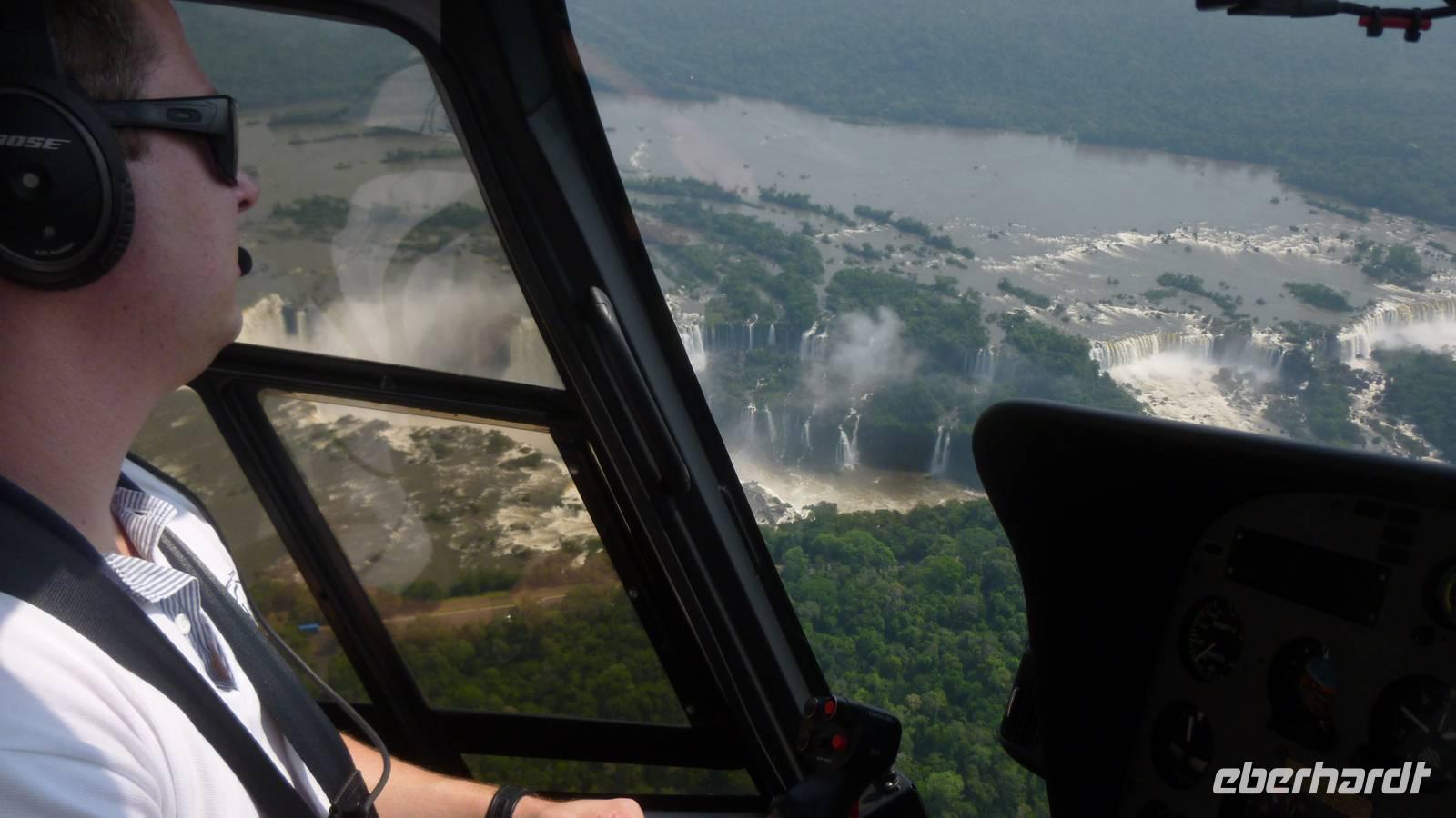 Wir spazieren den Fußweg entlang und folgen den Serpentinenkurven bis wir die große Plattform erreichen und die Wucht des Wassers nicht mehr zu übersehen und überhören ist. Regencapes kommen jetzt zum Einsatz, denn die Gicht ist nicht zu unterschätzen. Man glaubt, man ist noch in sicherer Entfernung, doch dann kommt eine kleine Windböe und man ist nass von unten bis oben. Mit Capes sind wir geschützt und trauen uns zur Plattform. Wie aufregend!! EINE MILLION Liter Wasser kommen hier pro SEKUNDE runter! Es ist unglaublich und wunderschön zugleich. Beim Blick nach unten zur nächsten Ebene der Kaskaden zeigt sich sogar ein toller Regenbogen. Unser Mittagessen ist auch schon organisiert mit einem weiteren leckeren Buffet. Jetzt noch in den Souvenirladen und eines der niedlichen Nasenbären-Plüschtiere kaufen und dann geht es weiter zum Vogelpark. Für ein paar von uns steigt vorher jedoch noch einmal die Aufregung. Ein Helikopterflug muss unbedingt noch gemacht werden! Es geht ganz schnell, da sind wir auch schon in der Luft und fliegen über die riesige Fläche des Regelwaldes in Richtung Wasserfälle. Von hier oben kann man die 2,7km langen Fälle erst richtig begreifen. Es ist atemberaubend. Der Flug stellt sich auch noch als kleiner Nervenkitzel heraus: Unser Pilot kennt kein Erbarmen und lenkt den Helikopter wie bei einer Achterbahnfahrt. Unser Lachen und Geschrei hört er wahrscheinlich durch den Gehörschutz nicht.