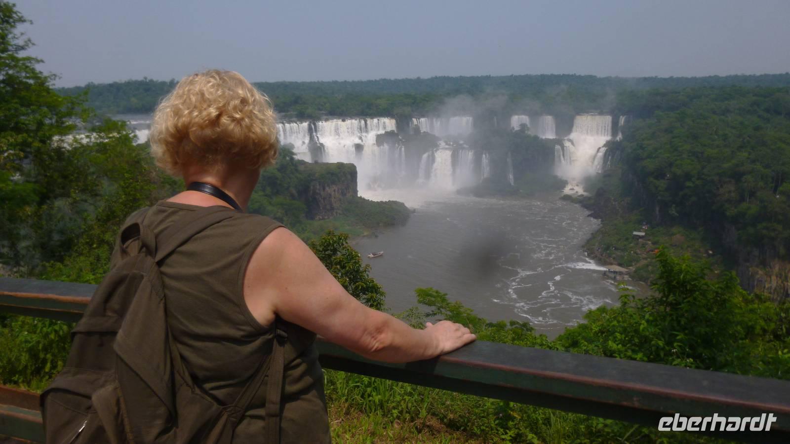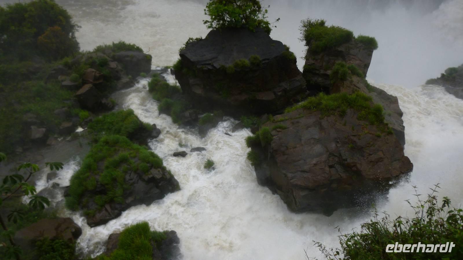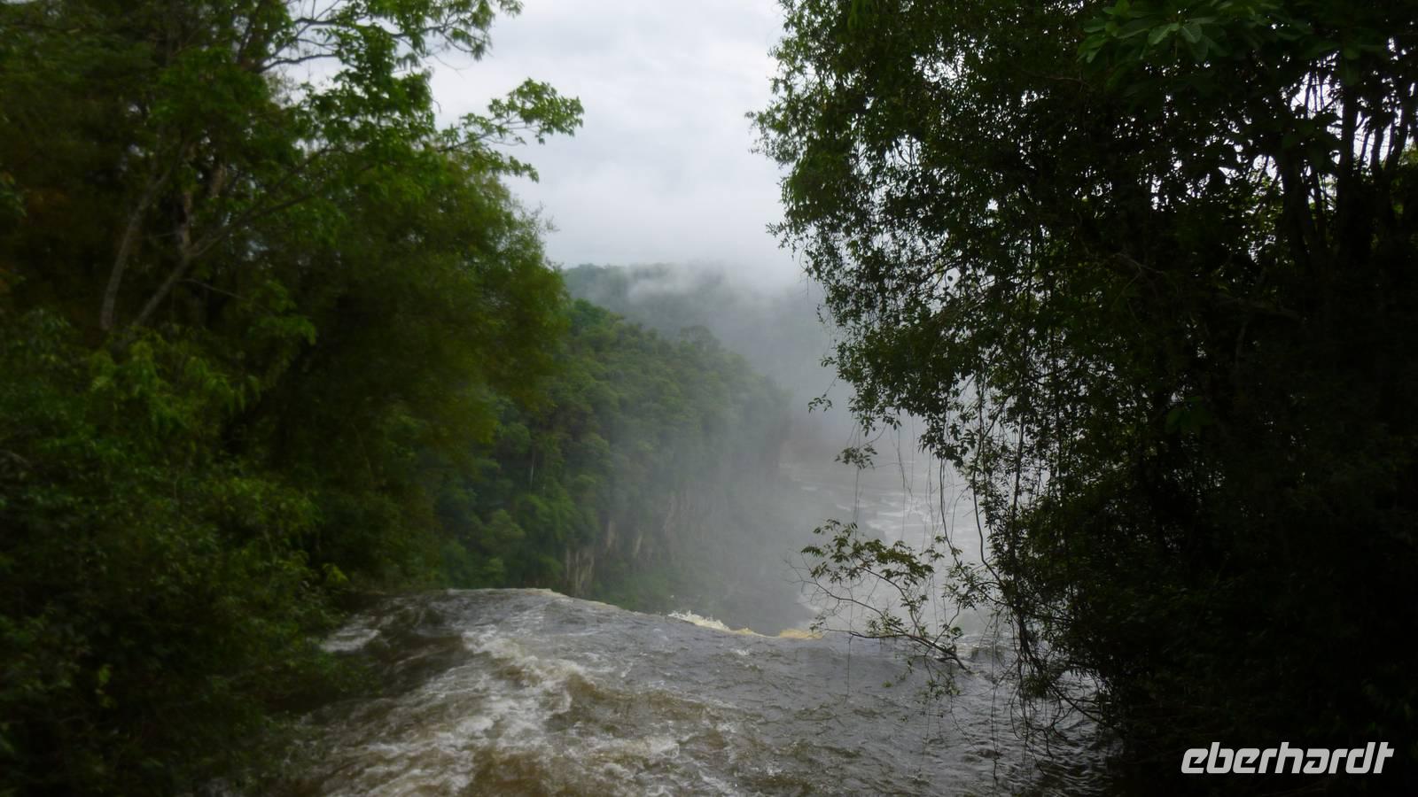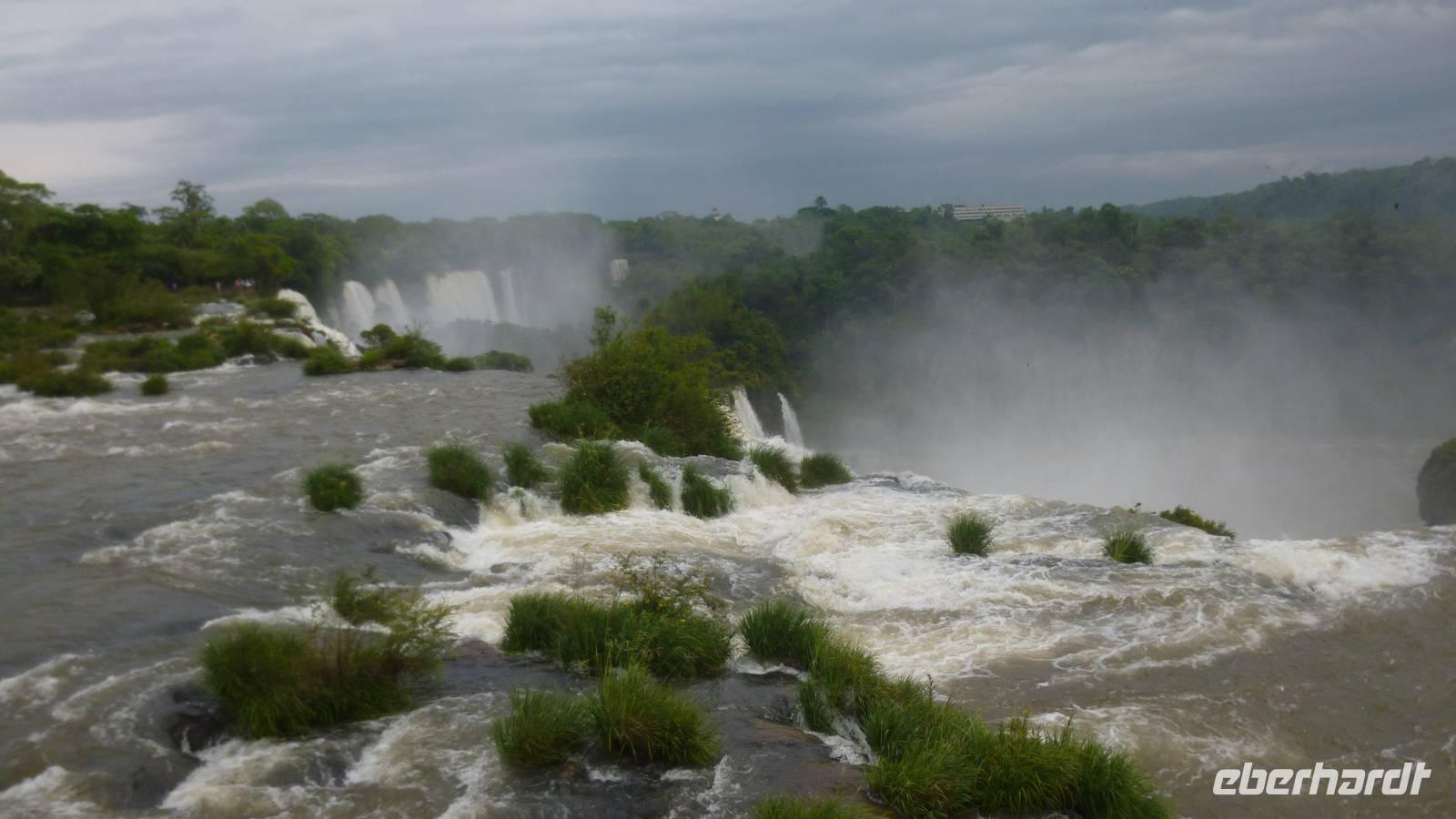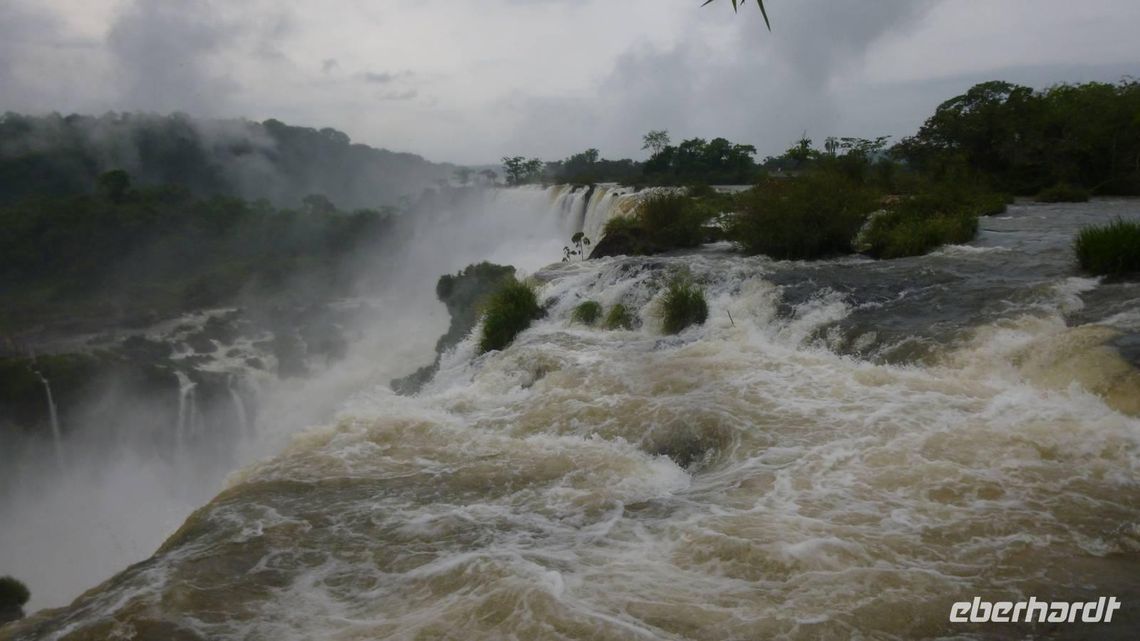 Der Fußmarsch wird heute um einiges länger. Zunächst laufen wir oberhalb der Wasserfälle und können beobachten, wie die Wassermassen sich in die Tiefe stürzen. Die zwei Schwestern, Bossetti, Adam und Eva, bis hin zum beeindruckenden San Martin - jeder der Wasserfälle trägt einen Namen. Die Zahl der Fälle variiert jedoch, je nach Niederschlagsmenge. Nelinho, unser Reiseleiter, erzählt uns von der letzten großen Dürre vor 3 Jahren. Man konnte in diesem Jahr sogar die große Insel San Martin zu Fuß erreichen, was heute nur mit einem Boot möglich ist. Das andere Extrem war das Hochwasser letztes Jahr, bei dem 36 mal so viel Wasser floss.