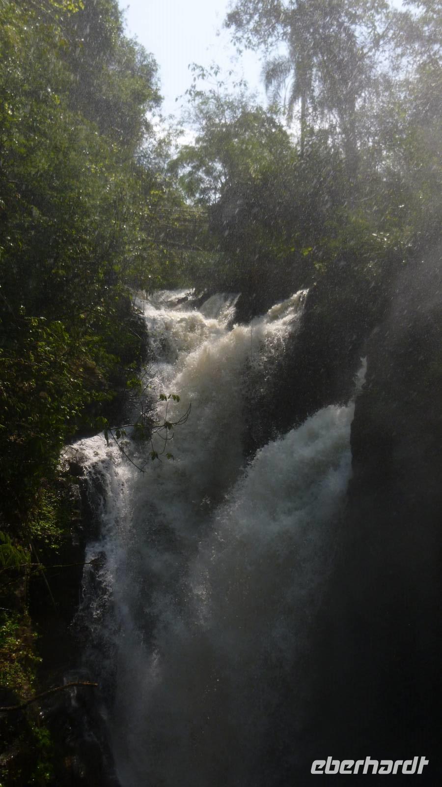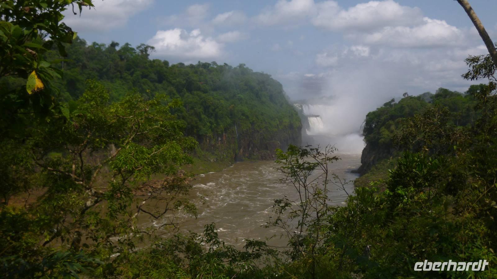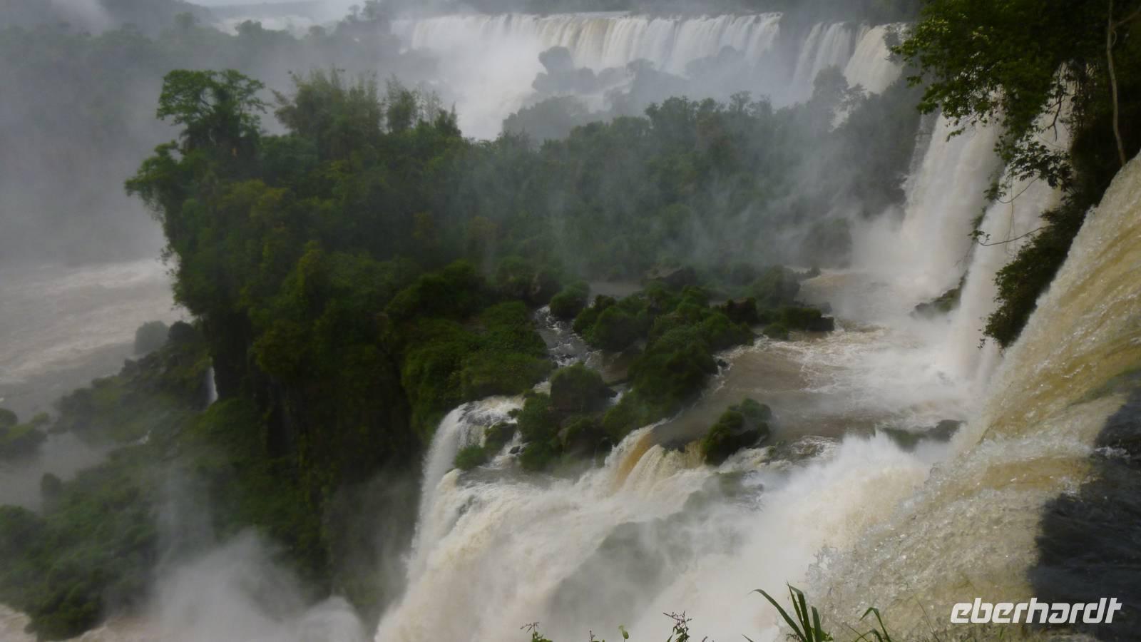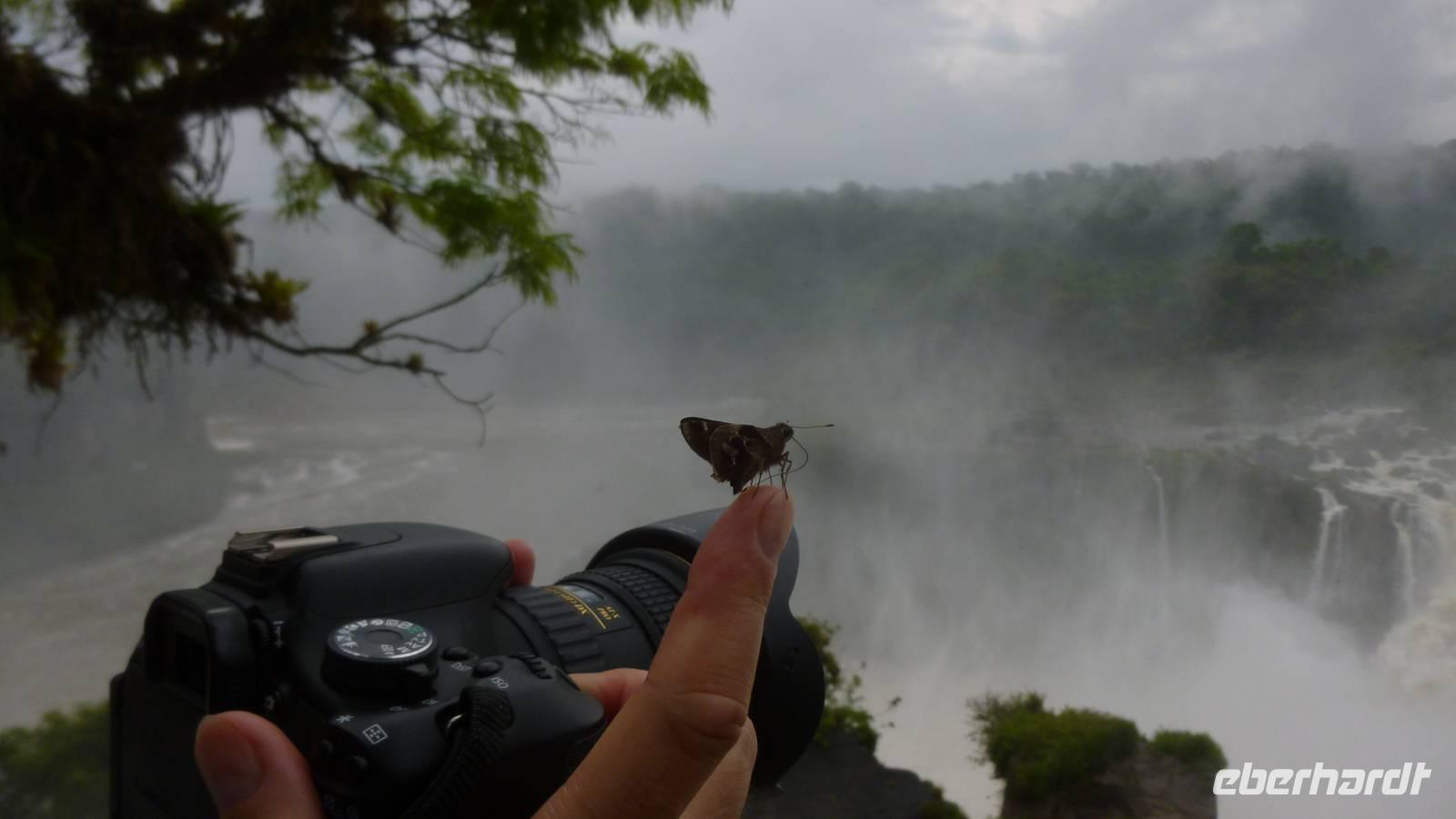 Der Fußmarsch wird heute um einiges länger. Zunächst laufen wir oberhalb der Wasserfälle und können beobachten, wie die Wassermassen sich in die Tiefe stürzen. Die zwei Schwestern, Bossetti, Adam und Eva, bis hin zum beeindruckenden San Martin - jeder der Wasserfälle trägt einen Namen. Die Zahl der Fälle variiert jedoch, je nach Niederschlagsmenge. Nelinho, unser Reiseleiter, erzählt uns von der letzten großen Dürre vor 3 Jahren. Man konnte in diesem Jahr sogar die große Insel San Martin zu Fuß erreichen, was heute nur mit einem Boot möglich ist. Das andere Extrem war das Hochwasser letztes Jahr, bei dem 36 mal so viel Wasser floss.