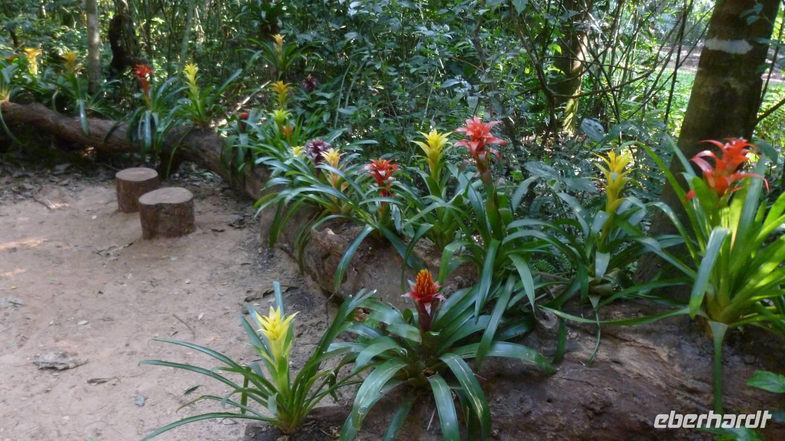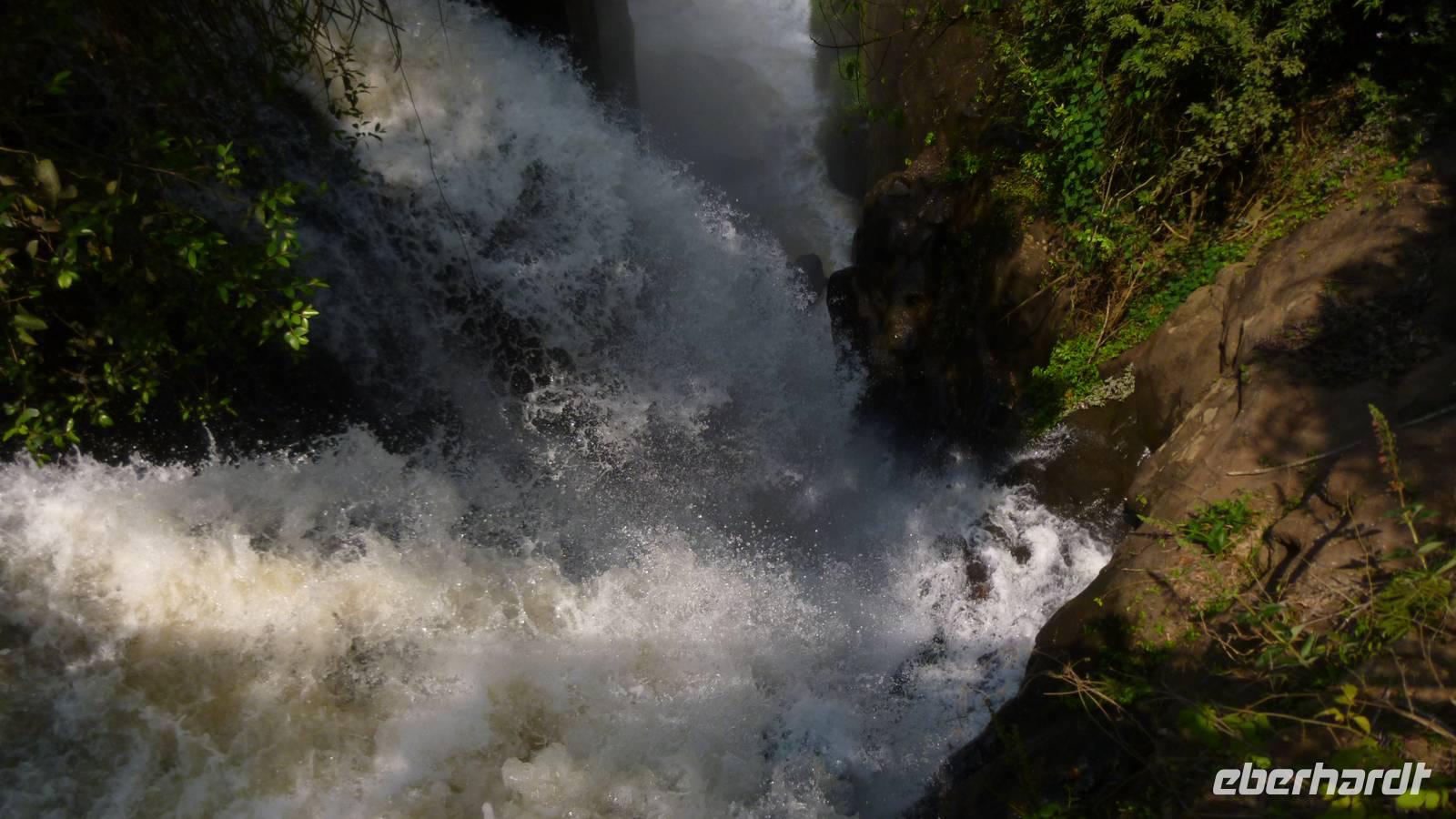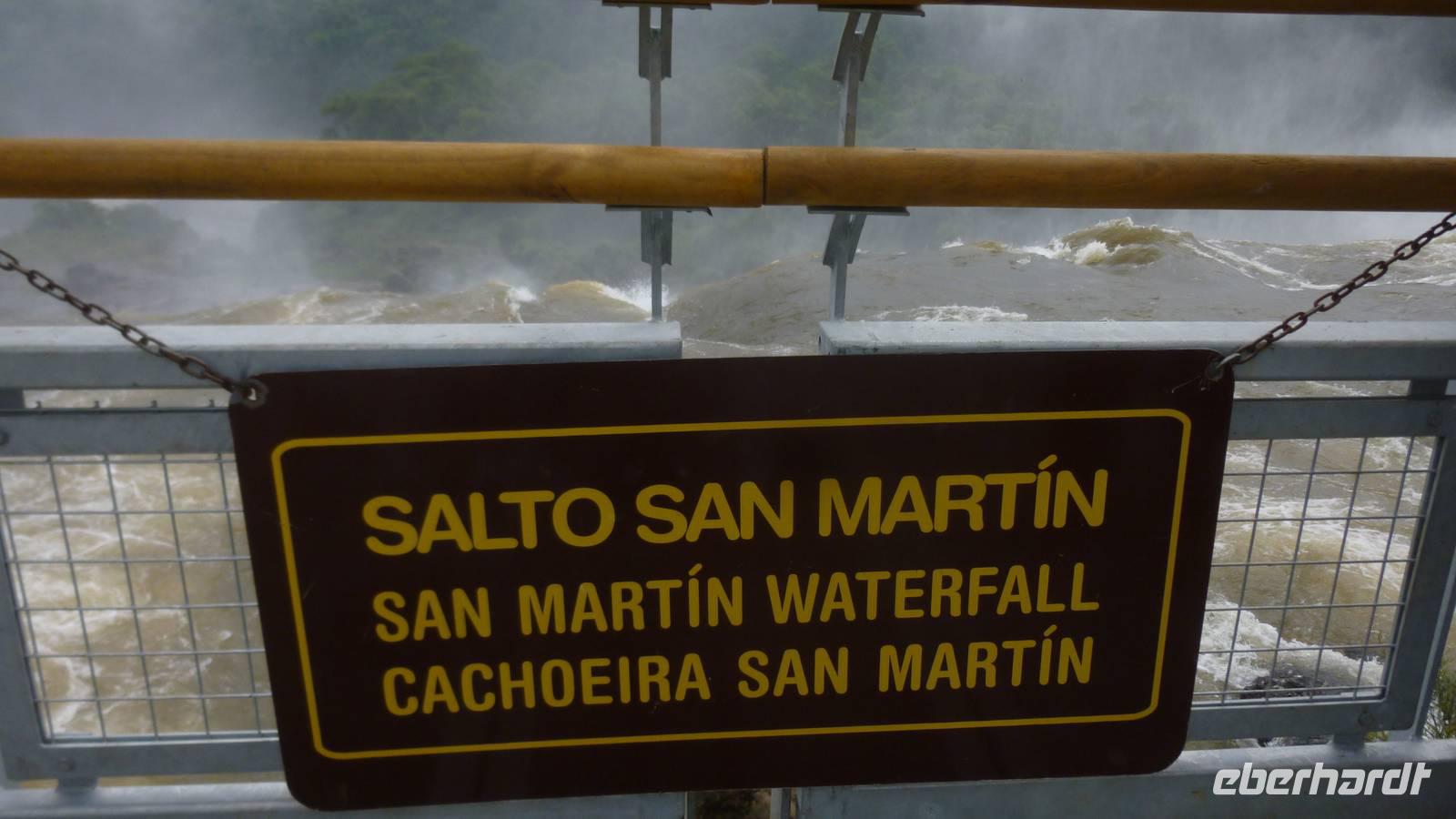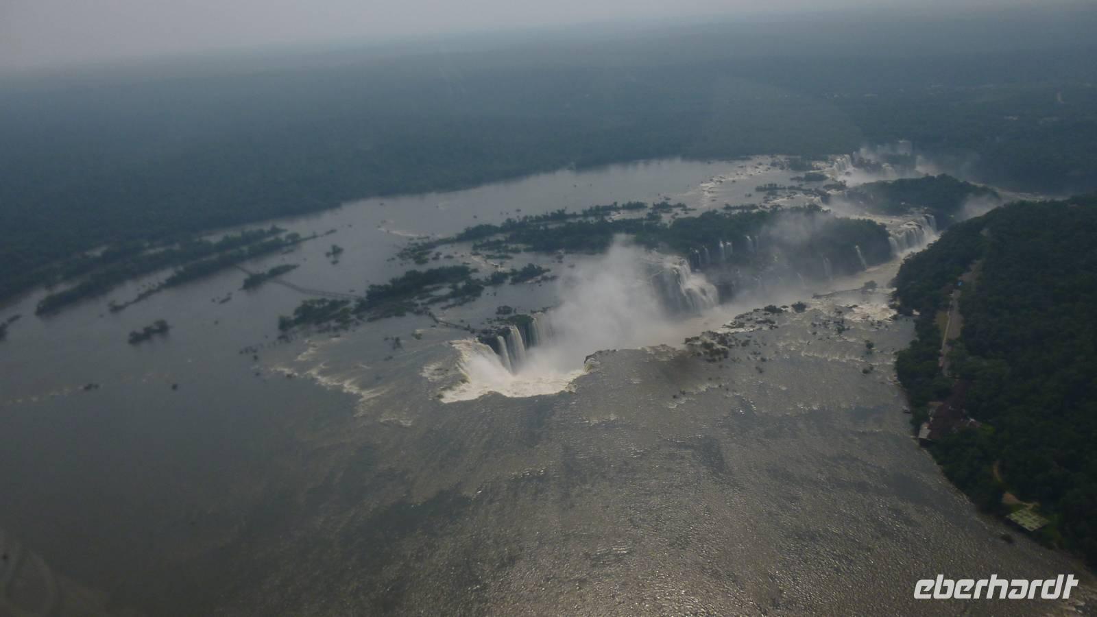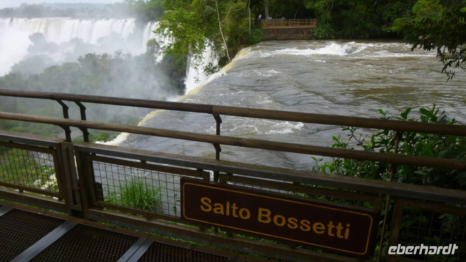 Der Fußmarsch wird heute um einiges länger. Zunächst laufen wir oberhalb der Wasserfälle und können beobachten, wie die Wassermassen sich in die Tiefe stürzen. Die zwei Schwestern, Bossetti, Adam und Eva, bis hin zum beeindruckenden San Martin - jeder der Wasserfälle trägt einen Namen. Die Zahl der Fälle variiert jedoch, je nach Niederschlagsmenge. Nelinho, unser Reiseleiter, erzählt uns von der letzten großen Dürre vor 3 Jahren. Man konnte in diesem Jahr sogar die große Insel San Martin zu Fuß erreichen, was heute nur mit einem Boot möglich ist. Das andere Extrem war das Hochwasser letztes Jahr, bei dem 36 mal so viel Wasser floss.