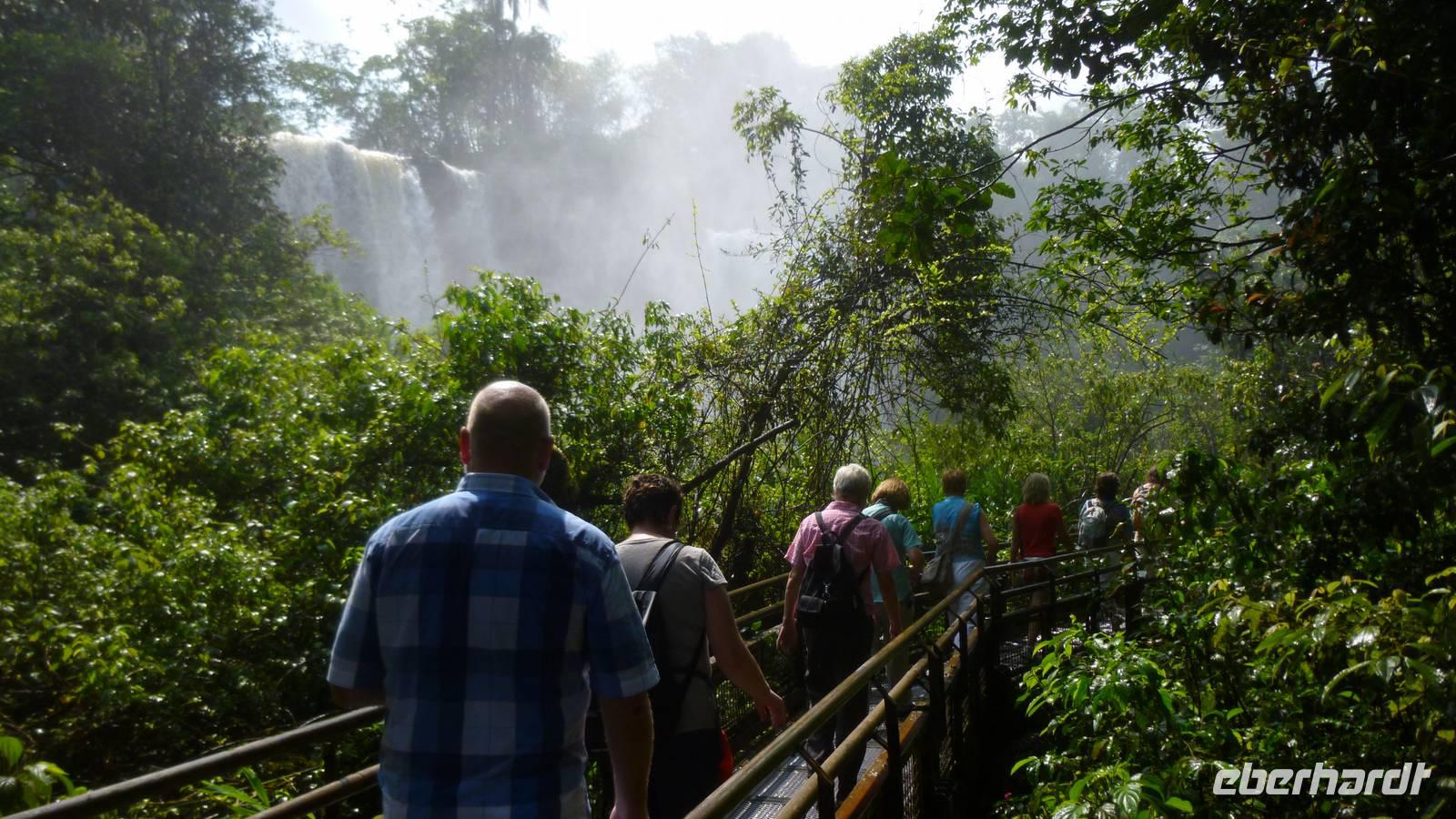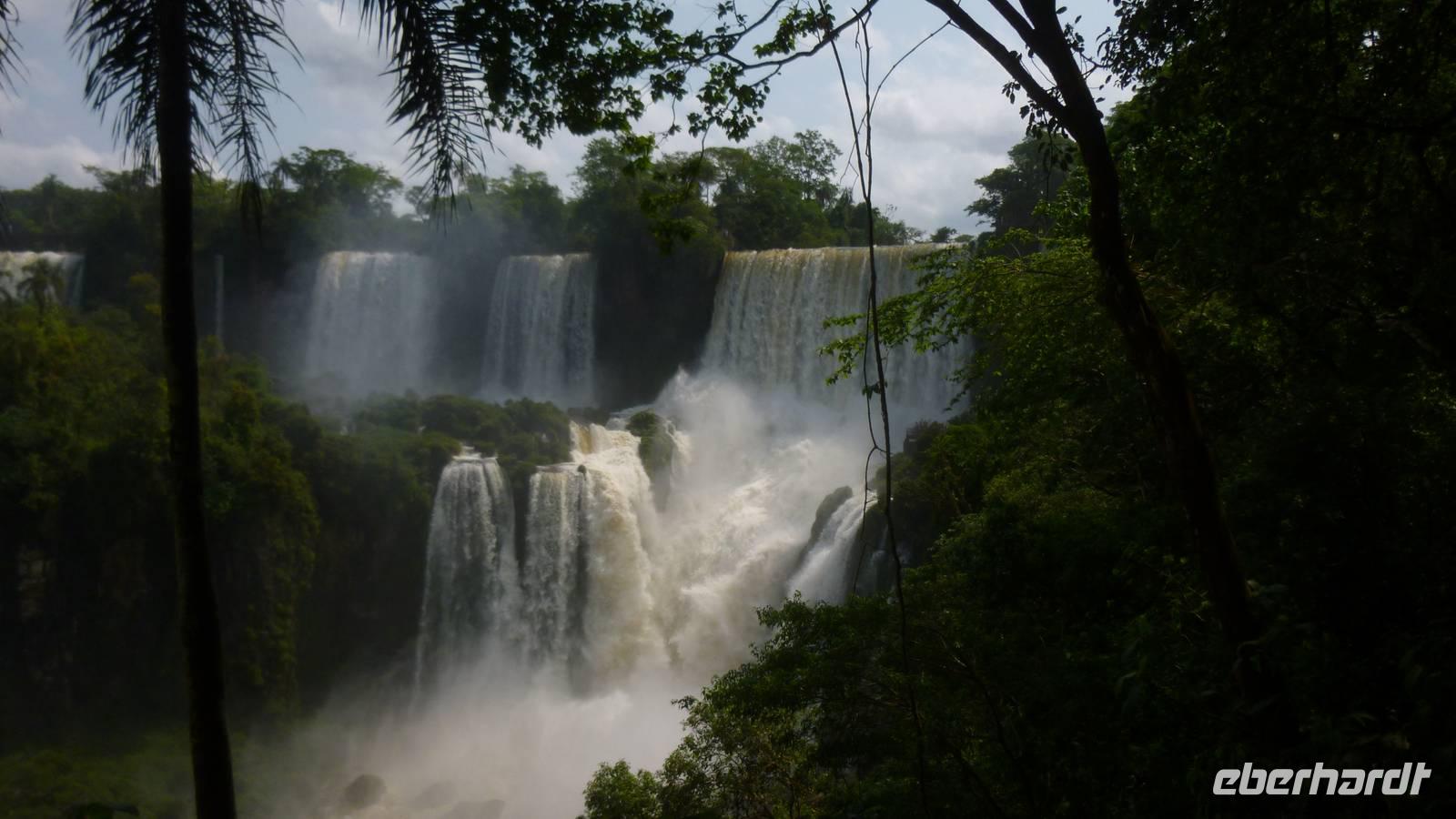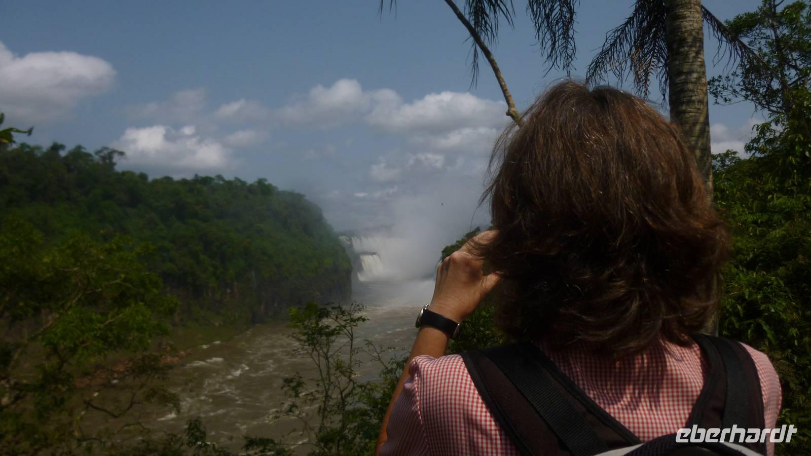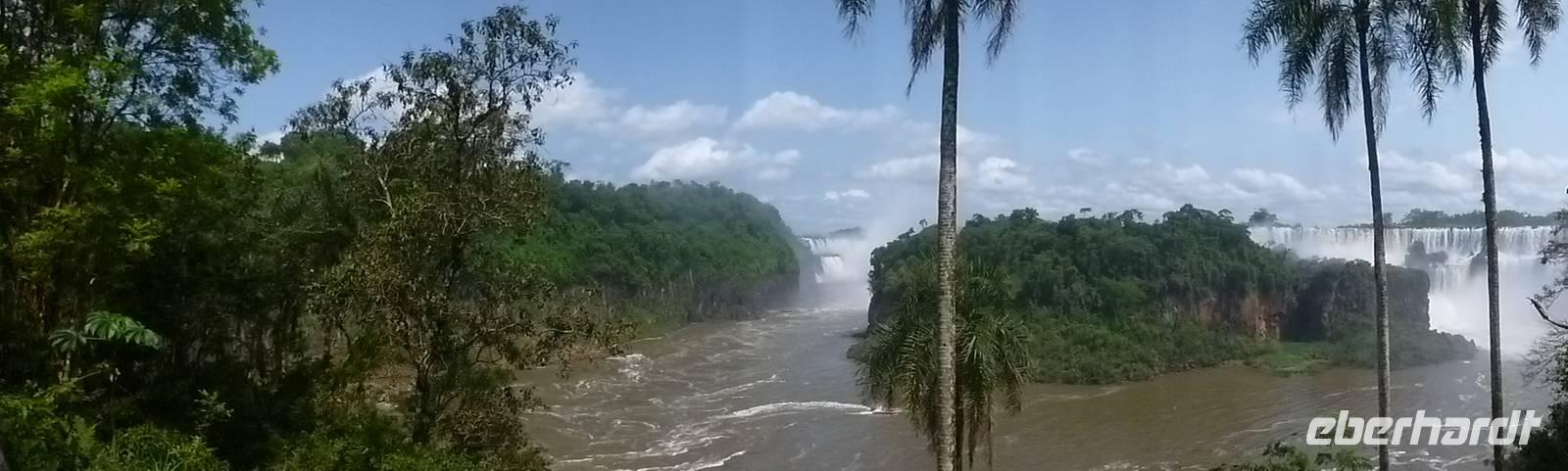 Unsere letzte Etappe für heute ist ein weiterer Wanderweg zu einem der schönsten Panoramablicke, die die Iguazu Wasserfälle zu bieten haben. So stellen wir uns das Paradies vor: herrliche Wasserfälle, Palmen, Kaiserwetter. Es kann kaum noch schöner werden.