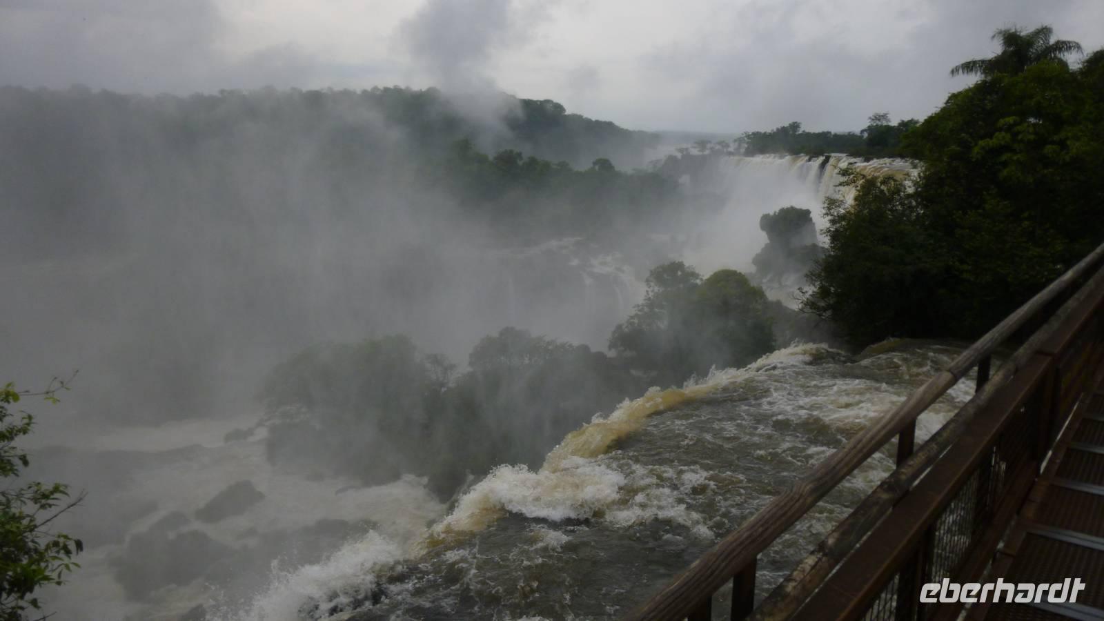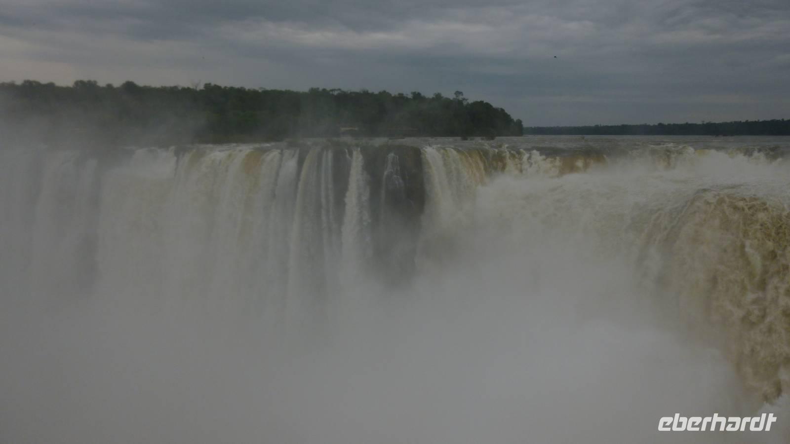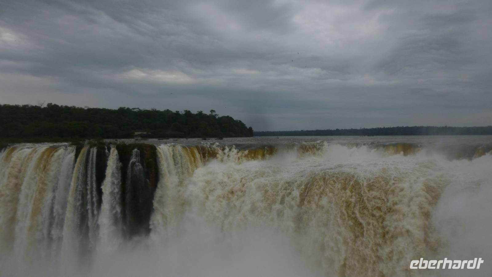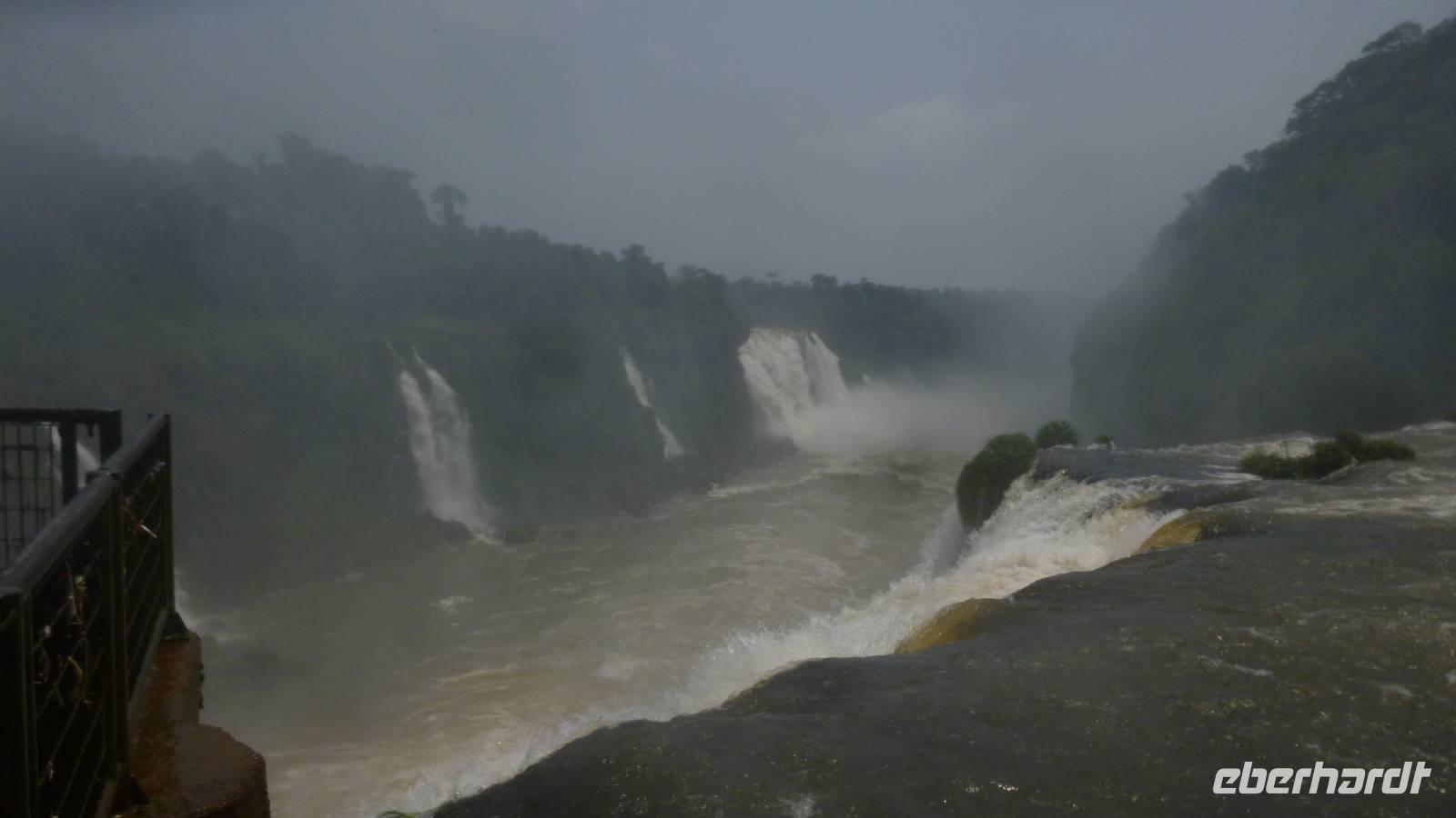 Als nächstes wagen wir uns zur Teufelsschlucht. Jetzt heißt es wieder: Regencape anziehen! Man muss die Gicht und die Windrichtung gut beachten, wenn man ein Foto schießen möchte. Doch heute ist es relativ ruhig und man kann den riesigen Wasserfall beobachten ohne sofort klatschnass zu werden.