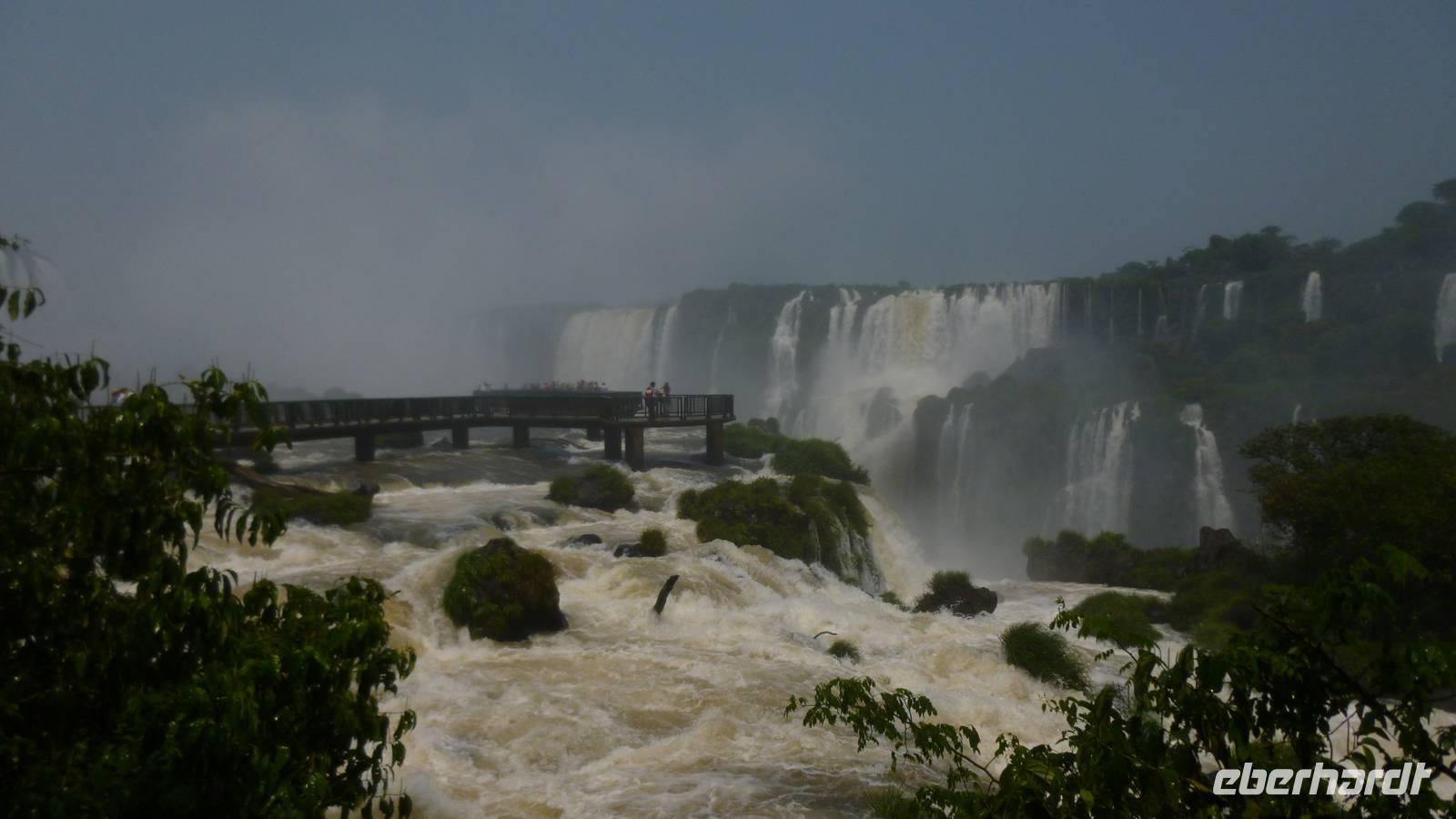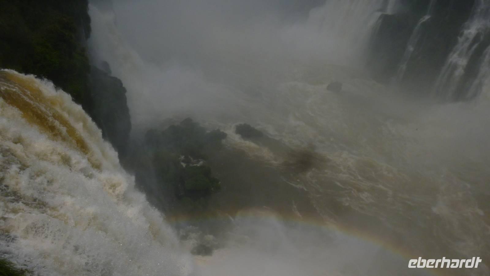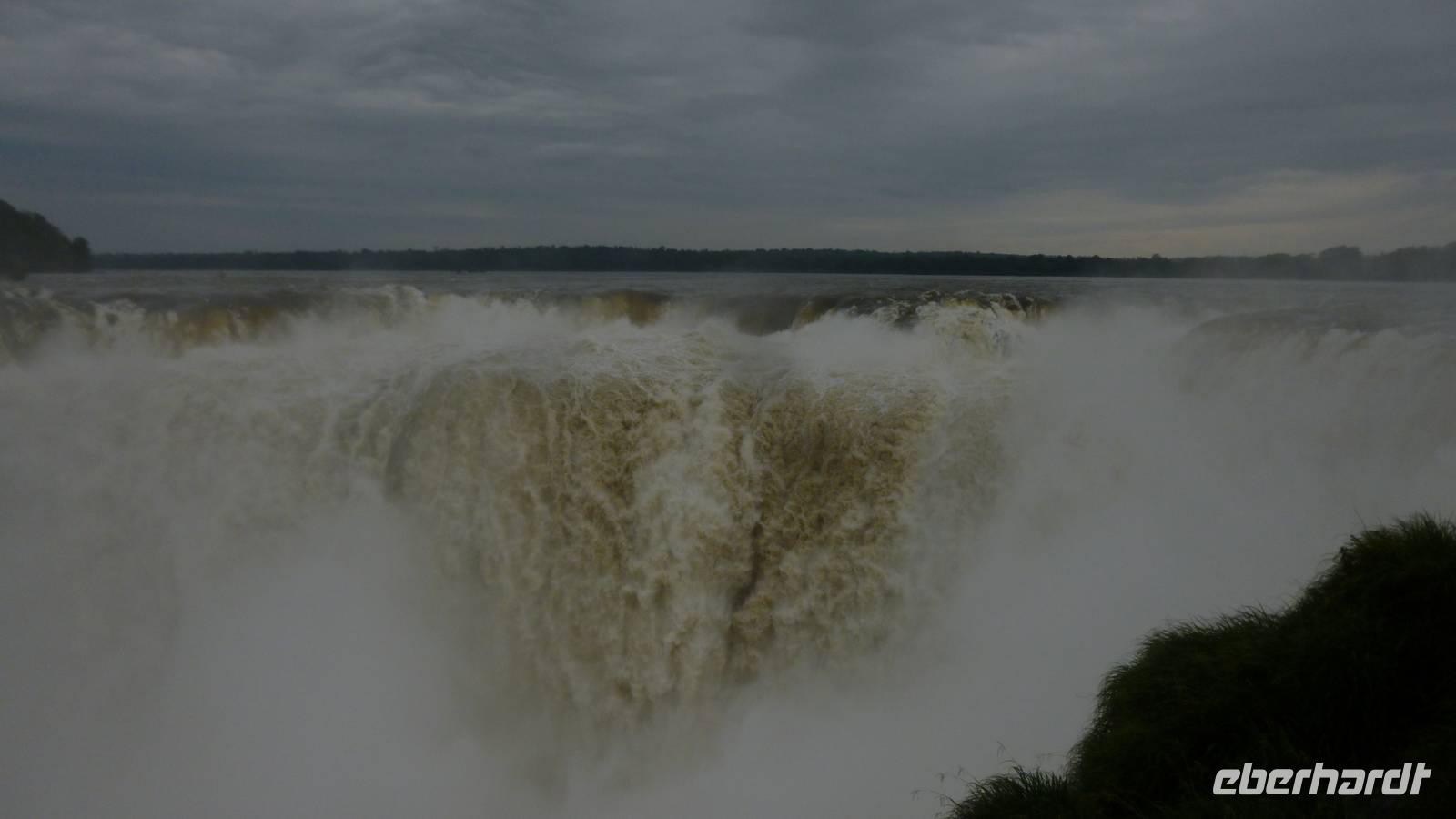 Als nächstes wagen wir uns zur Teufelsschlucht. Jetzt heißt es wieder: Regencape anziehen! Man muss die Gicht und die Windrichtung gut beachten, wenn man ein Foto schießen möchte. Doch heute ist es relativ ruhig und man kann den riesigen Wasserfall beobachten ohne sofort klatschnass zu werden.