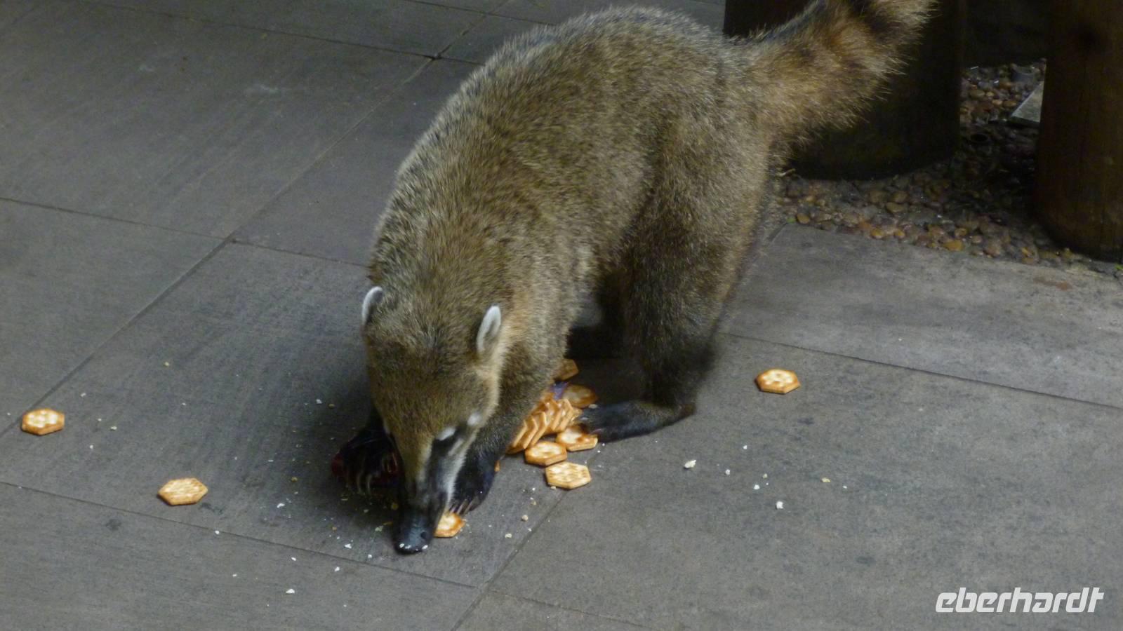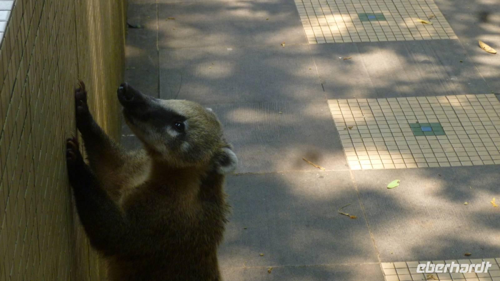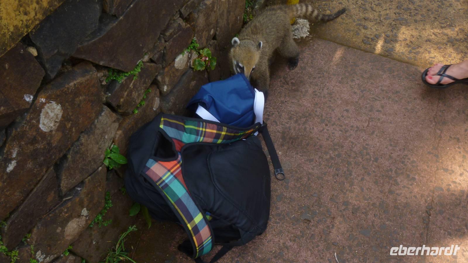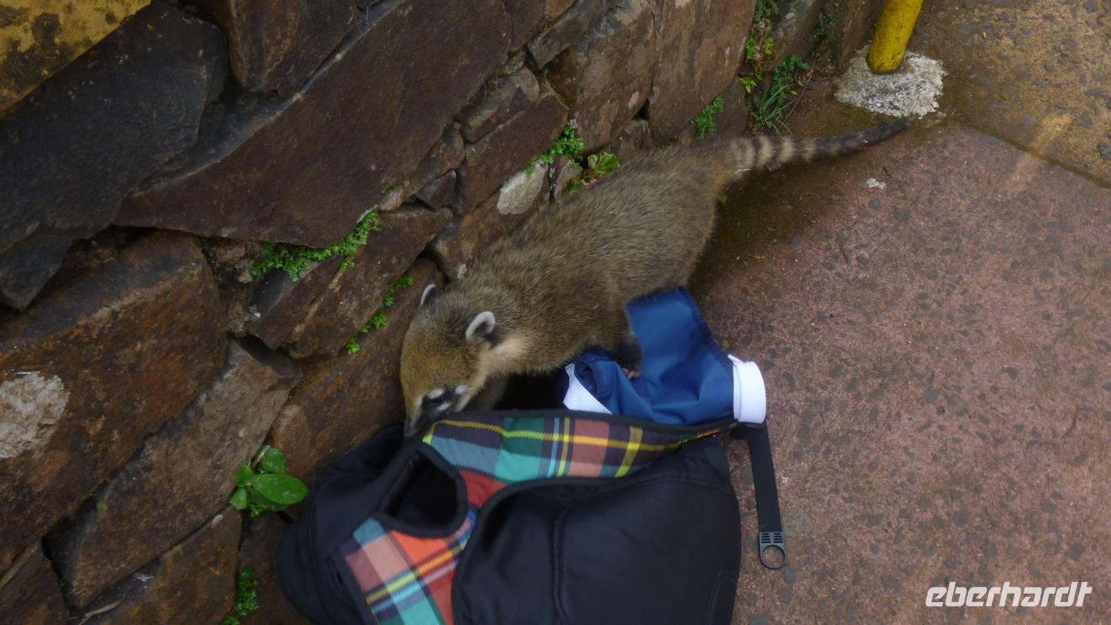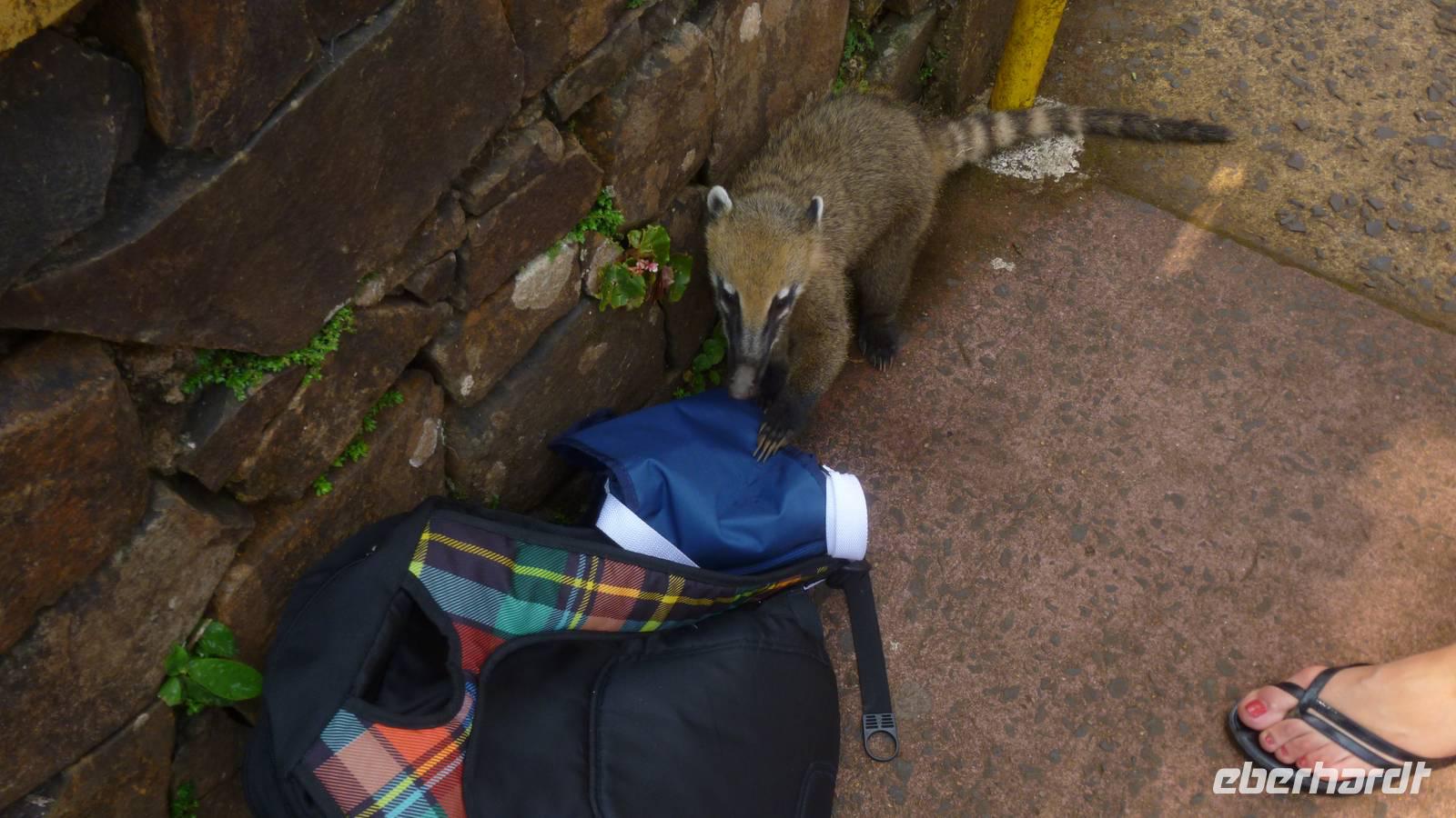 Einige von uns sind schon wieder zurück bei unserem ausgemachten Treffpunkt und beobachten die frechen Nasenbären, die auf der Suche nach einem leckeren Mittagessen sind. Imbiss-Restaurants sind dafür die perfekte Anlaufstelle, denn irgendjemand lässt bestimmt seinen Rucksack offen stehen mit einer Tüte Chips oder anderen Leckereien. Man sollte jedoch aufpassen, denn diese niedlichen Tiere können kratzen und beißen.
